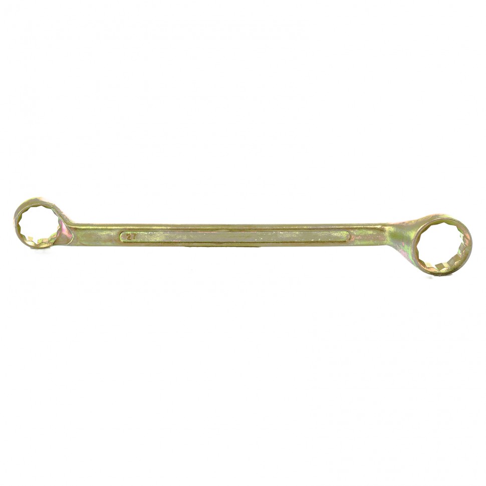 Накидной ключ Сибртех 14634 с покрытием из желтого цинка используется для монтажа и демонтажа резьбового крепежа с шестигранной головкой диаметром 24 и 27 мм. Пригодится для выполнения монтажных работ в гараже, на небольшом производстве и в быту. Кольцевой зев полностью захватывает шляпку крепежного элемента, поэтому ключом легко откручивать даже закисшие болты и гайки.ПреимуществаПрочность и долговечность — инструмент изготовлен из высококачественной углеродистой стали 45, твердость рабочих частей составляет 42 HRC, что соответствует требованиям ГОСТ (41-46 HRC).Устойчивость к воздействию влаги — желтое цинковое покрытие защищает от образования коррозии.Надежный захват крепежа — 12-гранный профиль каждого кольцевого зева имеет увеличенную площадь соприкосновения с головкой болта или гайки, что минимизирует риск повреждения ее граней.Продуманная конструкция — рабочие части смещены относительно плоскости рукоятки, что делает удобной работу в труднодоступных местах.