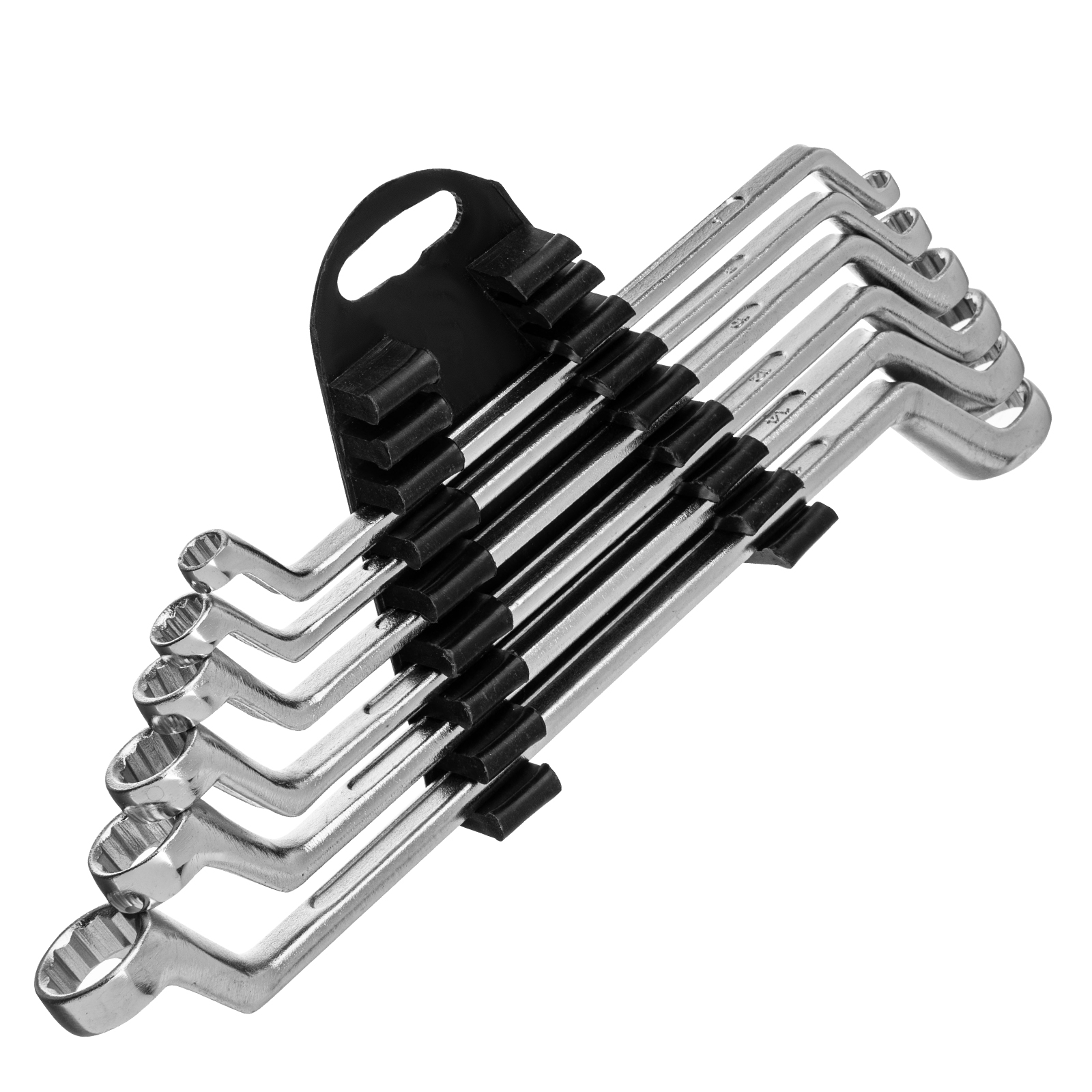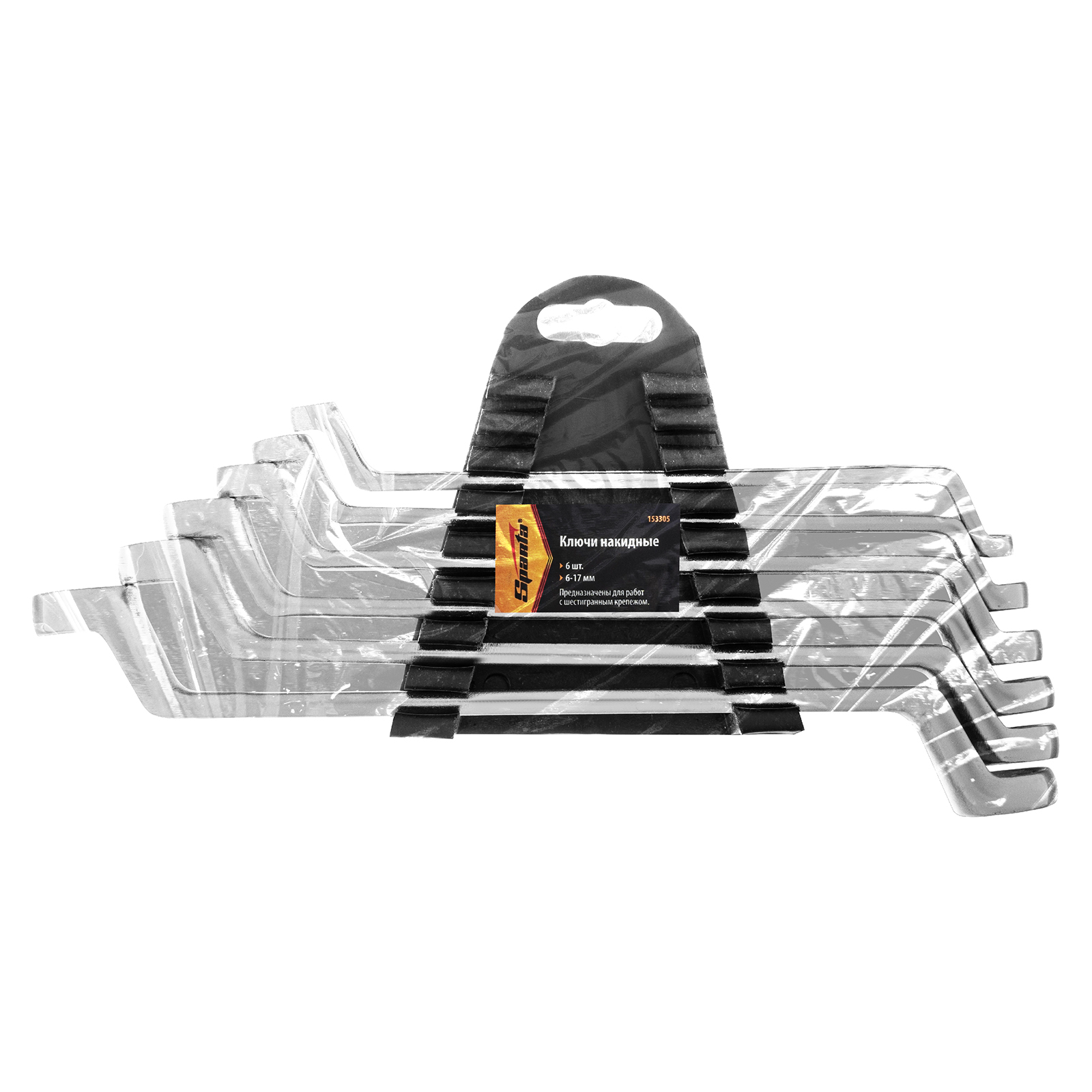 Набор из 6 накидных хромированных ключей Sparta 153305 используется для монтажа и демонтажа резьбового крепежа с шестигранной головкой диаметром 6-17 мм. Пригодится для выполнения монтажных работ в гараже, на небольшом производстве и в быту. Каждый кольцевой зев полностью захватывает шляпку крепежного элемента, поэтому ключами легко откручивать даже закисшие болты и гайки.ПреимуществаПрочность и долговечность — инструменты изготовлены из высококачественной углеродистой стали 45, твердость рабочих частей составляет 42 HRC, что соответствует требованиям ГОСТ (41-46 HRC).Устойчивость к воздействию влаги — хромовое покрытие защищает от образования коррозии.Надежный захват крепежа — 12-гранный профиль каждого кольцевого зева имеет увеличенную площадь соприкосновения с головкой болта или гайки, что минимизирует риск повреждения ее граней.Продуманная конструкция — рабочие части смещены относительно плоскости рукоятки, что делает удобной работу в труднодоступных местах.