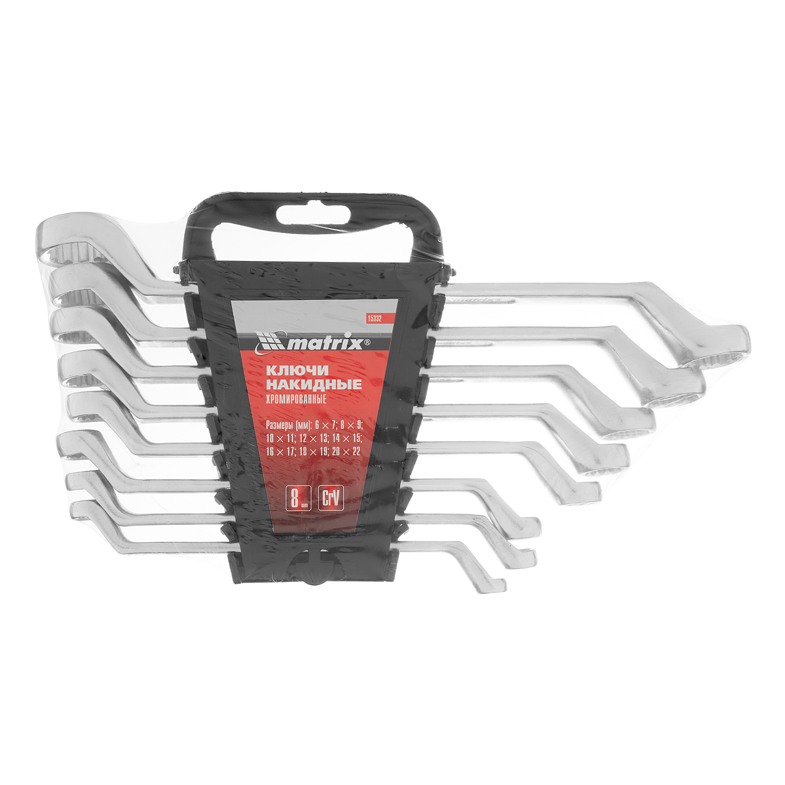 Набор из 8 накидных ключей Matrix 15332 из стали CR-V, с покрытием из полированного хрома, предназначен для монтажа и демонтажа крепежных элементов размером 6-22 мм. Накидные рабочие части с круглым профилем полностью охватывают головку крепежа и легко справляются даже с закисшими болтами и гайками. Благодаря изогнутой форме ключи удобны для работы в труднодоступных местах. Инструменты подходят для эксплуатации в бытовых условиях, автосервисе и частной мастерской.ПреимуществаВысокий ресурс — инструменты изготовлены из прочной хромованадиевой стали, твердость рабочих частей составляет 44 HRC.Коррозионная стойкость — полированное хромоникелевое покрытие защищает инструменты от воздействия влаги.Универсальность — в набор входит 8 двусторонних ключей для работы с крепежом разного размера.Удобный держатель — ключи не выпадут и не потеряются во время хранения и транспортировки.