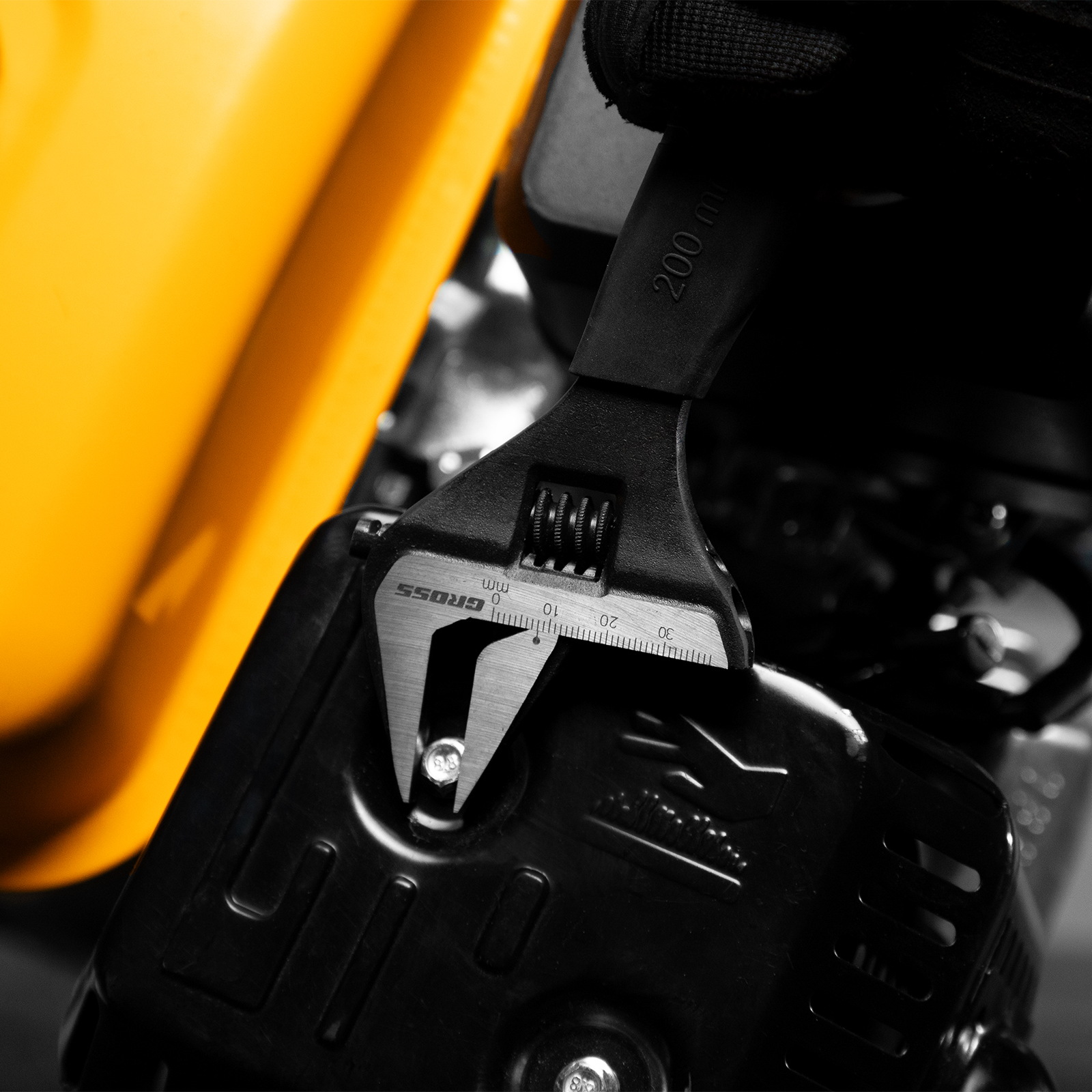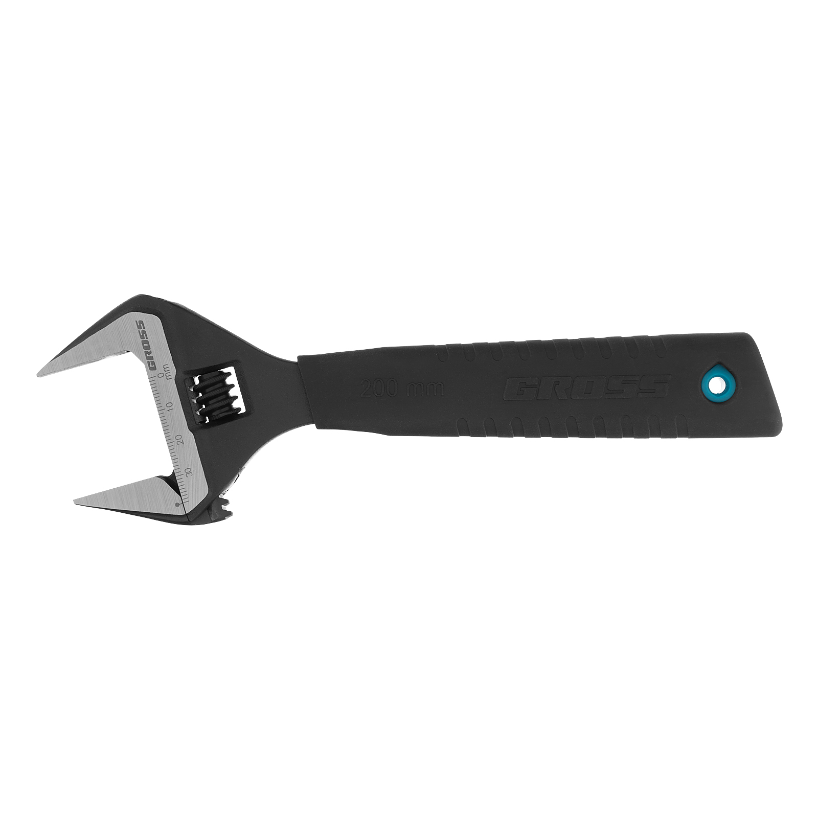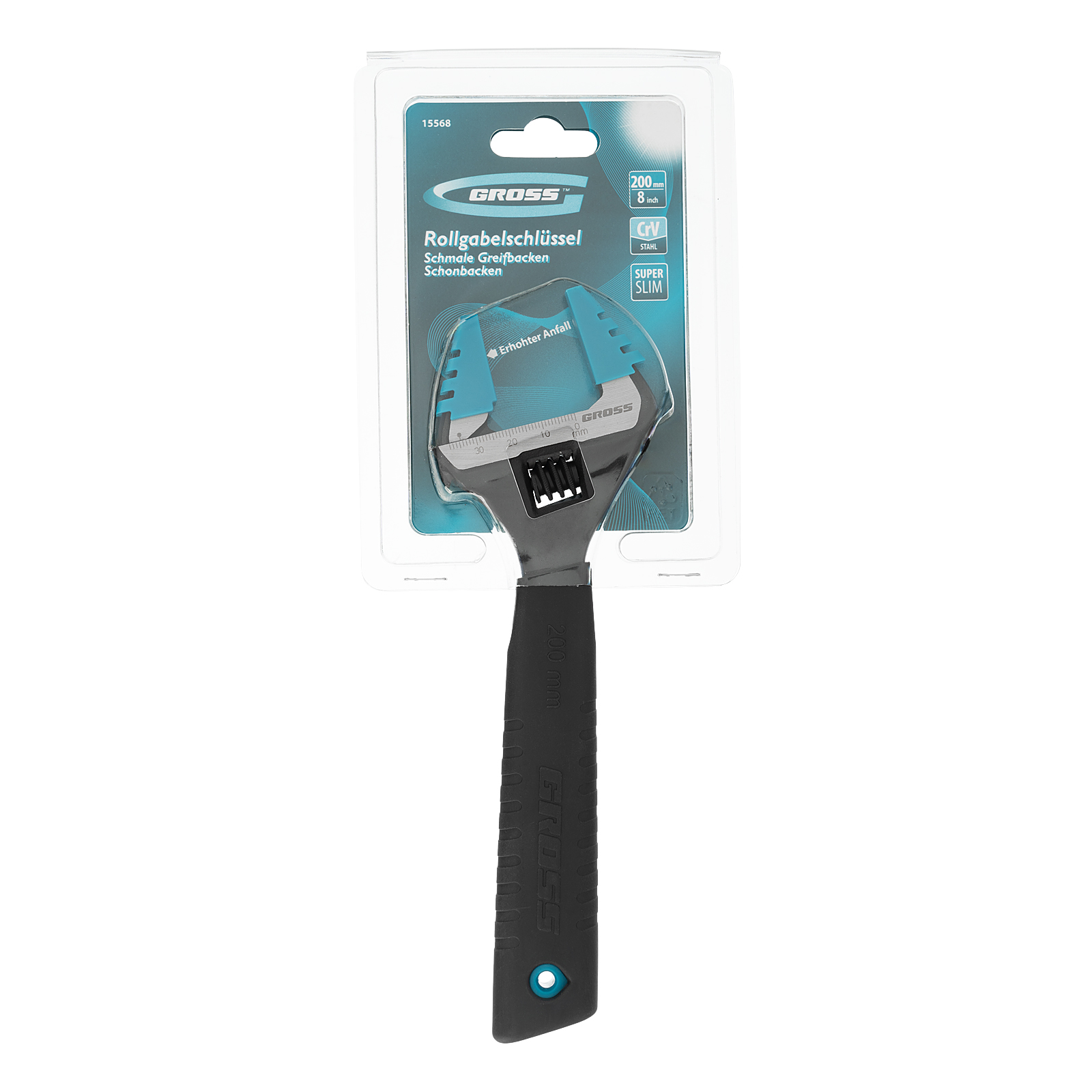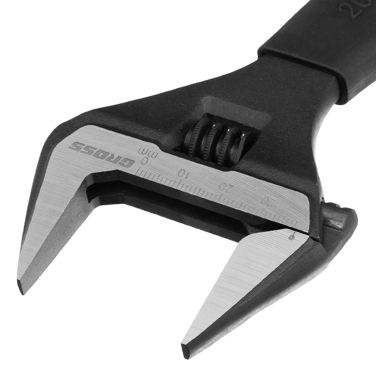 Разводной ключ Gross 15568 из стали CrV, длиной 200 мм, с тонкими губками и защитными насадками, обеспечивает ширину раскрытия губок на 30% больше, чем у стандартных моделей. Инструмент подходит для монтажа и демонтажа крепежных элементов диаметром до 40 мм. Применяется для сантехнических работ, ремонта автомобилей, решения бытовых задач. Тонкие губки легко проникают в труднодоступные места, а также удобны для захвата мелких деталей.ПреимуществаПрочность и долговечность — ключ изготовлен из высококачественной хромованадиевой стали, а фосфатное покрытие защищает его от коррозии.Защита губок — пластиковые насадки предотвращают повреждение хромированных поверхностей.Точная регулировка — метрическая линейка на ключе позволяет установить нужную величину раскрытия губок.Облегченный корпус — длительная работа с ключом не вызывает усталость.Комфортная работа — удобная рукоятка обеспечивает надежный хват и позволяет прикладывать больше усилий во время работы.Удобное хранение — в рукоятке предусмотрено отверстие для подвешивания.