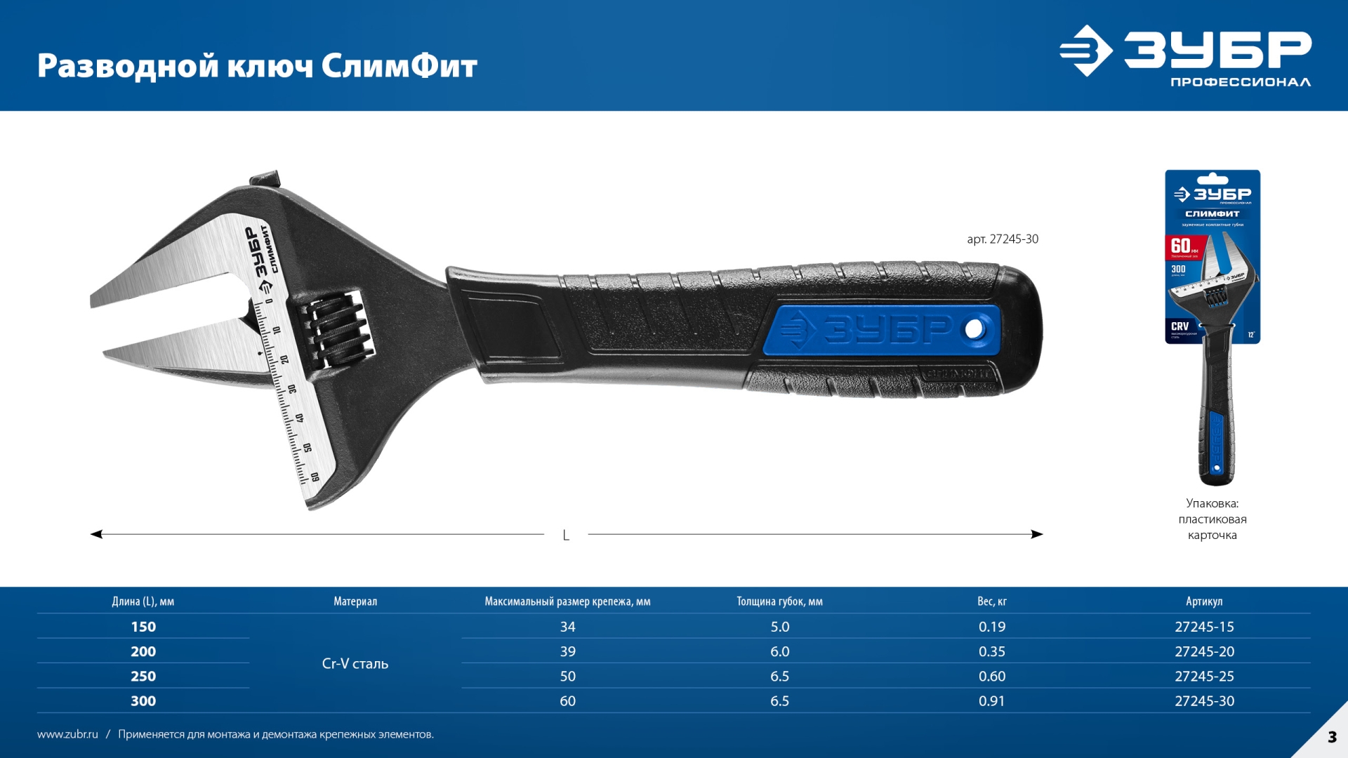 Ключи разводные ЗУБР ″СлимФит″ изготовлены из высокопрочной легированной стали CR-V, защищены от коррозии благодаря фосфатированному покрытию. Обладают повышенным ресурсом и обеспечивают длительную и качественную работу по монтажу и демонтажу резьбовых соединений.