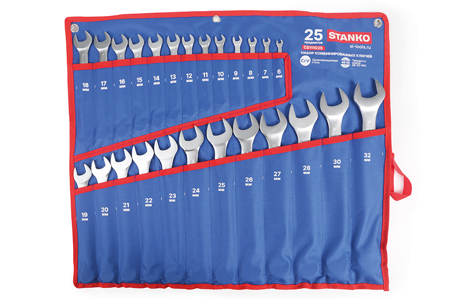 Набор включает в себя комбинированные ключи:6 мм, 7 мм, 8 мм, 9 мм, 10 мм, 11 мм, 12мм, 13мм, 14 мм, 15 мм, 16 мм, 17 мм, 18 мм, 19 мм, 20 мм. 21 мм, 22 мм, 23 мм. 24 мм, 25 мм, 26 мм, 27 мм, 28 мм, 30 мм, 32 мм.