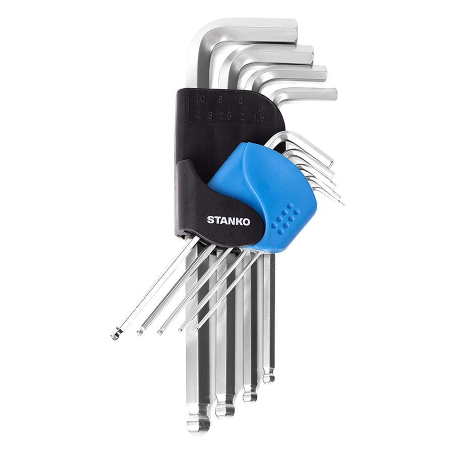 Набор угловых шестигранных ключей, состоит из 9 L-образных ключей, имеющих профиль HEX.