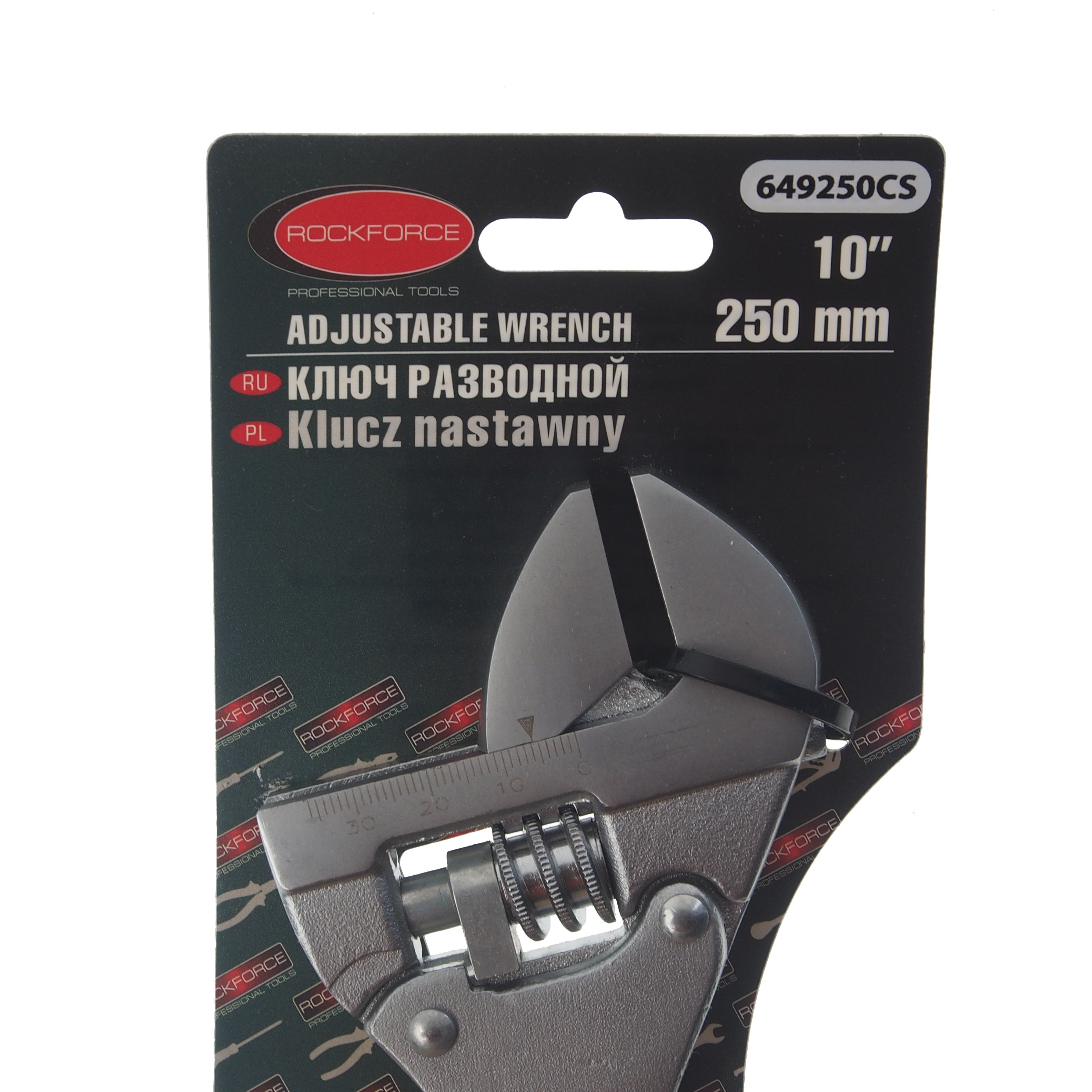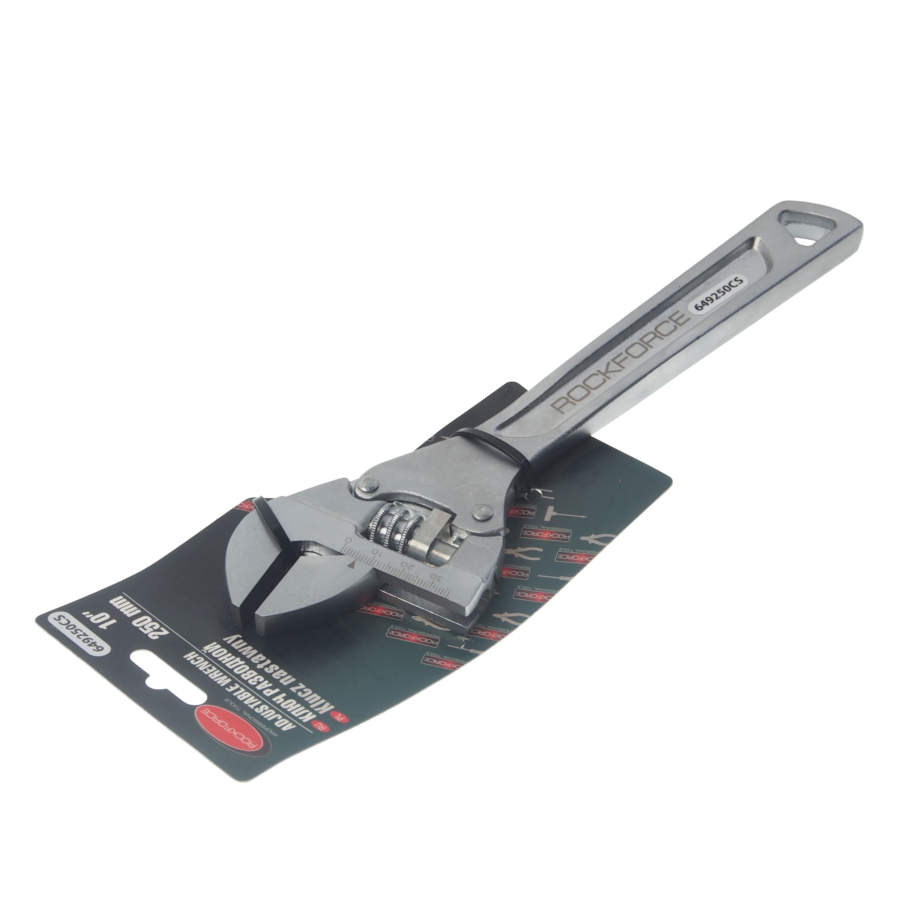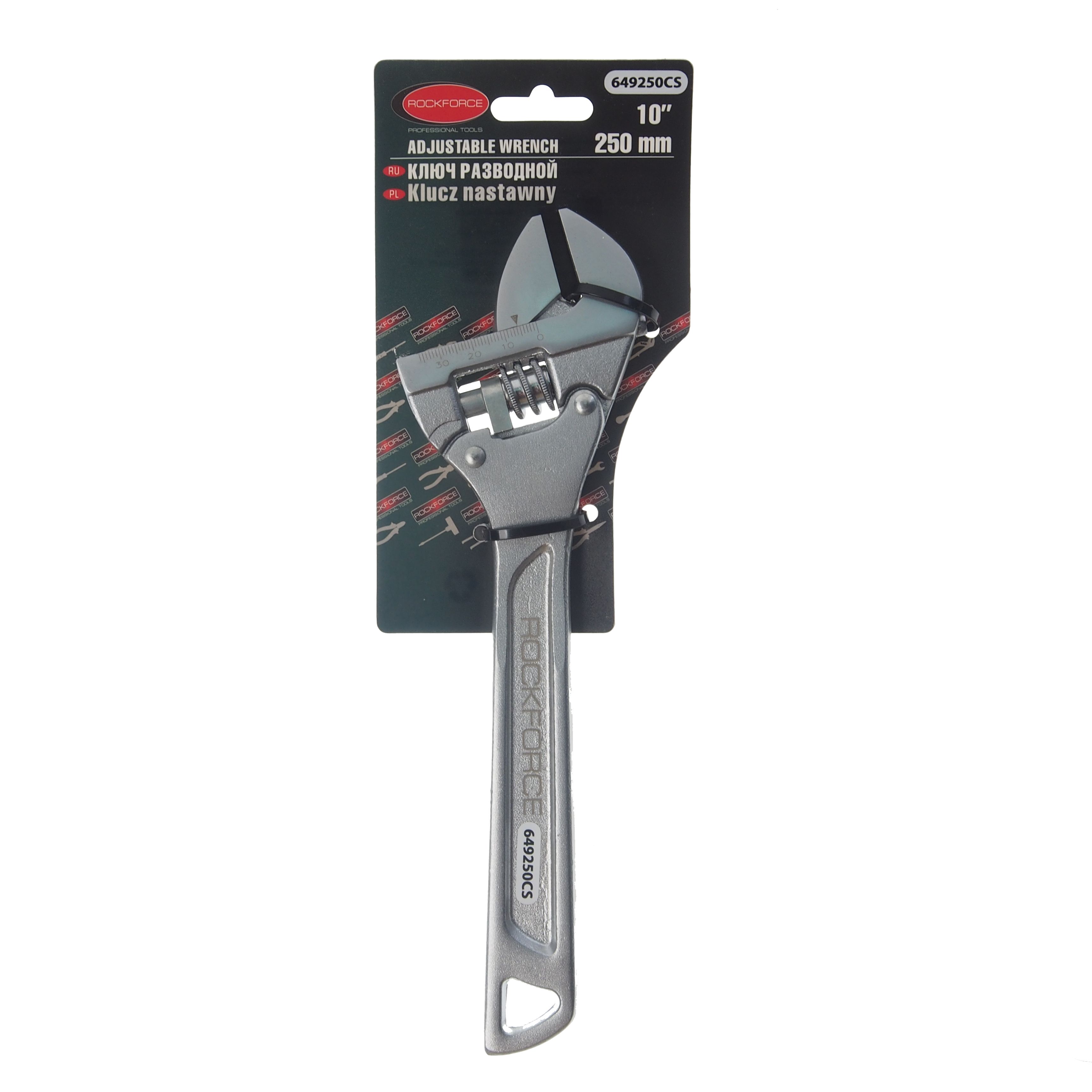 Ключ RockForce разводной с шарнирным механизмом для быстрого подбора размера захвата 10"-250мм(захват 0-36мм), на блистере может заменить собой, несколько гаечных и рожковых ключей разного размера. Имеется рельефная рукоятка, которая исключает скольжения инструмента при работе. Имеет оптимальную длину, тем самым позволяя вращать ключ с большой силой.