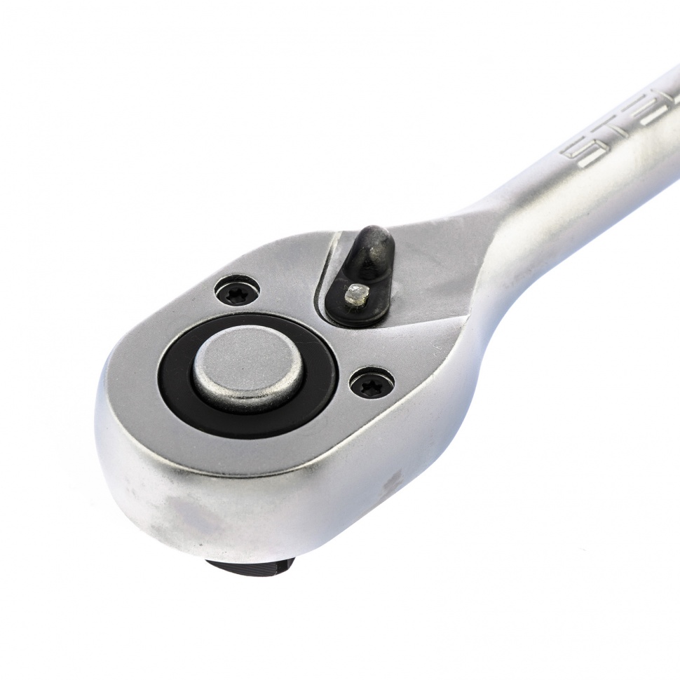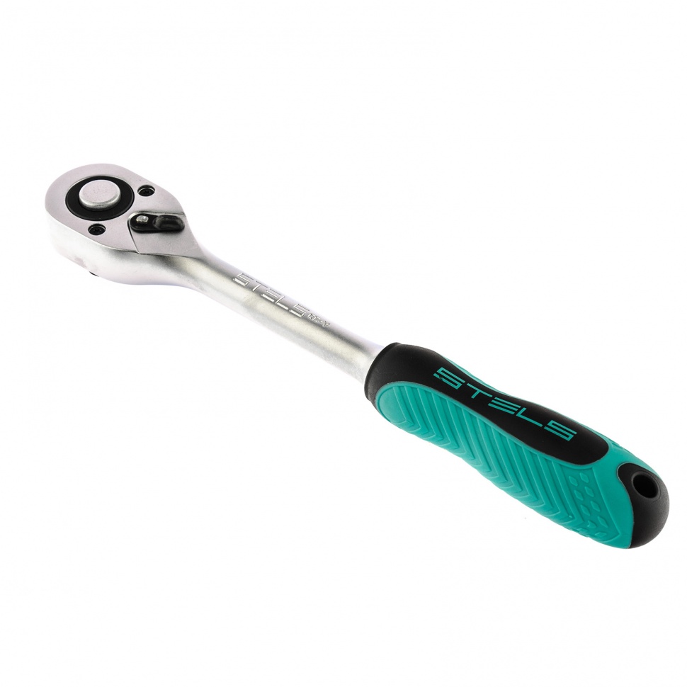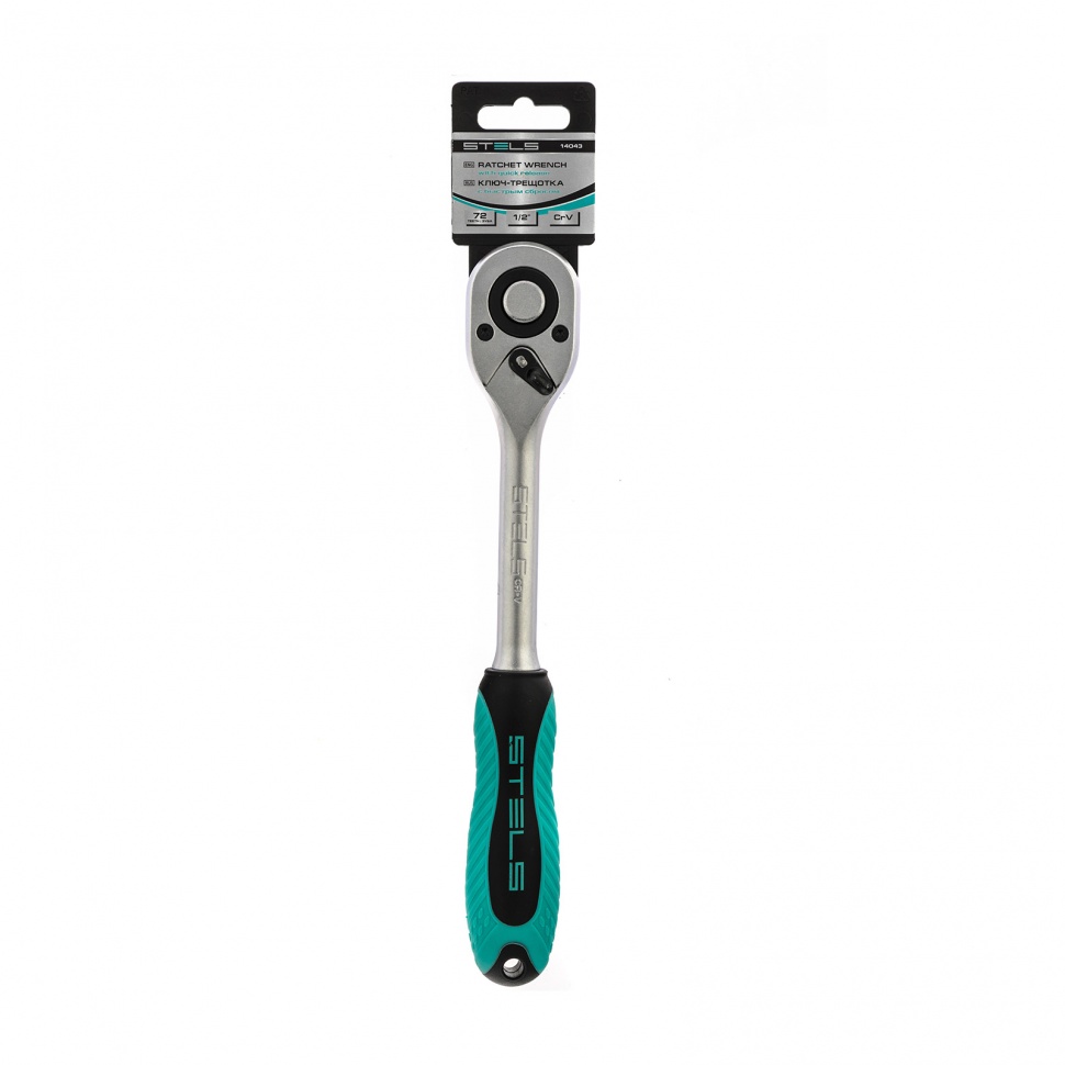 Ключ-трещотка Stels 14043 из стали CrV, с присоединительным квадратом 1/2", 72 зубцами и быстрым сбросом, предназначен для работы с резьбовым крепежом. Совместим с торцевыми головками различных размеров, а также адаптерами и удлинителями. Инструмент работает мягко и плавно благодаря 72-зубому храповому механизму. Шаг трещотки составляет 5°, что облегчает работу в ограниченном пространстве. Инструмент будет полезен в сервисном центре, авторемонтной мастерской, а также пригодится дома, в гараже или на даче. Преимущества Устойчивость к нагрузкам — ключ изготовлен из высокопрочной хромованадиевой стали. Защита от коррозии — инструмент хромирован. Шариковый фиксатор — торцевые головки и другие насадки не соскакивают во время работы. Легкая замена насадок — конструкцией предусмотрен механизмом быстрого сброса. Реверс — флажковый переключатель позволяет мгновенно изменить направление вращения насадки. Удобная эксплуатация — двухкомпонентная рукоятка с рифленой поверхностью не выскальзывает из руки, а ее эргономичная форма способствует снижению усталости при длительной работе.