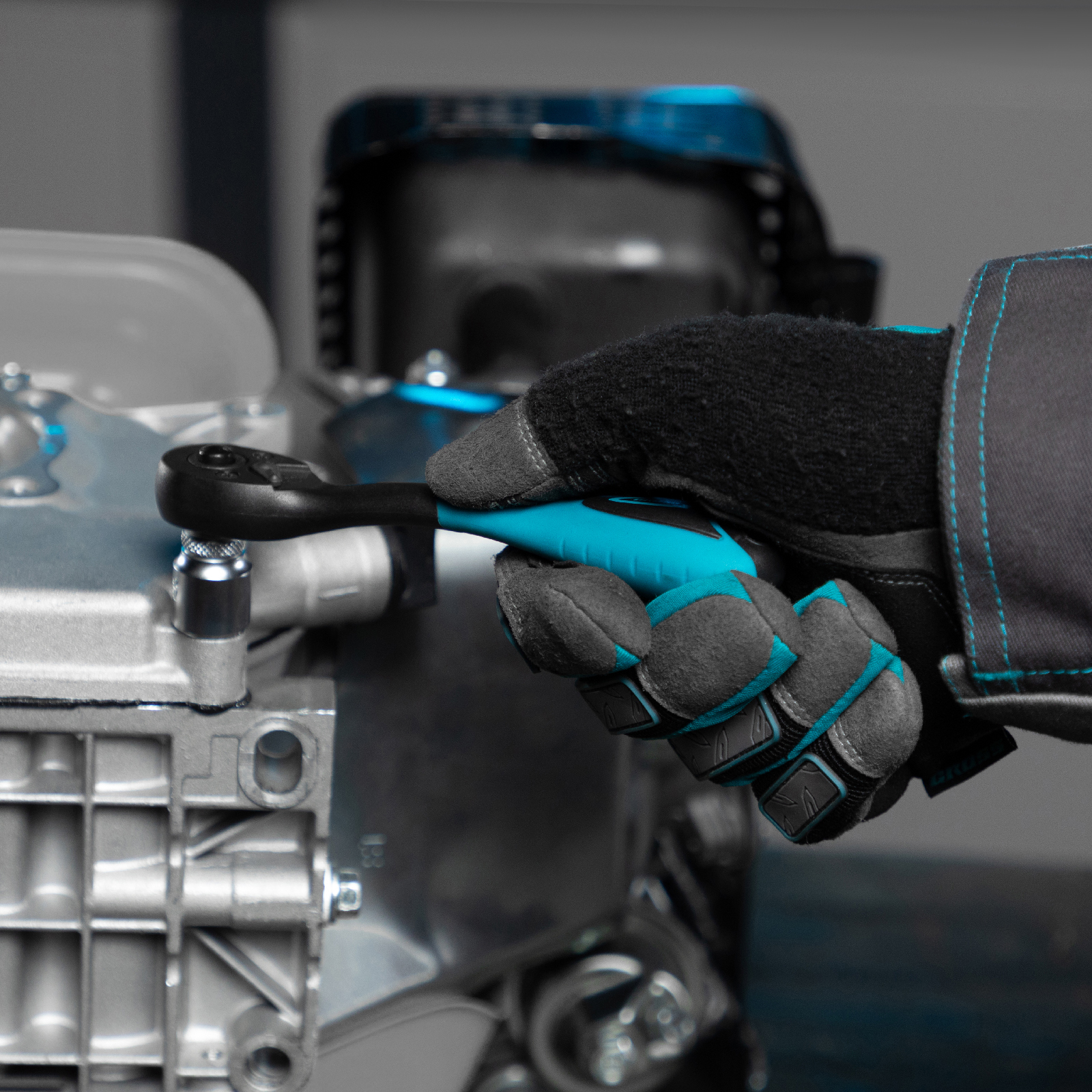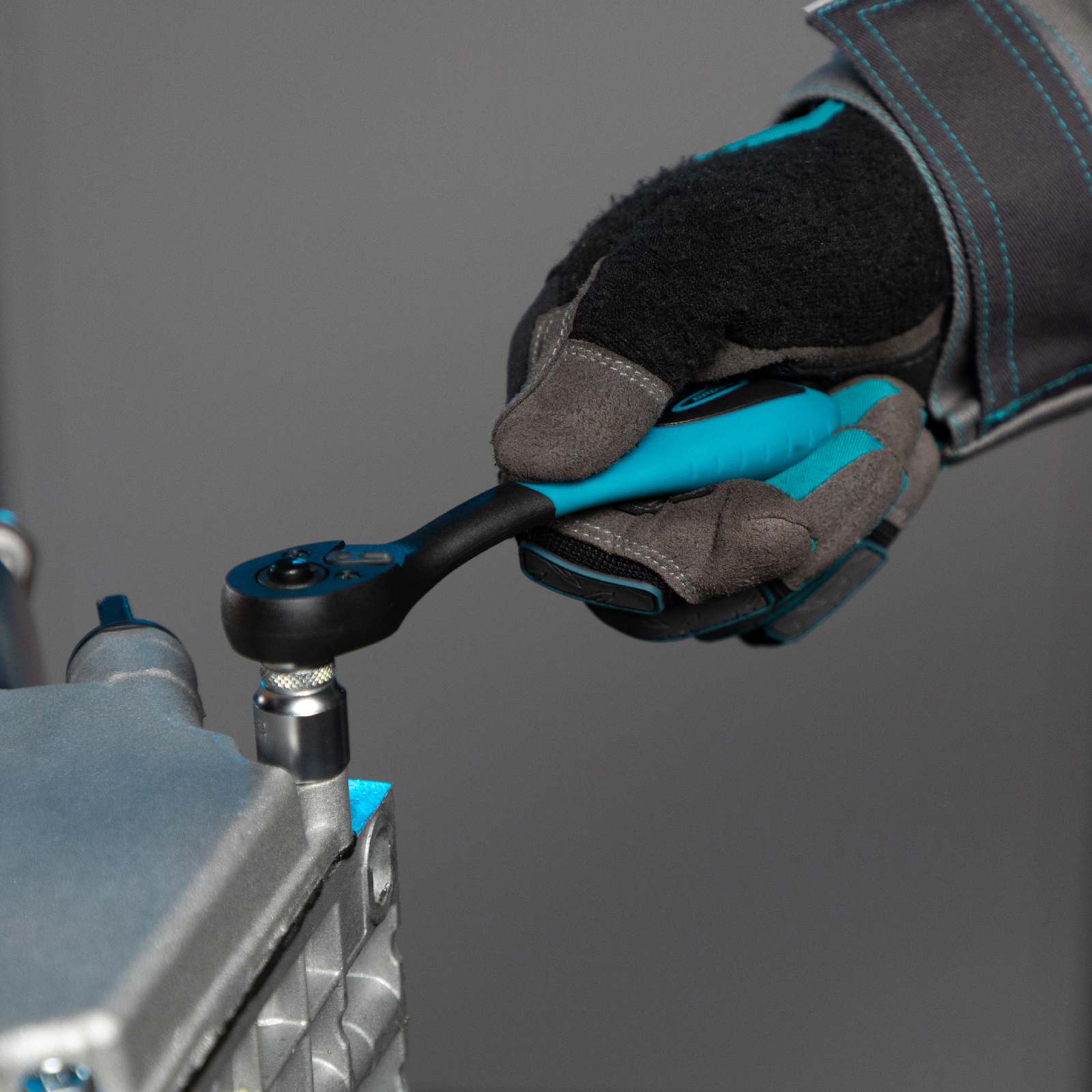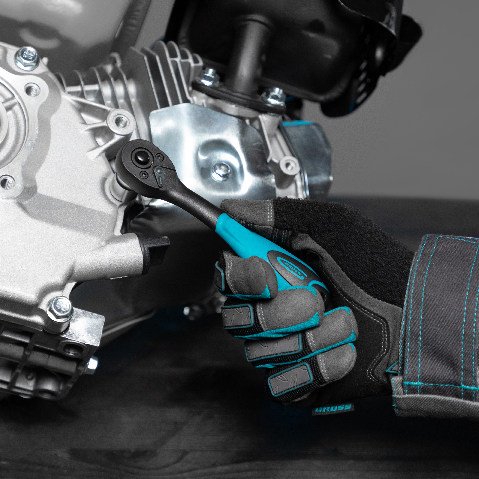 Ключ-трещотка Gross Comfort 14086 из стали CrV, с 2-компонентной рукояткой, присоединительным квадратом 1/4 дюйма и функцией быстрого сброса, оснащен храповым механизмом с 72 зубцами для быстрого и плавного закручивания/откручивания резьбовых крепежей. Удобен для работы в ограниченном пространстве, т.к. шаг трещотки составляет всего 5 градусов. Трещоточный ключ используется в сервисных центрах, авторемонтных мастерских, будет полезен при монтаже оборудования, также пригодится дома, в гараже или на даче.ПреимуществаДолговечность — инструмент изготовлен из стали хромованадиевой группы, что гарантирует его износостойкость.Устойчивость к агрессивным воздействиям — благодаря защитному полипропиленовому покрытию ключ подходит для работы в экстремальных условиях.Быстрый переход от монтажа к демонтажу — флажковый переключатель позволяет мгновенно изменить направление вращения храповика.Надежная фиксация оснастки — благодаря шариковому фиксатору насадка крепко держится на рабочем квадрате.Быстрая замена насадок — кнопкой сброса можно мгновенно освободить присоединительный квадрат от головки.Комфорт во время использования — эргономичная рукоятка дает возможность долго работать без усталости.