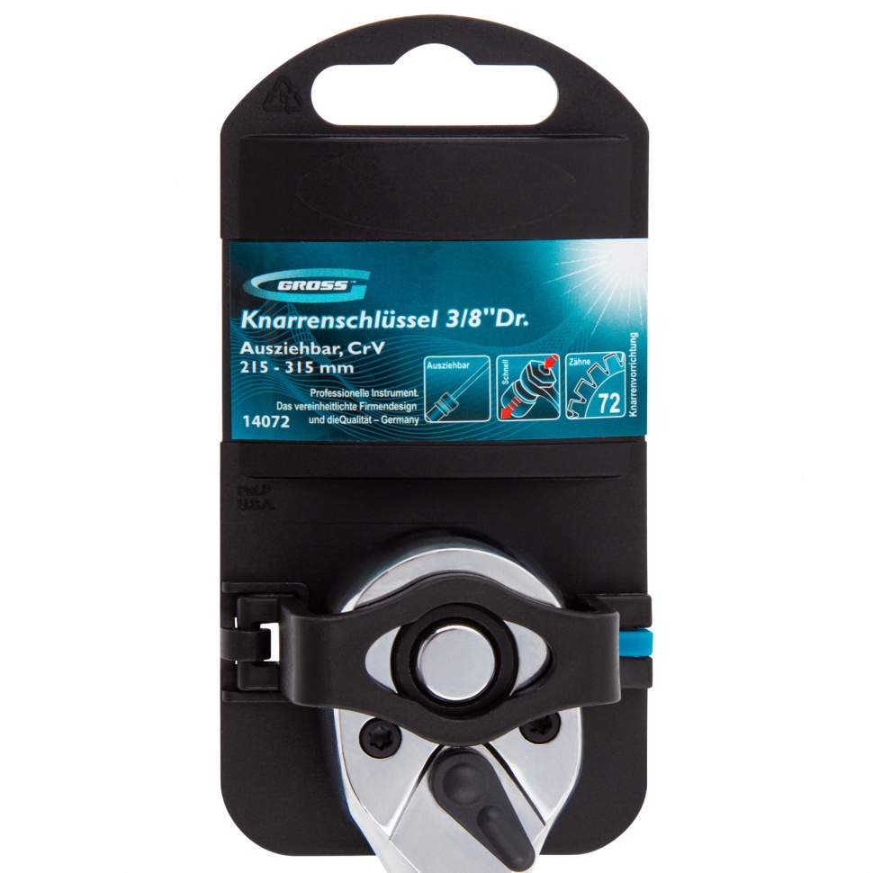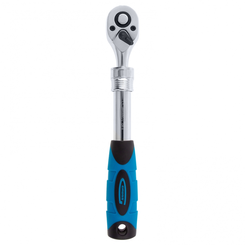 Телескопический хромированный трещоточный ключ Gross 14072, 215-315 мм, из стали CrV, с присоединительным квадратом 3/8 дюйма и 2-компонентной рукояткой, предназначен для монтажных работ с резьбовыми соединениями. Особенно удобен для работы в труднодоступных местах, т.к. имеет запатентованный механизм фиксации телескопической рукоятки. Ее длину можно изменить с 215 до 315 мм. Инструмент используется в слесарных мастерских, автосервисах, пригодится и в быту.ПреимуществаВысокая износостойкость — ключ-трещотка изготовлен из прочной стали хромованадиевой группы.Долговечность — хромированная поверхность устойчива к ржавчине и воздействию агрессивных веществ.Расширенные возможности — реверсивный механизм позволяет использовать инструмент как для закручивания, так и для откручивания крепежей.Легкая замена оснастки — кнопка быстрого сброса упрощает съем и установку насадок.Высокая плавность работы — храповый механизм с 72 зубцами имеет шаг 5 градусов.Надежная фиксация насадки — благодаря присоединительному квадрату с шариком оснастка не соскакивает во время работы.Комфортная эксплуатация — удобная двухкомпонентная ручка надежно ложится в руку и не выскальзывает из ладони.