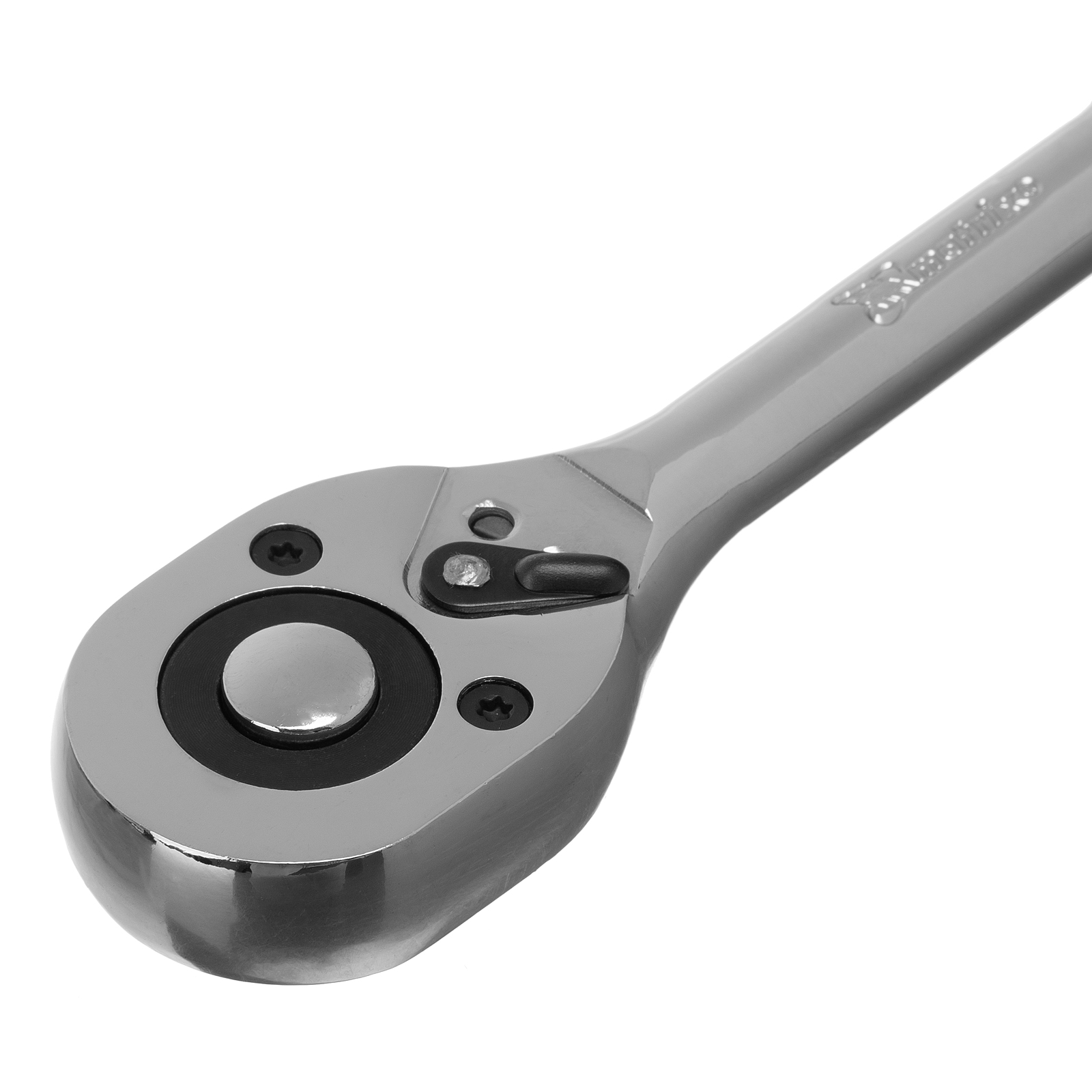 Хромированный ключ-трещотка Matrix 14015 с переключателем, из стали CrV, с присоединительным размером 1/2"", — ручной инструмент для монтажа и демонтажа резьбовых соединений. Совместим с торцевыми головками, имеющими посадочное гнездо соответствующего размера. Храповой механизм облегчает работу в труднодоступных местах. Инструмент применяется для ремонта техники, автомобилей, также используется в быту.ПреимуществаПрочность и устойчивость к нагрузкам — ключ выполнен из высококачественной хромованадиевой стали.Защита от разрушения — хромированная поверхность устойчива к образованию коррозии.Надежная фиксация торцевой головки — инструмент оснащен металлическим шариковым фиксатором.Реверс — можно менять направление вращения для быстрого переключения между задачами.Функция быстрого сброса — замена насадки занимает несколько секунд.Комфортная работа — рукоятка с рельефной поверхностью не выскальзывает из рук.