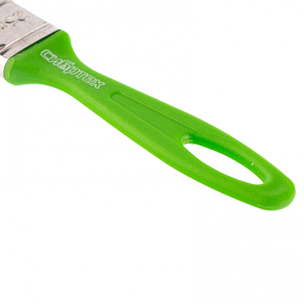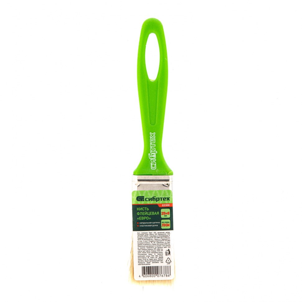 Флейцевая кисть Сибртех «Евро» 83300 шириной 25 мм и толщиной 8 мм, с натуральной щетиной и пластиковой ручкой, предназначена для первичного окрашивания либо создания финишного слоя на небольших или узких участках поверхности. Кисть обладает хорошими краскообменными качествами и подходит для любых видов лакокрасочных материалов (ЛКМ).ПреимуществаВысокое качество декоративного покрытия — натуральная щетина двойной выварки не содержит посторонних частиц.Эффективная работа — кисть хорошо поглощает и отдает краску, т. к. щетинки расщеплены на концах.Возможность использования ЛКМ на основе растворителей — натуральная щетина устойчива к воздействию агрессивных сред.Долговечность — оптимально подобранный клеевой состав, клинья и металлический бандаж надежно удерживают щетину.Коррозионная стойкость — бандаж имеет защитное покрытие, поэтому кисть можно замачивать в воде и растворителе.Комфортная работа — легкая пластиковая рукоятка не утяжеляет кисть и удобно ложится в руку.Удобное хранение — в рукоятке есть отверстие для подвешивания на крючок или гвоздь.