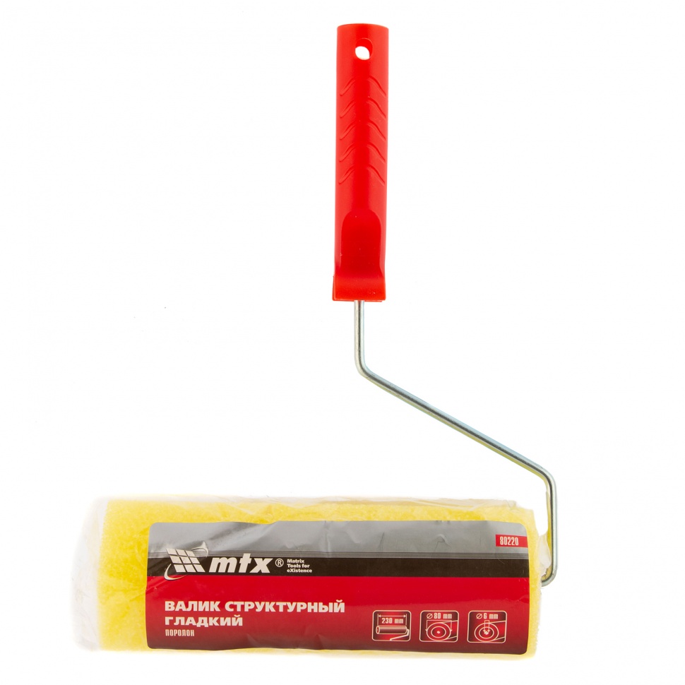 Структурный поролоновый валик MTX 80220 «гладкий» 230 мм с ручкой диаметром 6 мм, диаметром ролика 80 мм, предназначен для декоративной отделки стен, потолков, фасадов и других поверхностей. Он подходит для нанесения водно-дисперсионных фактурных красок, декоративной штукатурки, жидких материалов без содержания химических растворителей и щелочи. Небольшие отверстия в поролоновой шубке позволяют создать оригинальный узор на поверхности. Валик прост в применении и не требует владения профессиональными навыками.ПреимуществаЦилиндр валика изготовлен из прочного пластика, выдерживает интенсивные нажатия при создании узора.За счет ширины 230 мм валик подходит для обработки больших поверхностей, ускоряет процесс декорирования стен, фасадов и т.д.Ручка валика позволяет присоединить телескопический удлинитель для удобной работы на высоте и в труднодоступных местах.Поролоновая шубка легко поддается очистке от штукатурки и лакокрасочных материалов.
