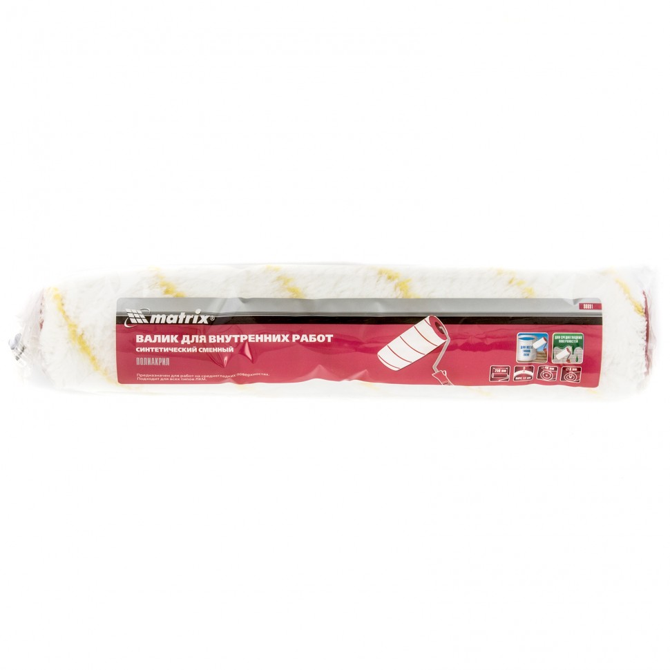 Сменный синтетический валик Matrix 80891 шириной 250 мм и диаметром 36 мм, под бюгель диаметром 6 мм, с ворсом 12 мм из полиакрила, оптимален для проведения малярных работ внутри помещений. Шубка с ворсом длиной 12 мм подходит для окрашивания средне-гладких поверхностей: полов, стен и потолков. Полиакрил в составе обеспечивает высокое качество работ с любыми типами ЛКМ, делает шубку износоустойчивой и формостойкой.ПреимуществаТехнология Termofusion — шубка надежно зафиксирована на ролике и не деформируется при интенсивном использовании.Легкий монтаж — быстросъемная система крепления позволяет за несколько секунд снять валик или зафиксировать его на бюгеле.Аккуратная работа — на шубке нет шва, а ее края острижены, это обеспечивает отсутствие следов на окрашиваемой поверхности.Максимальная отдача лакокрасочных материалов — ролик свободно вращается на бюгеле без заеданий, обеспечивая комфортную работу.Ширина 250 мм — валик подходит для окрашивания больших поверхностей.