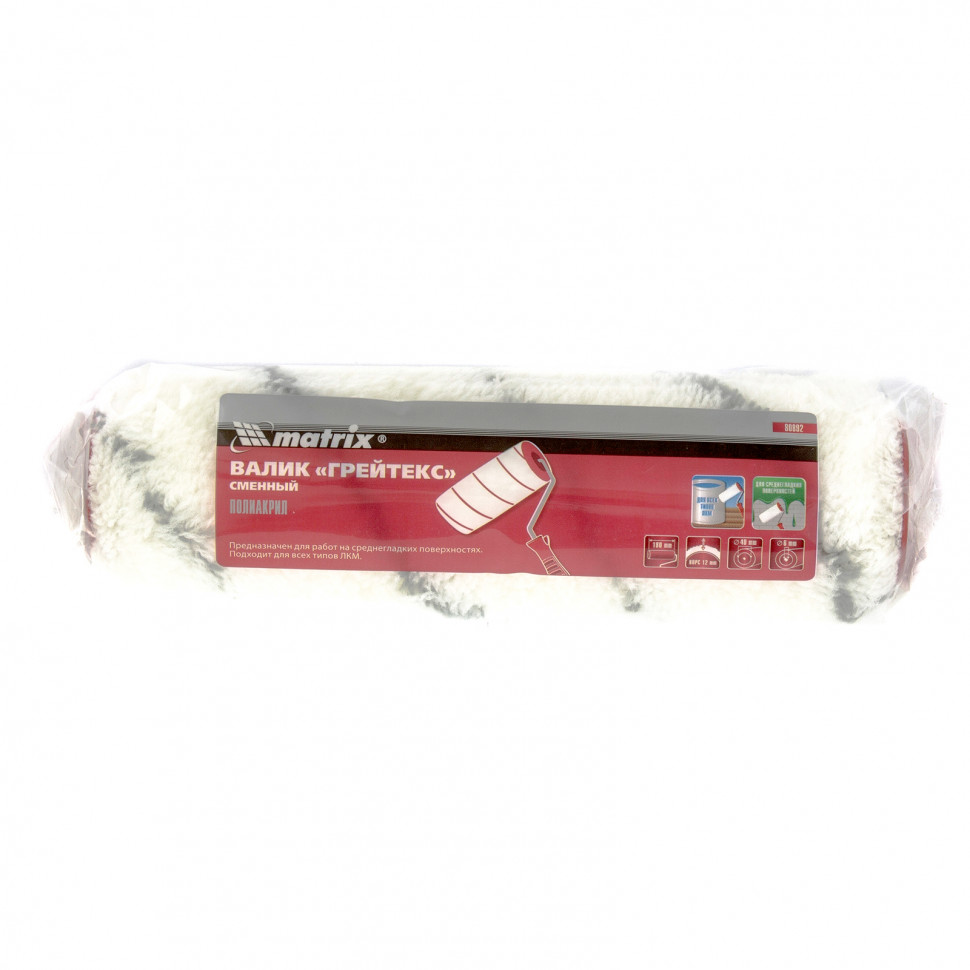 Сменный валик Matrix «ГРЕЙТЕКС» 80892 с ворсом 12 мм из полиакрила, шириной 180 мм и диаметром 36 мм, совместим с бюгелем 6 мм. Применяется для подготовки поверхностей под покраску и малярных работ с ЛКМ любого типа. Полиакриловая шубка устойчива к растворителям, за счет увеличенной плотности хорошо впитывает краску и обеспечивает ее равномерное нанесение.ПреимуществаПрочность и долговечность — ворс из полиакрила отличается хорошей формостойкостью и не боится разрывных нагрузок.Эффективная работа — ролик свободно вращается на бюгеле, что обеспечивает максимальную отдачу ЛКМ на поверхность.Высокий ресурс — шубка приклеена на ролик по технологии Termofusion, поэтому выдерживает интенсивное использование.Качественное окрашивание — шубка не имеет шва, ворс по краям острижен, поэтому на поверхности не остается следов и полос.Легкая установка — валик крепится на бюгель за несколько секунд благодаря быстросъемной конструкции.Быстрая обработка больших поверхностей — валик имеет ширину 180 мм.