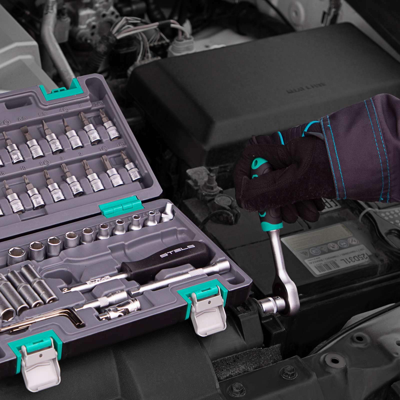 Набор инструментов Stels 14101 в пластиковом кейсе включает в себя 57 предметов с присоединительным размером 1/4 дюйма из стали CrV. Он применяется для монтажа и демонтажа резьбовых соединений во время обслуживания и ремонта авто, а также выполнения бытовых работ. Инструменты пригодятся автолюбителям и домашним мастерам.Преимущества Высокая прочность и износостойкость — все элементы набора изготовлены из высококачественной стали хромованадиевой группы и термически обработаны. Защита от разрушения — матовое антикоррозийное покрытие предотвращает появление ржавчины, а рукоятка трещотки из полипропилена и резины устойчива к воздействию бензина и масла. Простое переключение между задачами — механизм быстрого сброса позволяет легко менять насадки на трещотке. Быстрый поиск нужного инструмента — элементы набора надежно зафиксированы в ячейках ложемента с подписанными типоразмерами. Комфортная работа — трещотка с 72 зубьями вращает крепеж мягко и плавно, а эргономичная рукоятка удобно лежит в руке. Удобное хранение и транспортировка — набор поставляется в пластиковом ударопрочном кейсе с металлическими замками. Высокое качество — характеристики изделий соответствуют международным стандартам.