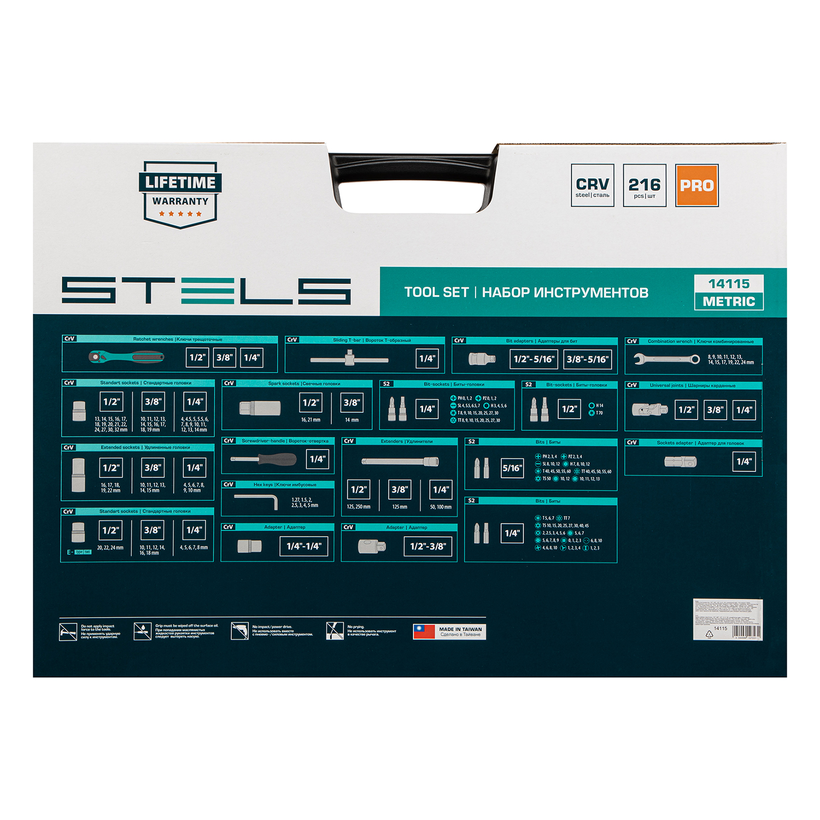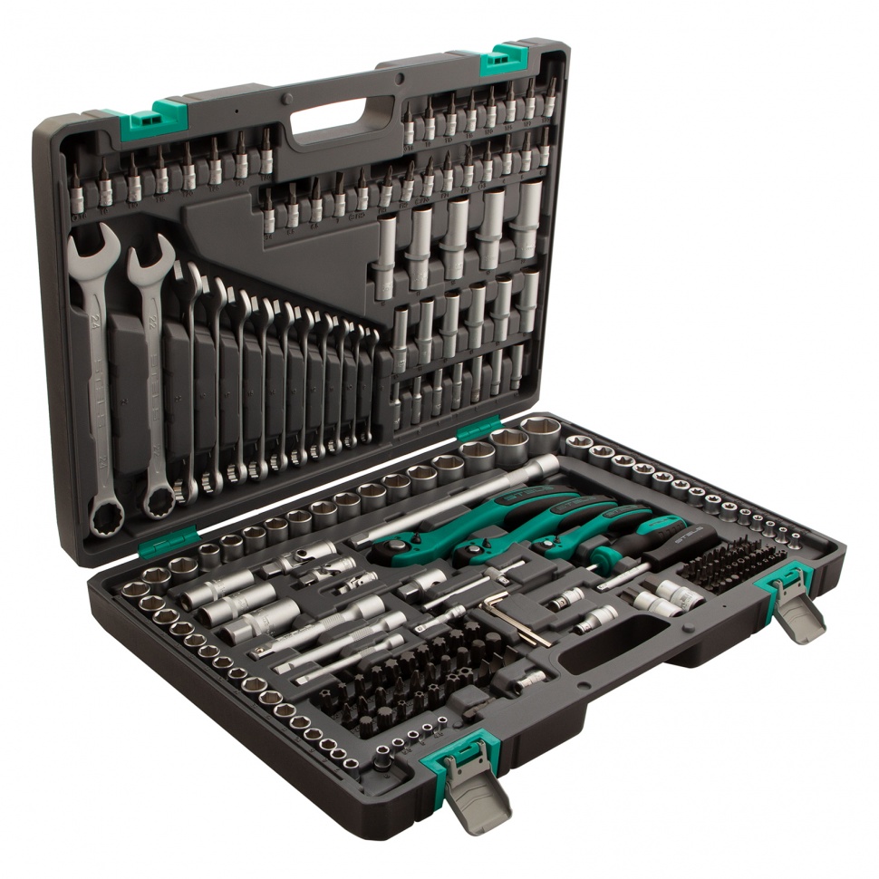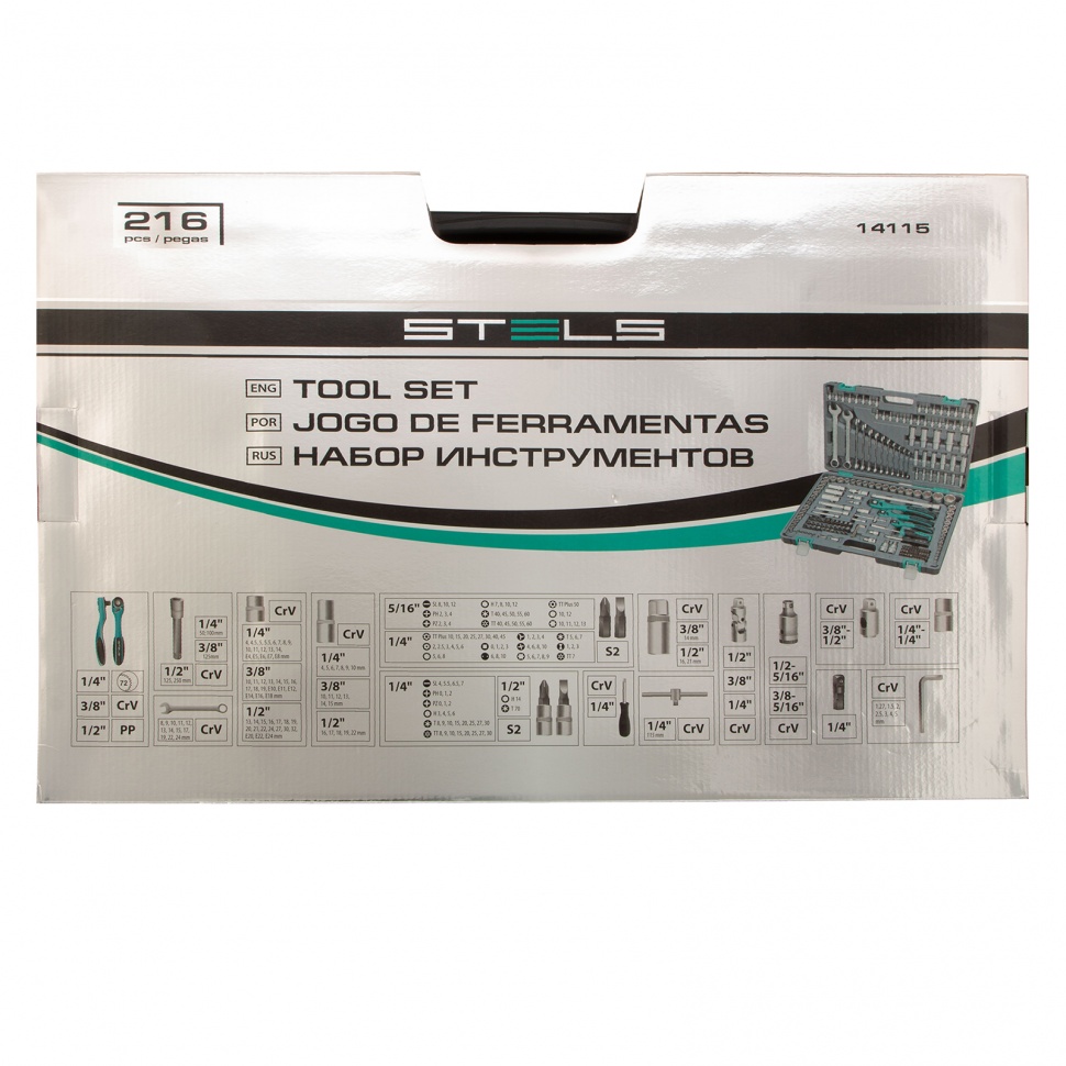 Набор инструментов Stels 14115 из сталей CrV и S2, в усиленном кейсе, состоит из 216 предметов с присоединительными размерами 1/4", 3/8" и 1/2", предназначенных для монтажа и демонтажа резьбовых соединений. В комплект входят приспособления, облегчающие работу в труднодоступных местах — вороток, удлинители и карданные шарниры. Кейс из ударопрочного жесткого пластика имеет металлические застежки и обеспечивает сохранность инструментов во время хранения и транспортировки. Набор подойдет для авторемонта в гараже или условиях автосервиса.Преимущества    Прочность и деформационная стойкость — торцевые головки и комбинированные ключи изготовлены хромованадиевой стали и термообработаны, биты и отвертка сделаны из легированной японской стали S2.    Защита от разрушения — поверхность инструментов с матовым хромированным покрытием сатин не подвержена коррозии.    Удобная работа в ограниченном пространстве — храповой механизм с 72 зубьями обеспечивает мягкое и плавное движение трещотки.    Быстрая замена насадок — кнопка быстрого сброса мгновенно разблокирует фиксатор головки.    Мгновенное переключение между задачами — реверсивный механизм позволяет одним движением менять направление вращения трещотки.    Комфортная работа даже в сложных условиях — ключи-трещотки с защитным покрытием и резиновыми вставками не выскальзывают из рук и обладают масло- и бензостойкостью.    Продуманное хранение и транспортировка — инструменты надежно зафиксированы в ложементе кейса.    Высокое качество — инструменты Stels произведены с соблюдением всех технологических норм, на торцевые головки с квадратом 1/2" от 8 мм и комбинированные ключи предоставляется пожизненная гарантия.