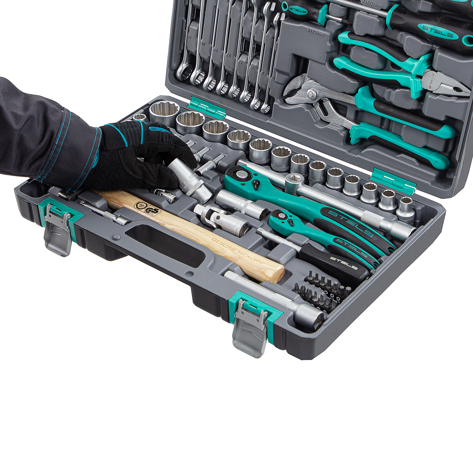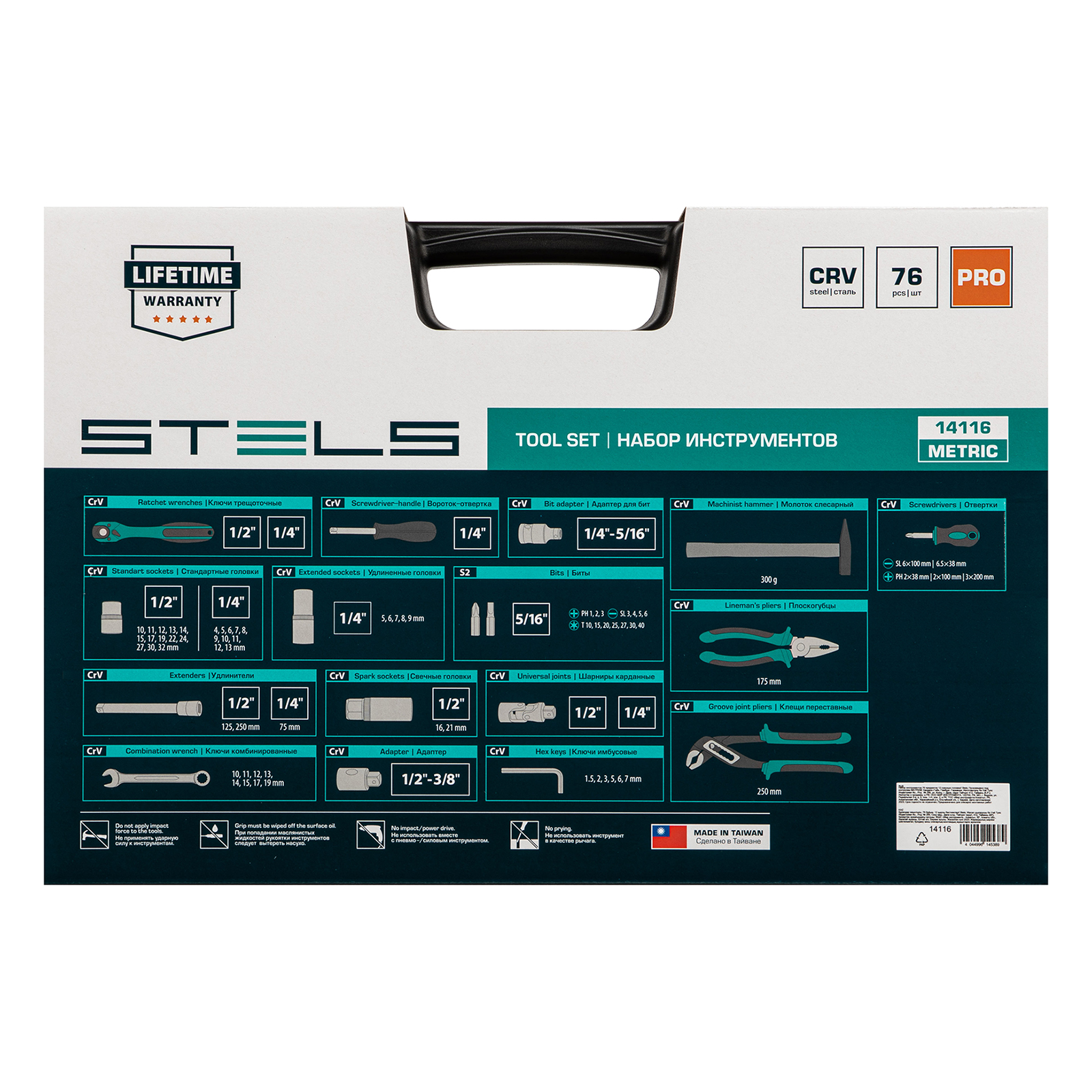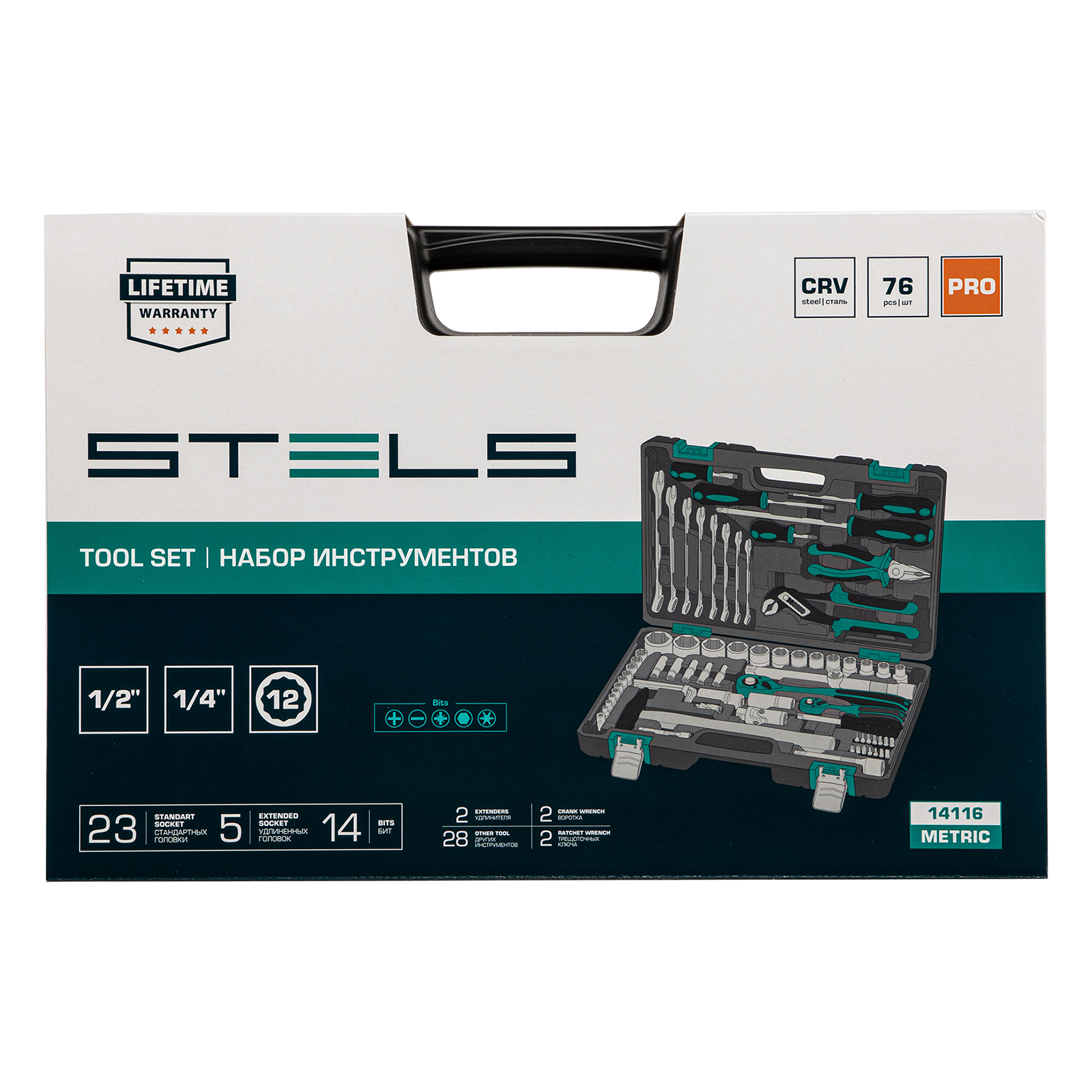 Набор инструментов Stels 14116 состоит из 76 предметов и включает инструменты и насадки для работы с резьбовыми крепежами, в том числе 12-гранные торцевые головки, облегчающие работу в труднодоступных местах. Молоток, пассатижи и переставные клещи расширяют возможности применения набора. Комплект упакован в кейс из ударопрочного жесткого пластика, с металлическими застежками, удобный для хранения и перевозки. Набор предназначен для ремонта автомобилей в гараже или автосервисе, пригодится также дома, на даче или в поездке.ПреимуществаПрочность и высокий ресурс — торцевые головки и комбинированные ключи выполнены из термически обработанной хромованадиевой стали, биты и отвертки изготовлены из высококачественной японской стали S2.Защита от разрушения — поверхность инструментов хромирована, ключи-трещотки имеют полипропиленовое покрытие с резиновыми вставками, отличающееся масло- и бензостойкостью.Простая установка насадок — трещоточные ключи оснащены кнопкой быстрого сброса.Быстрое изменение направления вращения — переключатель реверса позволяет не только закручивать, но и откручивать крепежи.Комфортная работа — храповой механизм трещоток имеет 72 зуба, поэтому ключи работают мягко и плавно.Удобное хранение и транспортировка — все инструменты зафиксированы в ложементе кейса.Высокое качество — инструменты Stels произведены с соблюдением всех технологических норм, на торцевые головки с квадратом 1/2"" от 8 мм и комбинированные ключи предоставляется пожизненная гарантия.