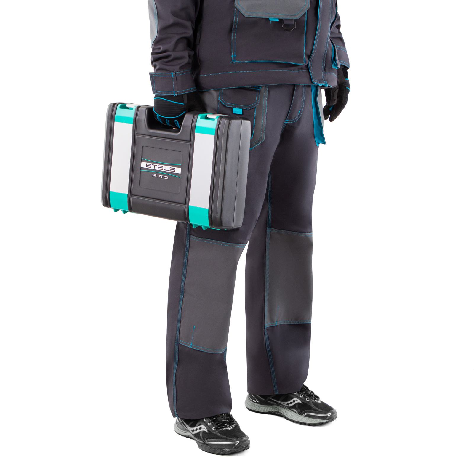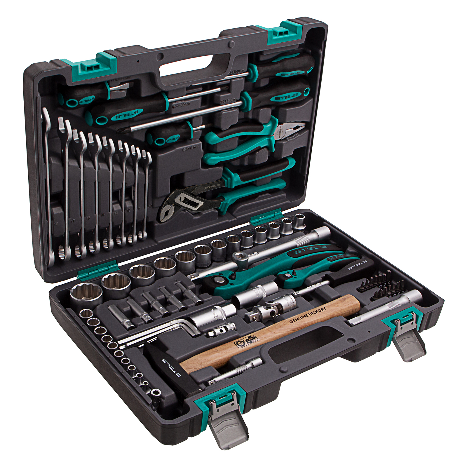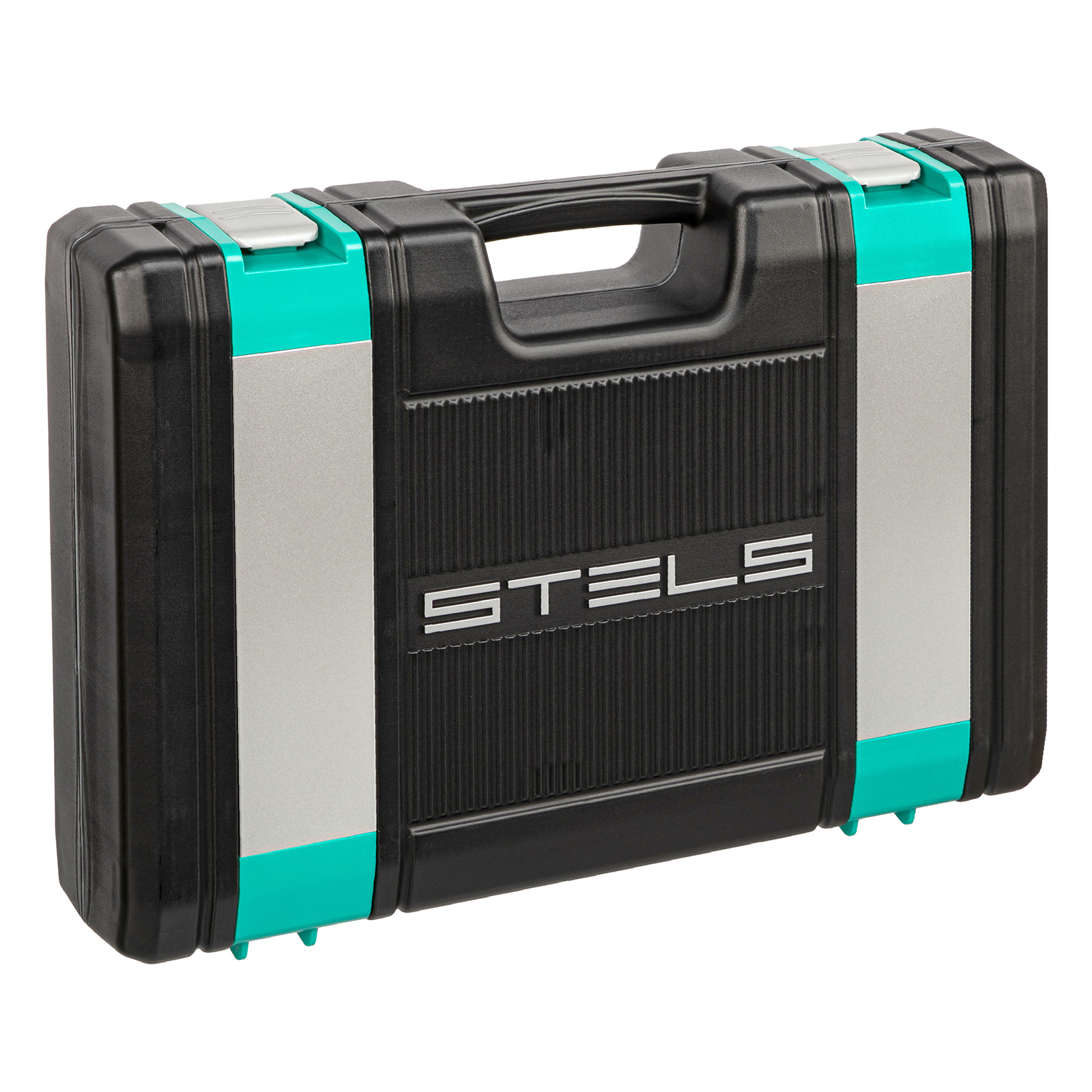 Набор инструментов Stels 14116 состоит из 76 предметов и включает инструменты и насадки для работы с резьбовыми крепежами, в том числе 12-гранные торцевые головки, облегчающие работу в труднодоступных местах. Молоток, пассатижи и переставные клещи расширяют возможности применения набора. Комплект упакован в кейс из ударопрочного жесткого пластика, с металлическими застежками, удобный для хранения и перевозки. Набор предназначен для ремонта автомобилей в гараже или автосервисе, пригодится также дома, на даче или в поездке.ПреимуществаПрочность и высокий ресурс — торцевые головки и комбинированные ключи выполнены из термически обработанной хромованадиевой стали, биты и отвертки изготовлены из высококачественной японской стали S2.Защита от разрушения — поверхность инструментов хромирована, ключи-трещотки имеют полипропиленовое покрытие с резиновыми вставками, отличающееся масло- и бензостойкостью.Простая установка насадок — трещоточные ключи оснащены кнопкой быстрого сброса.Быстрое изменение направления вращения — переключатель реверса позволяет не только закручивать, но и откручивать крепежи.Комфортная работа — храповой механизм трещоток имеет 72 зуба, поэтому ключи работают мягко и плавно.Удобное хранение и транспортировка — все инструменты зафиксированы в ложементе кейса.Высокое качество — инструменты Stels произведены с соблюдением всех технологических норм, на торцевые головки с квадратом 1/2"" от 8 мм и комбинированные ключи предоставляется пожизненная гарантия.