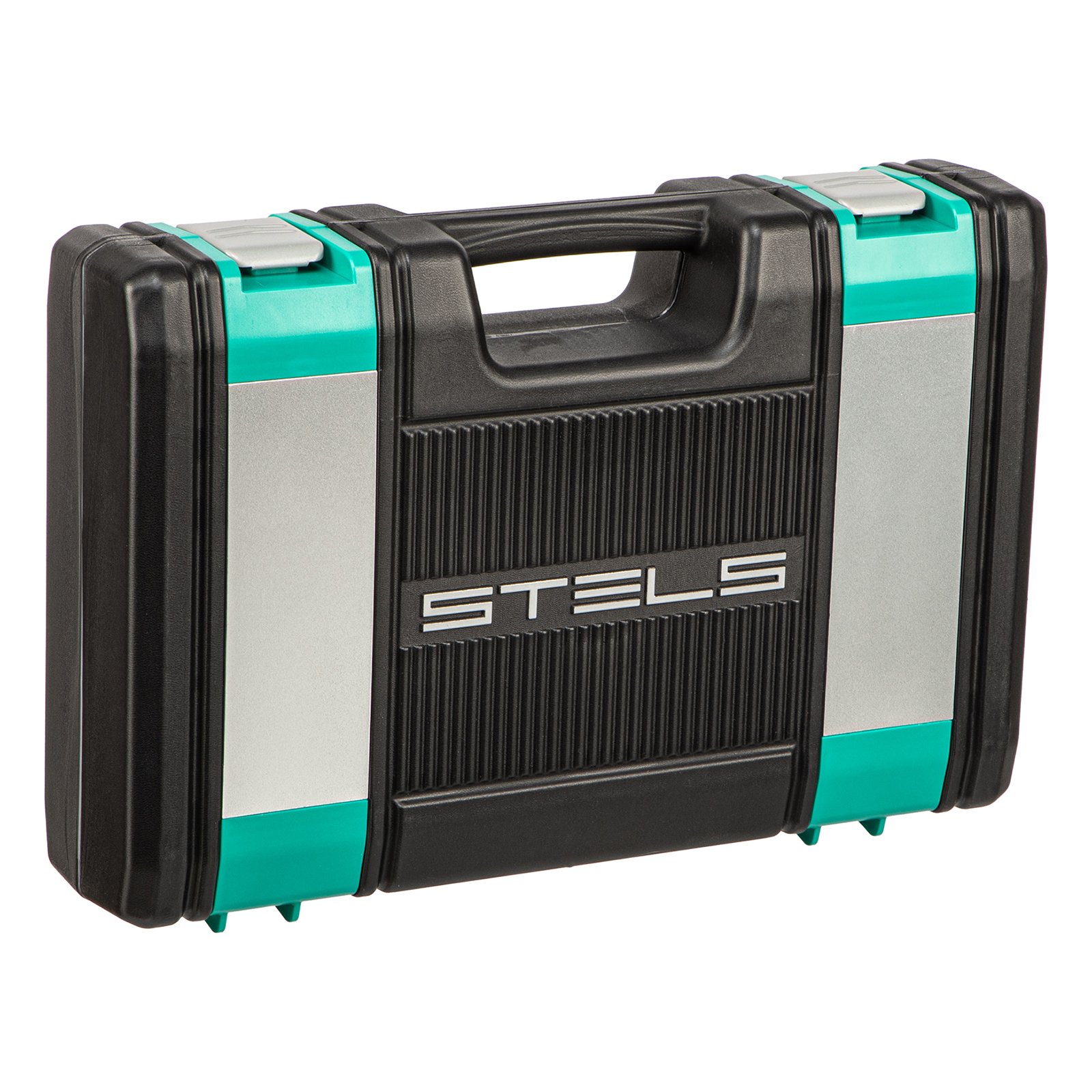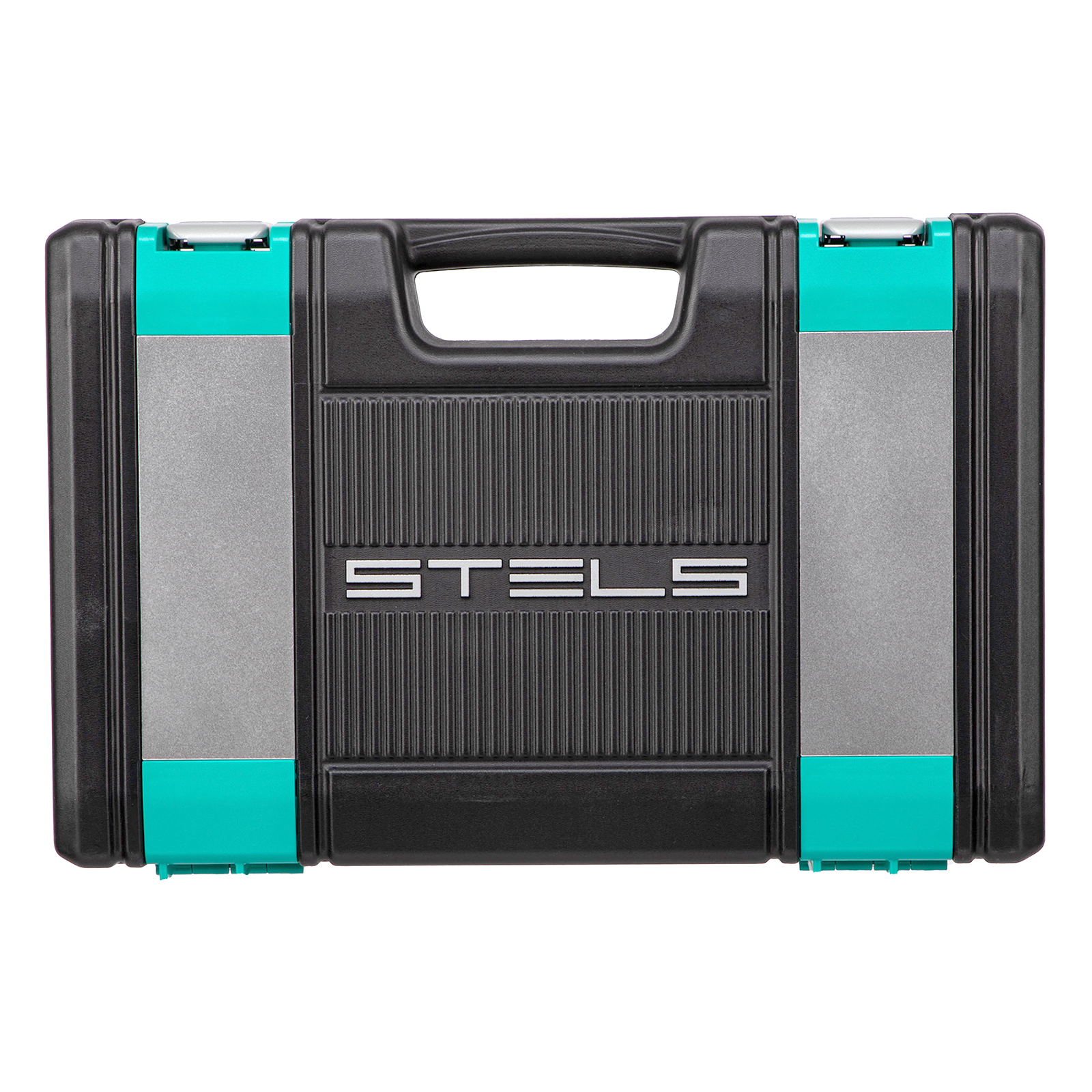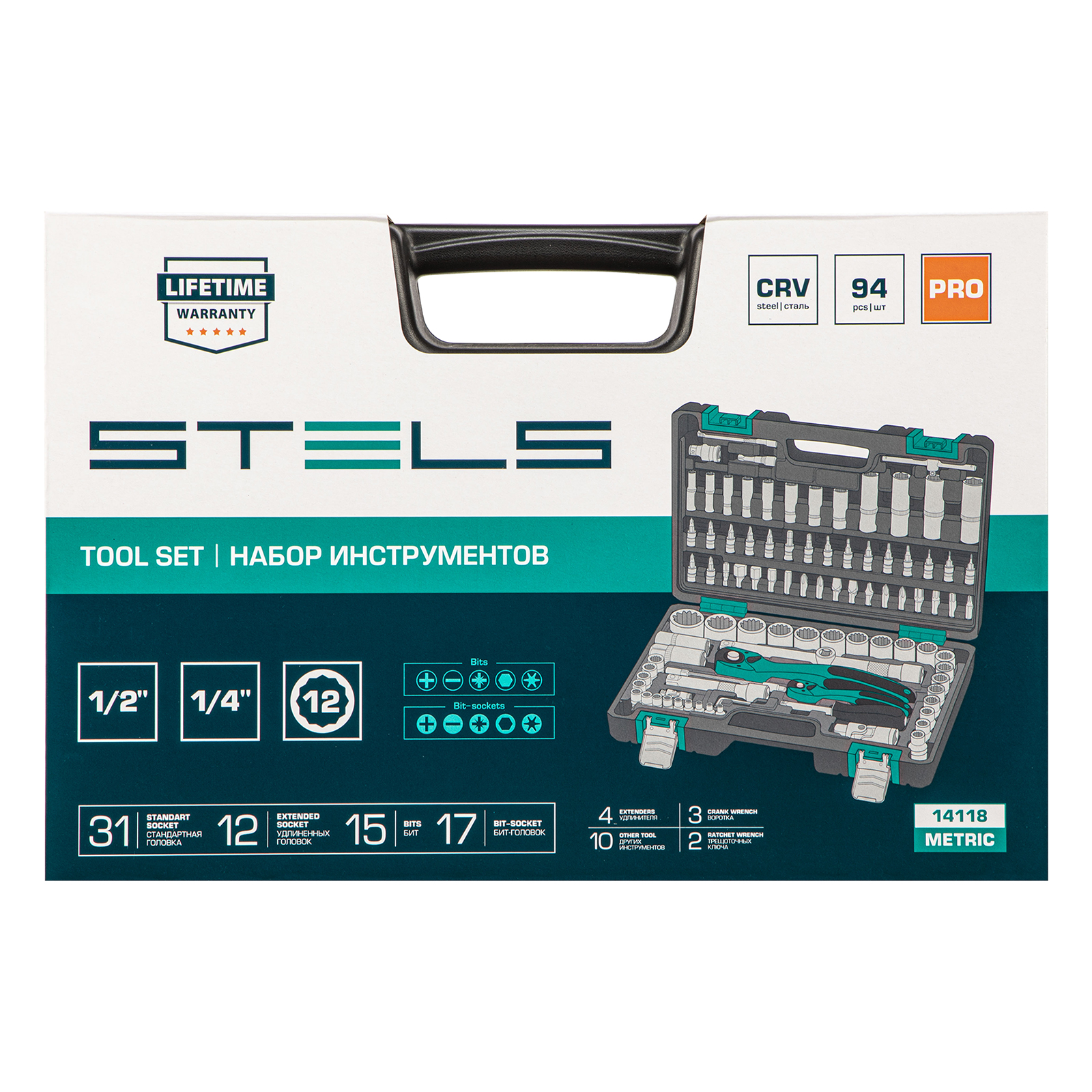 Набор инструментов Stels 14118 состоит из 94 предметов и включает инструменты и насадки для работы с резьбовыми крепежами, в том числе 12-гранные торцевые головки, облегчающие работу в труднодоступных местах. Комплект упакован в кейс из ударопрочного жесткого пластика, с металлическими застежками, удобный для хранения и перевозки. Набор предназначен для ремонта автомобилей в гараже или автосервисе, пригодится также дома, на даче или в поездке.Преимущества Прочность и высокий ресурс — торцевые головки выполнены из термически обработанной хромованадиевой стали, биты-вставки изготовлены из высококачественной японской стали S2. Защита от разрушения — поверхность инструментов хромирована, ключи-трещотки имеют полипропиленовое покрытие с резиновыми вставками, отличающееся масло- и бензостойкостью. Простая установка насадок — трещоточные ключи оснащены кнопкой быстрого сброса. Быстрое изменение направления вращения — переключатель реверса позволяет не только закручивать, но и откручивать крепежи. Комфортная работа — храповой механизм трещоток имеет 72 зуба, поэтому ключи работают мягко и плавно. Удобное хранение и транспортировка — все инструменты зафиксированы в ложементе кейса. Высокое качество — инструменты Stels произведены с соблюдением всех технологических норм, на торцевые головки с квадратом 1/2"" от 8 мм предоставляется пожизненная гарантия.