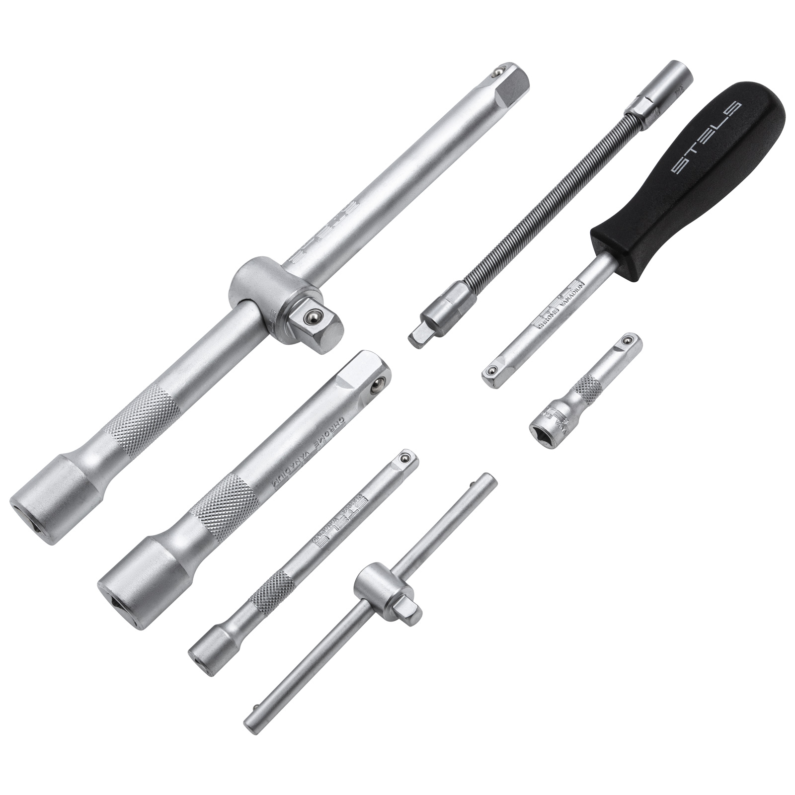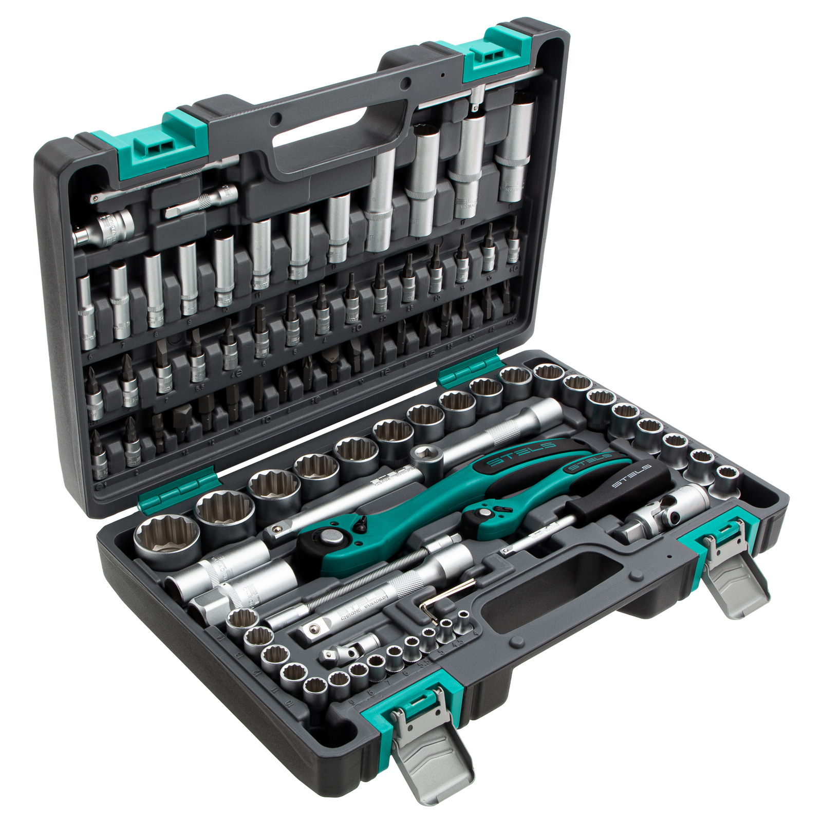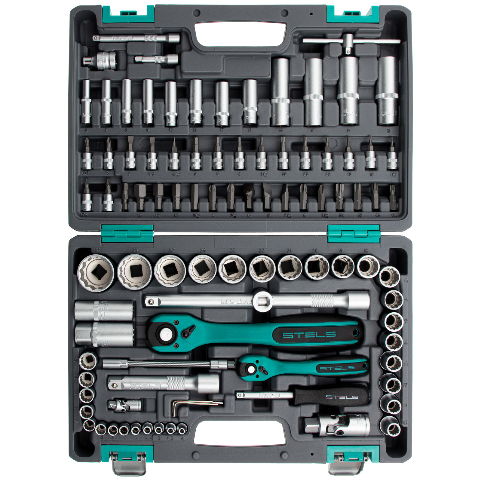 Набор инструментов Stels 14118 состоит из 94 предметов и включает инструменты и насадки для работы с резьбовыми крепежами, в том числе 12-гранные торцевые головки, облегчающие работу в труднодоступных местах. Комплект упакован в кейс из ударопрочного жесткого пластика, с металлическими застежками, удобный для хранения и перевозки. Набор предназначен для ремонта автомобилей в гараже или автосервисе, пригодится также дома, на даче или в поездке.Преимущества Прочность и высокий ресурс — торцевые головки выполнены из термически обработанной хромованадиевой стали, биты-вставки изготовлены из высококачественной японской стали S2. Защита от разрушения — поверхность инструментов хромирована, ключи-трещотки имеют полипропиленовое покрытие с резиновыми вставками, отличающееся масло- и бензостойкостью. Простая установка насадок — трещоточные ключи оснащены кнопкой быстрого сброса. Быстрое изменение направления вращения — переключатель реверса позволяет не только закручивать, но и откручивать крепежи. Комфортная работа — храповой механизм трещоток имеет 72 зуба, поэтому ключи работают мягко и плавно. Удобное хранение и транспортировка — все инструменты зафиксированы в ложементе кейса. Высокое качество — инструменты Stels произведены с соблюдением всех технологических норм, на торцевые головки с квадратом 1/2"" от 8 мм предоставляется пожизненная гарантия.