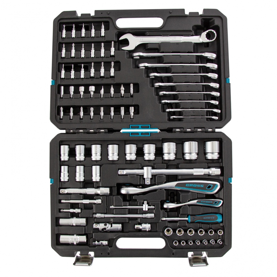 Набор инструментов Gross 14149 включает в себя 82 предмета, в том числе ключи-трещотки из стали CrV со 120 зубьями, с присоединительным размером 1/4" и 1/2". Инструменты используются для монтажа и демонтажа резьбовых соединений. Вороток, удлинители и карданные шарниры облегчают работу в стесненных условиях. Набор пригодится водителям, сотрудникам автосервисов, а также домашним мастерам.ПреимуществаИсключительная твердость и прочность — биты изготовлены из японской легированной стали S2, остальные элементы набора выполнены из хромованадиевой стали.Работа со значительным усилием — гаечные ключи с дополнительным ребром жесткости и цельнокованые трещотки выдерживают высокие нагрузки.Эффективность — удлинители снабжены профилем под гаечный ключ для увеличения крутящего момента.Удобная работа с труднодоступными крепежами — гаечные ключи имеют изогнутый корпус, шаг трещоток составляет всего 3°.Реверс — флажковые переключатели позволяют мгновенно изменять направление вращения трещоток.Комфортный захват — благодаря антискользящим насечкам даже влажные или замасленные удлинители и насадки не выскальзывают из рук.Продуманная система хранения — набор поставляется в противоударном кейсе с металлическими застежками, каждый инструмент зафиксирован в ложементе.
