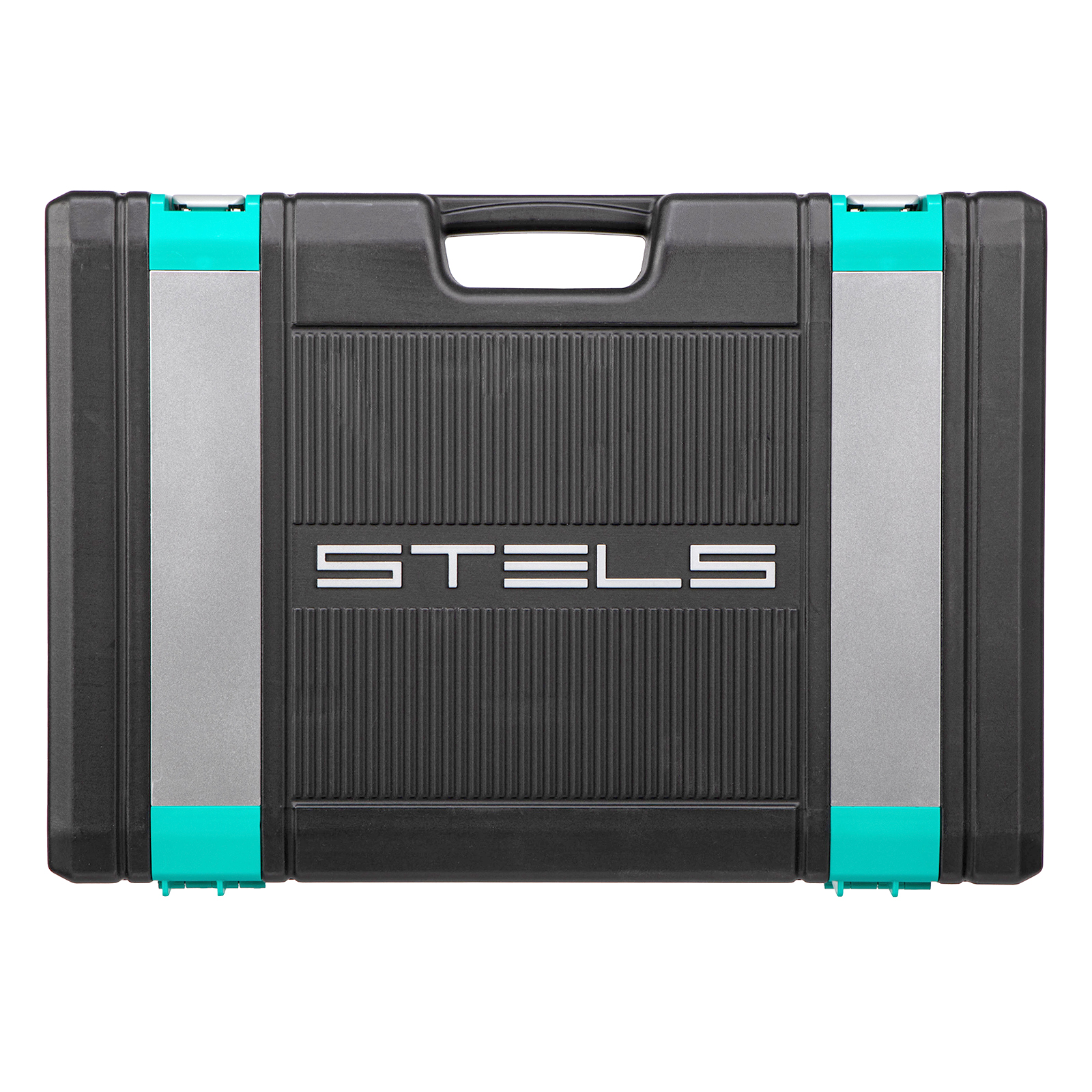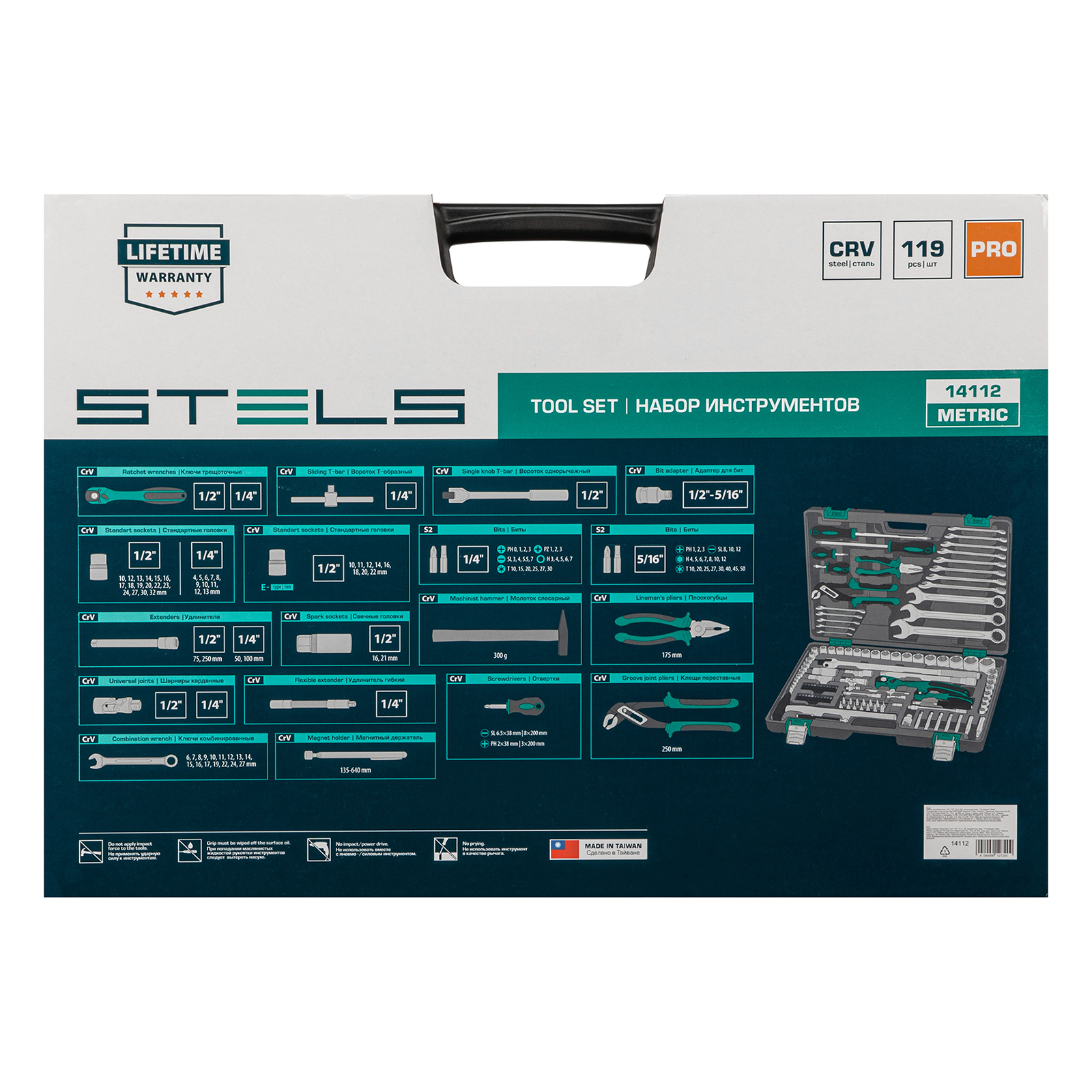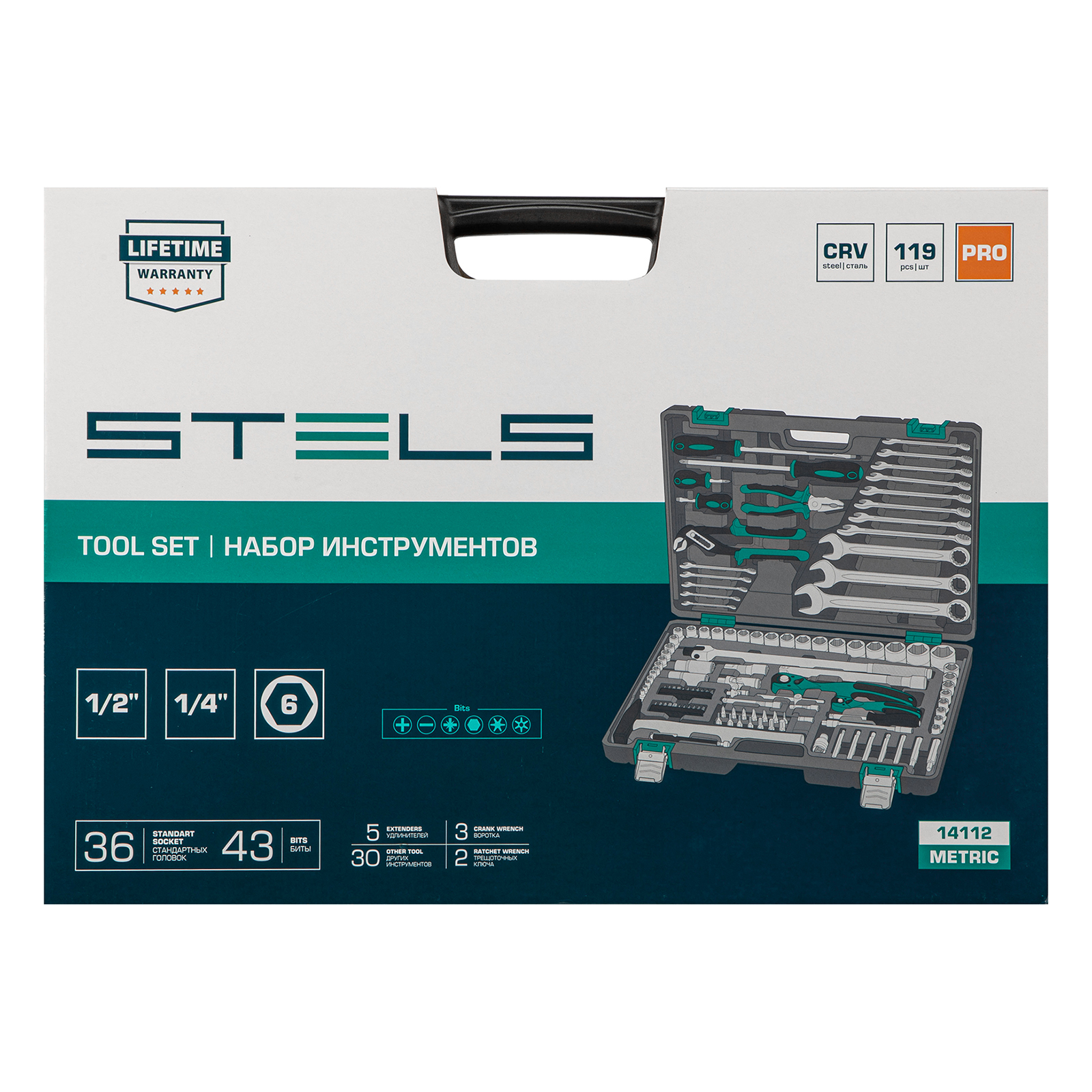 Набор инструментов Stels 14112 в усиленном кейсе включает в себя 119 предметов из стали CrV и S2, с присоединительными размерами 1/2"" и 1/4"". С его помощью можно проводить различные слесарно-монтажные работы — кроме инструментов для закручивания и откручивания крепежей в комплект входят молоток, переставные клещи и пассатижи. Набор предназначен для автолюбителей и сотрудников автосервисов, пригодится также во время ремонта.Преимущества Прочность и долговечность — комбинированные ключи и торцевые головки изготовлены из термически обработанной хромованадиевой стали. Повышенная износостойкость — отвертки и биты-вставки выполнены из высококачественной японской стали S2. Защита от разрушения — матовое хромовое покрытие «сатин» предотвращает образование коррозии, корпусы ключей-трещоток устойчивы к воздействию агрессивных веществ, поскольку покрыты полипропиленом. Надежный хват — благодаря резиновым вставкам на рукоятках трещоточные ключи не выскальзывают из руки. Удобная работа в ограниченном пространстве — шаг трещоток составляет всего 5°. Высокая скорость работы — функция быстрого сброса позволяет менять насадки на ключах-трещотках за несколько секунд. Быстрый переход от закручивания к откручиванию крепежей — трещоточные ключи оснащены флажковыми переключателями реверса. Удобство хранения и транспортировки — набор поставляется в кейсе из жесткого ударопрочного пластика с металлическими застежками. Высокое качество — инструменты Stels произведены с соблюдением всех технологических норм, на торцевые головки с квадратом 1/2"" от 8 мм и комбинированные ключи предоставляется пожизненная гарантия.