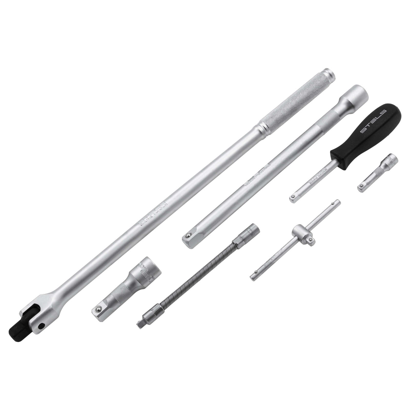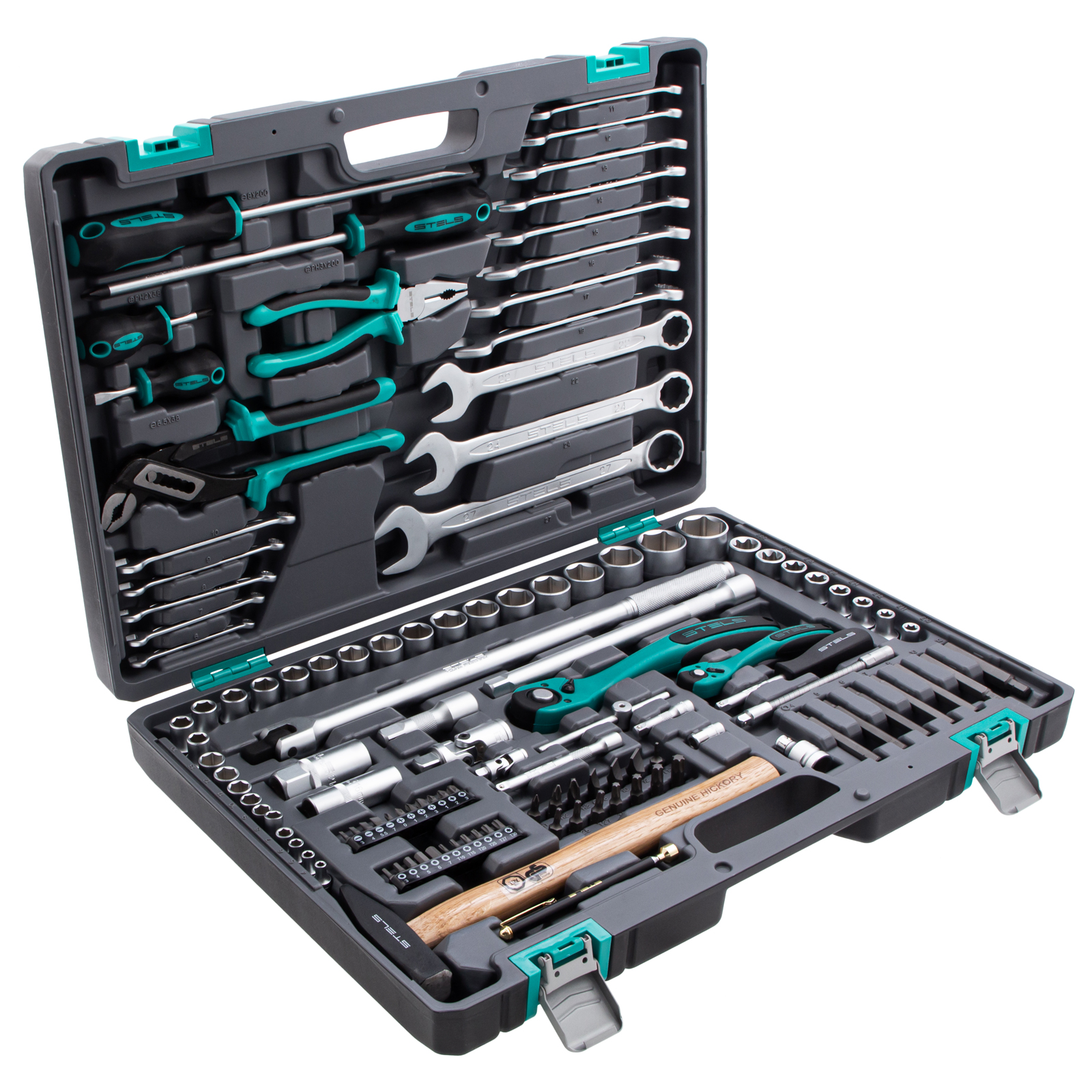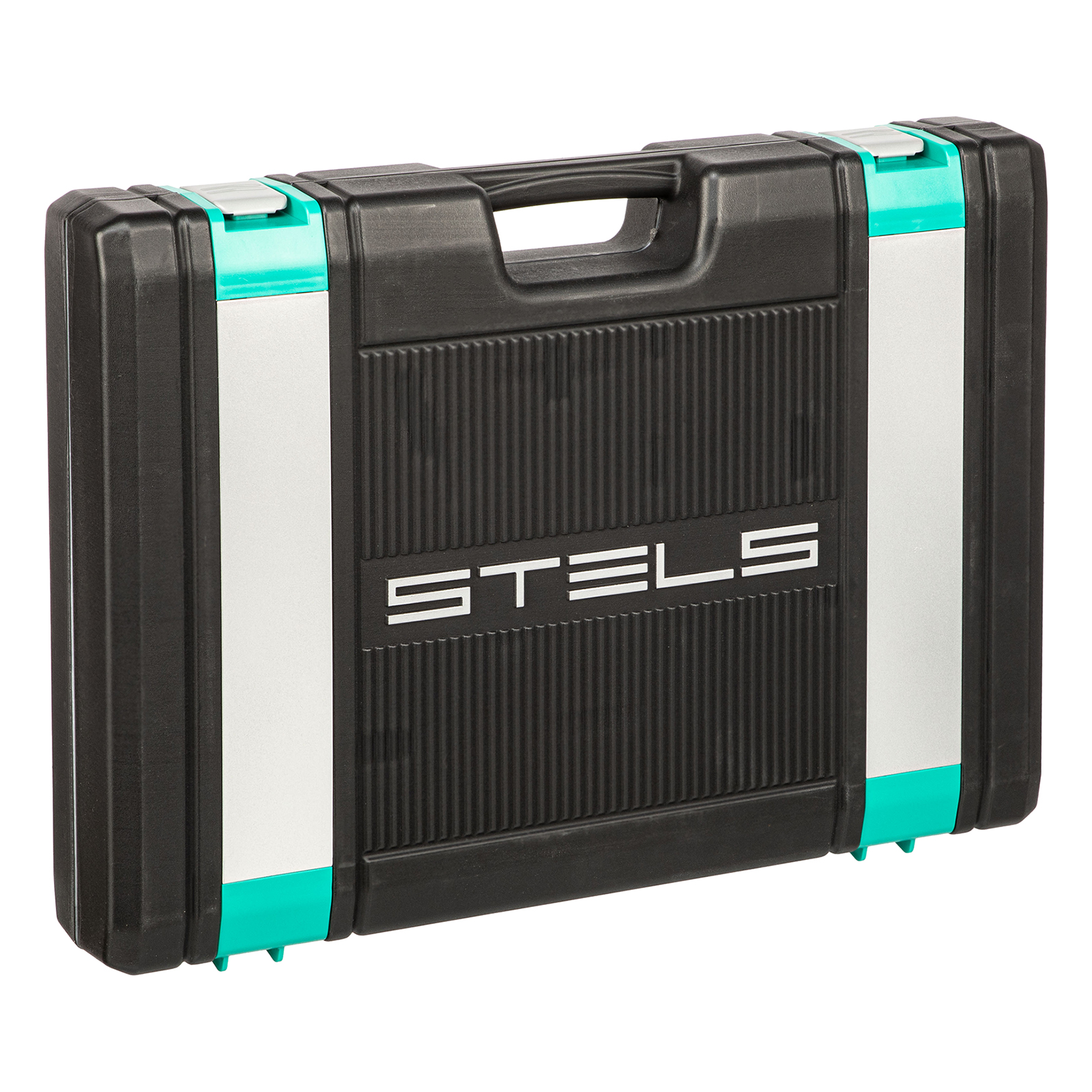 Набор инструментов Stels 14112 в усиленном кейсе включает в себя 119 предметов из стали CrV и S2, с присоединительными размерами 1/2"" и 1/4"". С его помощью можно проводить различные слесарно-монтажные работы — кроме инструментов для закручивания и откручивания крепежей в комплект входят молоток, переставные клещи и пассатижи. Набор предназначен для автолюбителей и сотрудников автосервисов, пригодится также во время ремонта.Преимущества Прочность и долговечность — комбинированные ключи и торцевые головки изготовлены из термически обработанной хромованадиевой стали. Повышенная износостойкость — отвертки и биты-вставки выполнены из высококачественной японской стали S2. Защита от разрушения — матовое хромовое покрытие «сатин» предотвращает образование коррозии, корпусы ключей-трещоток устойчивы к воздействию агрессивных веществ, поскольку покрыты полипропиленом. Надежный хват — благодаря резиновым вставкам на рукоятках трещоточные ключи не выскальзывают из руки. Удобная работа в ограниченном пространстве — шаг трещоток составляет всего 5°. Высокая скорость работы — функция быстрого сброса позволяет менять насадки на ключах-трещотках за несколько секунд. Быстрый переход от закручивания к откручиванию крепежей — трещоточные ключи оснащены флажковыми переключателями реверса. Удобство хранения и транспортировки — набор поставляется в кейсе из жесткого ударопрочного пластика с металлическими застежками. Высокое качество — инструменты Stels произведены с соблюдением всех технологических норм, на торцевые головки с квадратом 1/2"" от 8 мм и комбинированные ключи предоставляется пожизненная гарантия.