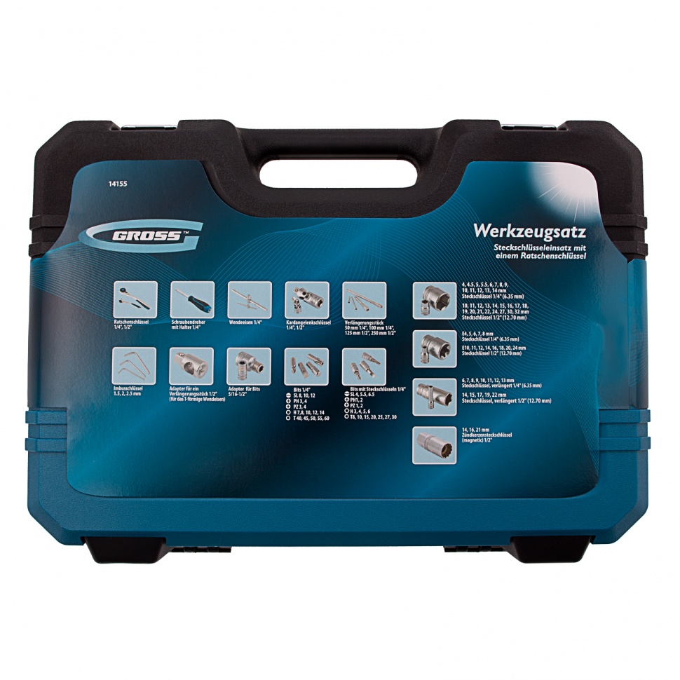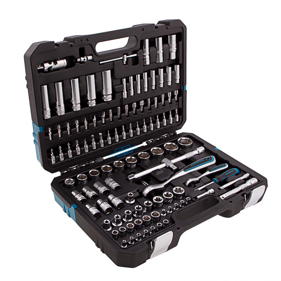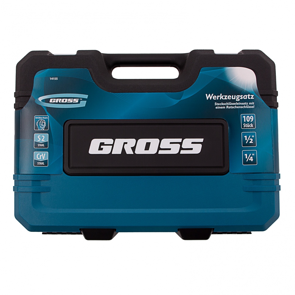 Набор инструментов Gross 14155 включает в себя 109 предметов, в том числе ключи-трещотки из стали CrV со 120 зубьями, с присоединительным размером 1/4" и 1/2". Инструменты используются для монтажа и демонтажа резьбовых соединений. Вороток, удлинители и карданные шарниры облегчают работу в стесненных условиях. Набор пригодится водителям, сотрудникам автосервисов, а также домашним мастерам.ПреимуществаИсключительная твердость и прочность — биты и шестигранные ключи изготовлены из японской легированной стали S2, остальные элементы набора выполнены из хромованадиевой стали.Работа со значительным усилием — цельнокованые трещотки выдерживают высокие нагрузки.Эффективность — удлинители снабжены профилем под гаечный ключ для увеличения крутящего момента.Удобная работа с труднодоступными крепежами — трещотки отличаются плавностью хода, угол поворота составляет всего 3°.Реверс — флажковые переключатели позволяют мгновенно изменять направление вращения трещоток.Комфортный захват — благодаря антискользящим насечкам даже влажные или замасленные удлинители и насадки не выскальзывают из рук.Продуманная система хранения — набор поставляется в противоударном кейсе с металлическими застежками, каждый инструмент зафиксирован в ложементе.