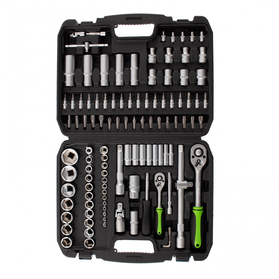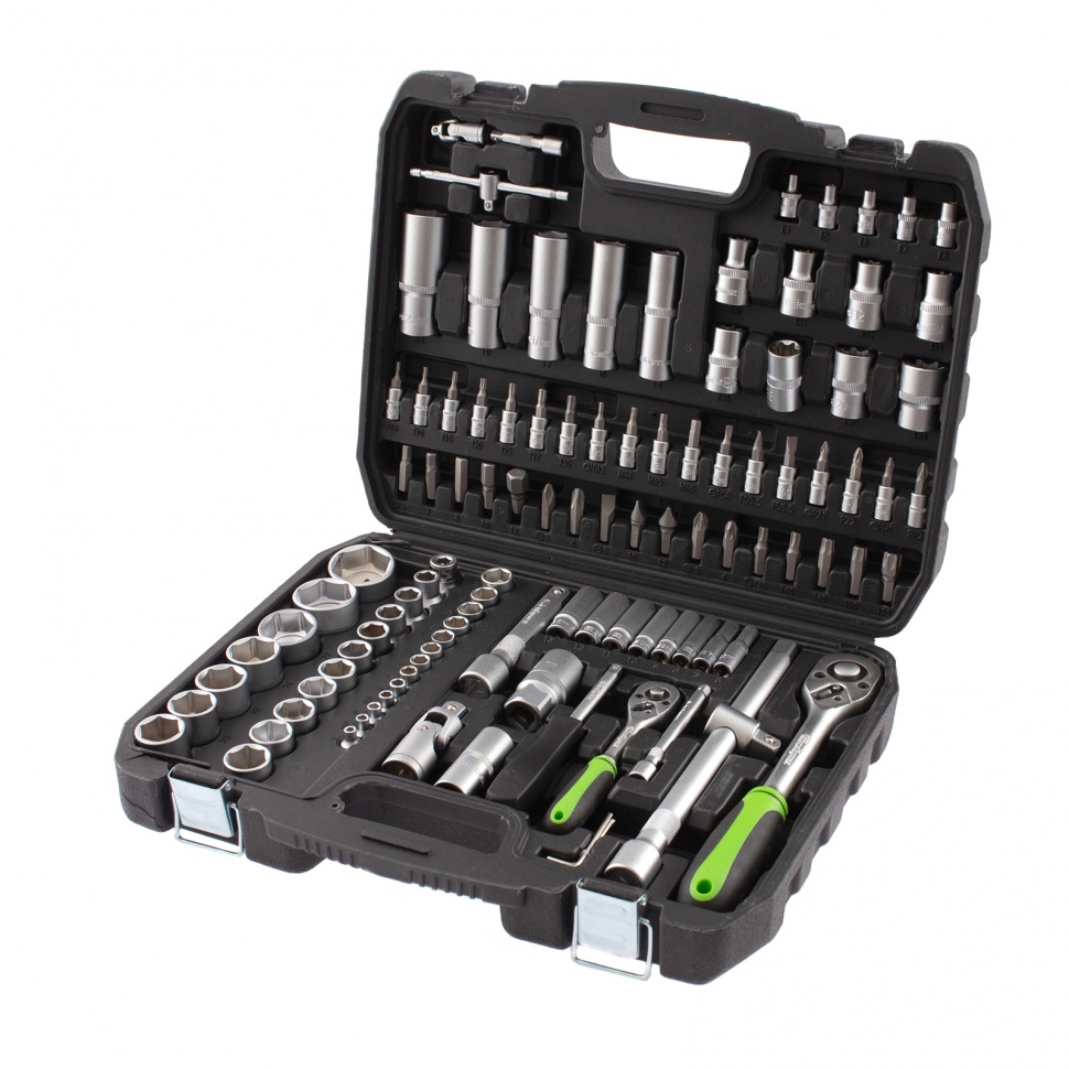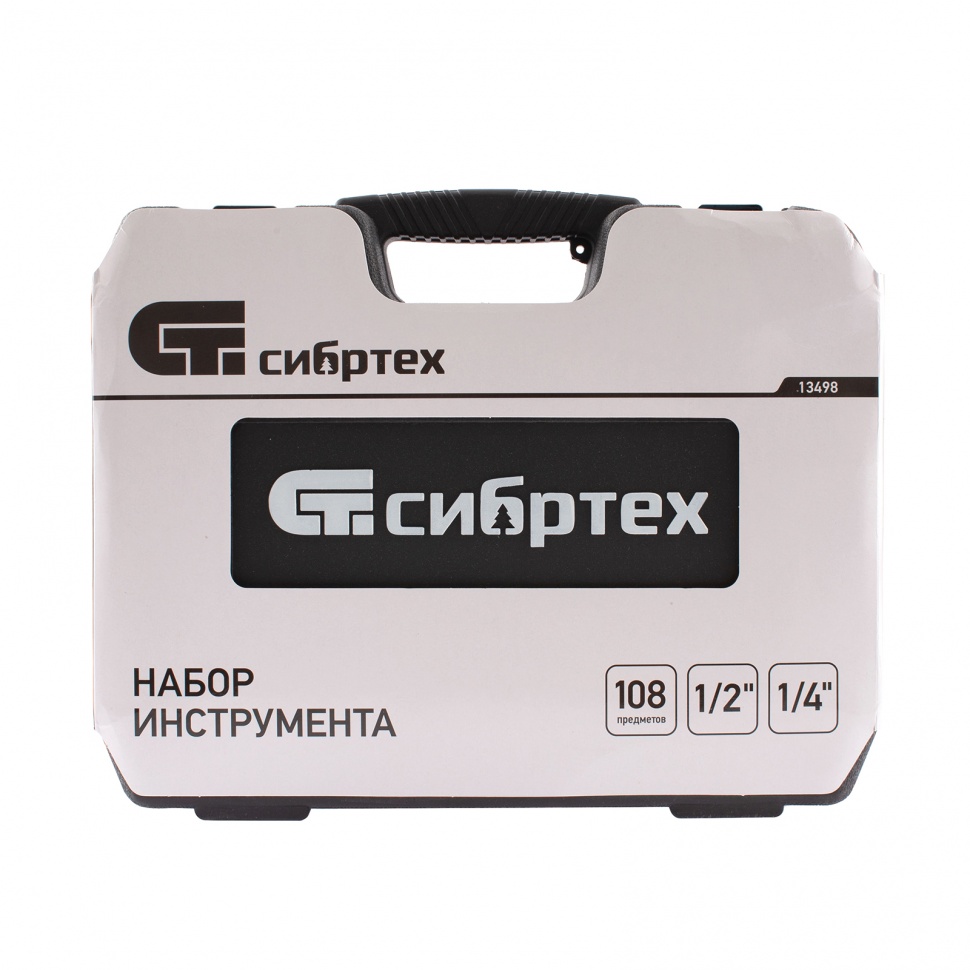 Набор инструмента Сибртех 13498 состоит из 108 предметов с присоединительными размерами 1/2"" и 1/4"". Предназначен для ремонта и обслуживания автомобилей, а также выполнения бытовых работ. Имеющиеся в комплекте насадки рассчитаны на крепеж с различными типами профилей и шлицев, включая HEX и TORX. Набор будет полезен автолюбителю и профессиональному мастеру.ПреимуществаПрочность — все элементы набора изготовлены из инструментальной стали и выдерживают активное использование.Защита от разрушения — инструменты имеют матовое антикоррозийное покрытие, увеличивающее срок их службы.Быстрый переход от монтажа к демонтажу — флажковые переключатели на трещоточных ключах позволяют мгновенно менять направление вращения.Комфортная работа в ограниченном пространстве — шаг трещоток с 45 зубцами составляет всего 8°.Удобная работа в труднодоступных местах — в набор входят удлинители, карданы и удлиненные торцевые головки.Продуманное хранение и транспортировка — набор упакован в кейс из ударопрочного пластика, закрывающийся на металлические застежки.