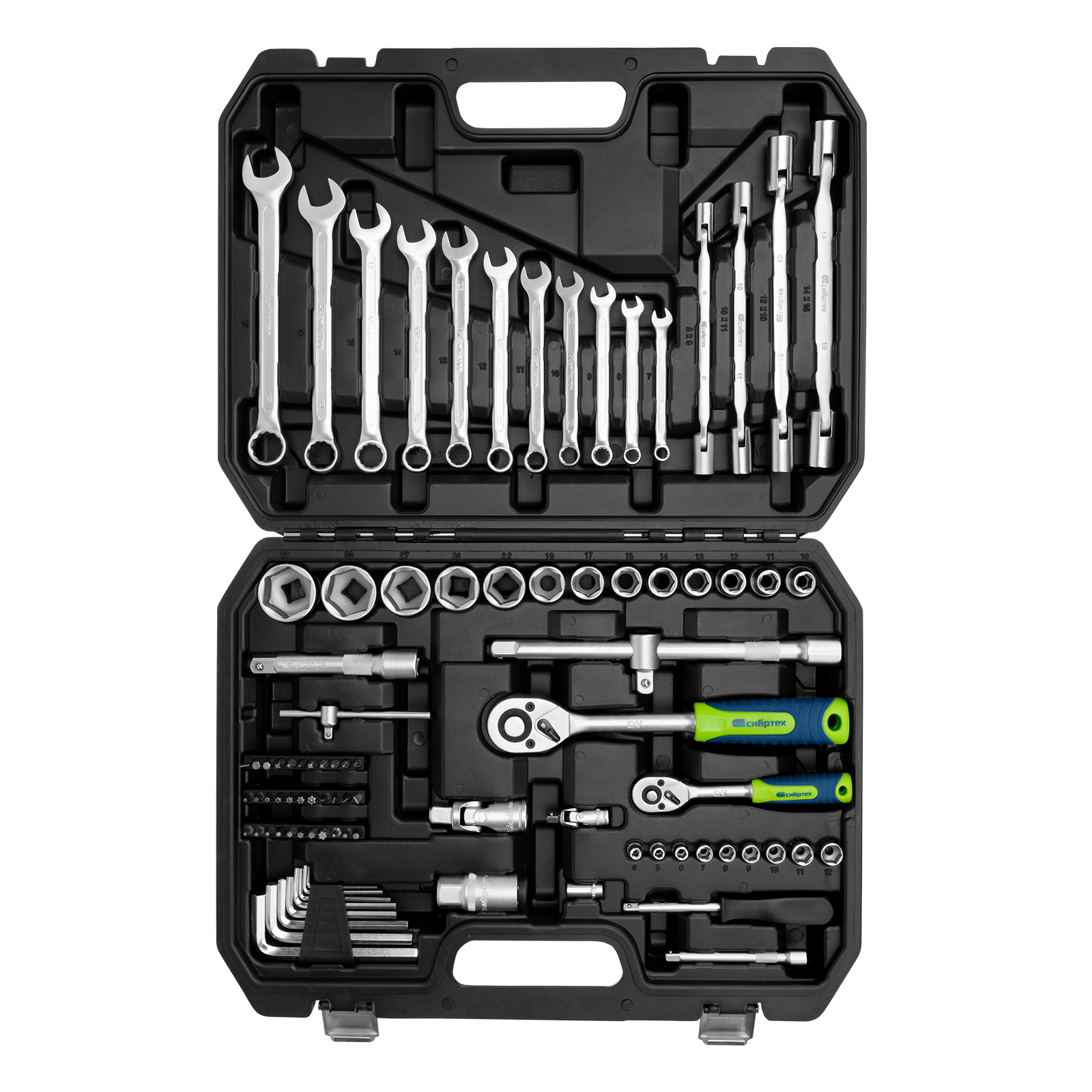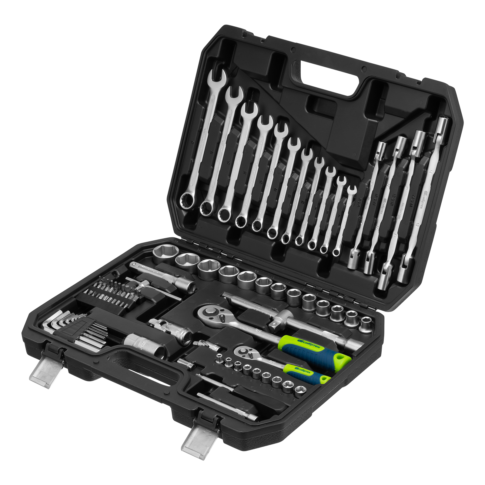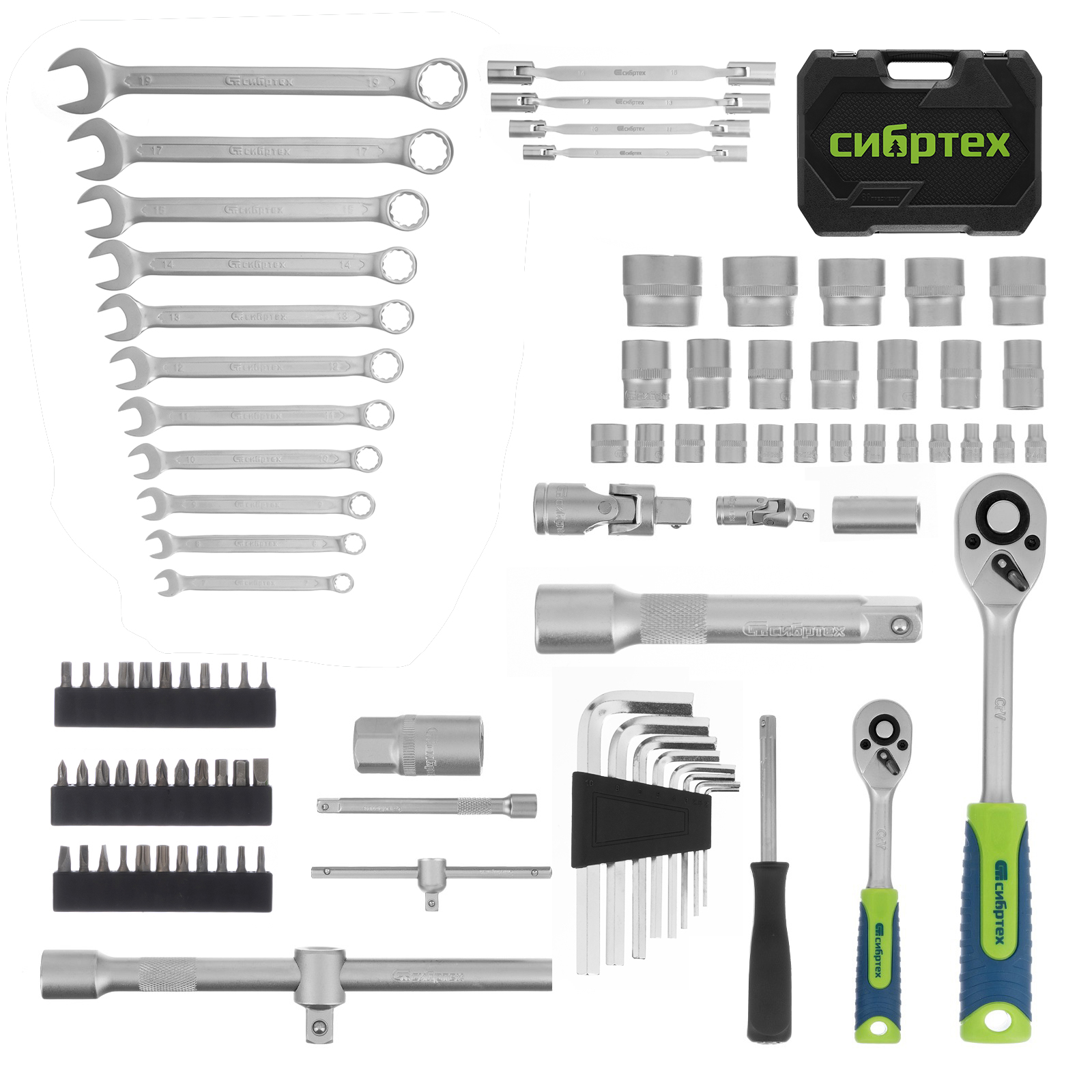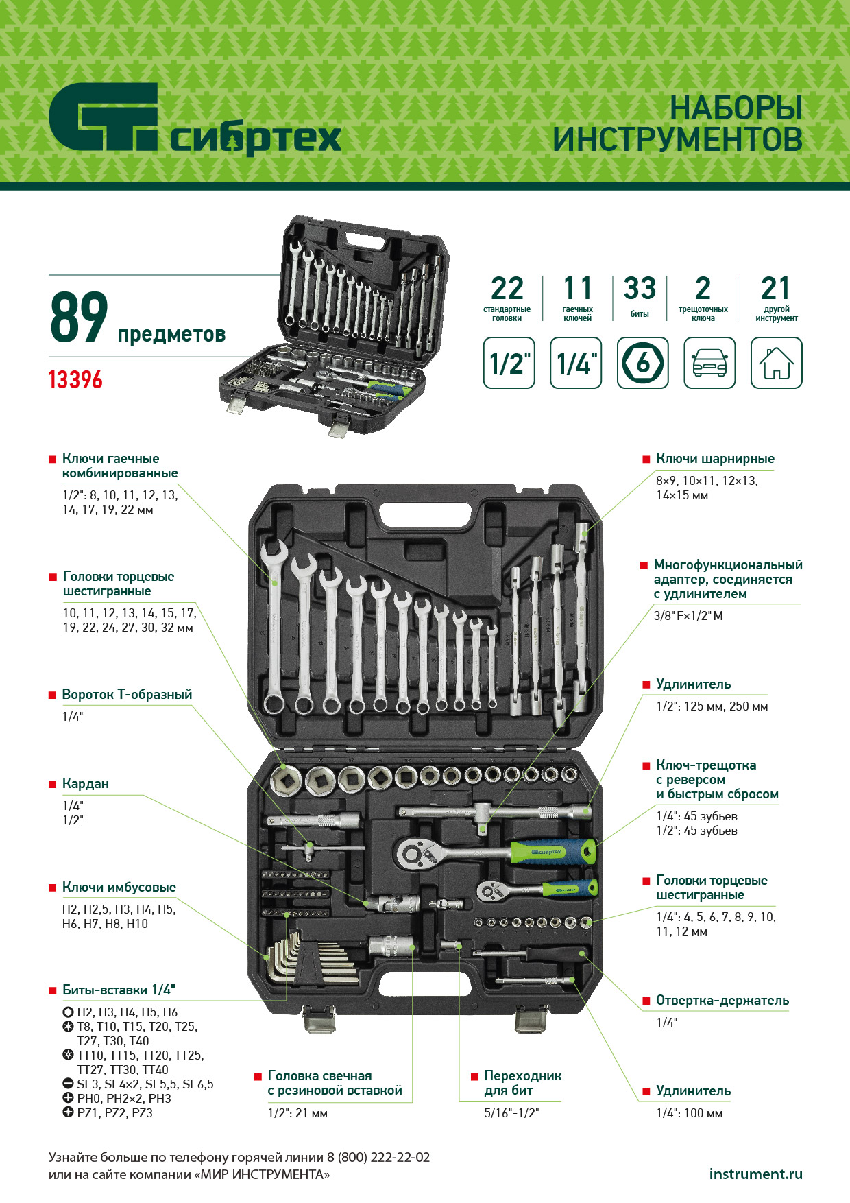 Набор инструментов Сибртех 13396 упакован в пластиковый кейс и состоит из 89 предметов с присоединительным размером 1/2"" и 1/4"", предназначенных для монтажа и демонтажа резьбового крепежа с разными типами шлицев. В комплект поставки входят карданы, удлинители и шарнирные ключи, облегчающие работу в труднодоступных местах. Набор используется для ремонта автомобилей, а также полезен в быту.Преимущества Износостойкость — элементы набора изготовлены из высокопрочной стали. Надежная защита от коррозии — на инструменты нанесено матовое хромовое покрытие. Комфортная и эффективная работа — ключи-трещотки с 45 зубьями оснащены механизмом быстрого сброса, переключателем реверса с металлическим флажком и двухкомпонентной рукояткой. Прочная фиксация — шариковый замок на трещотках, воротках, шарнирах и удлинителях надежно удерживает головки. Удобное хранение и транспортировка — инструменты и насадки упакованы в ударопрочный пластиковый кейс с металлическими замками.