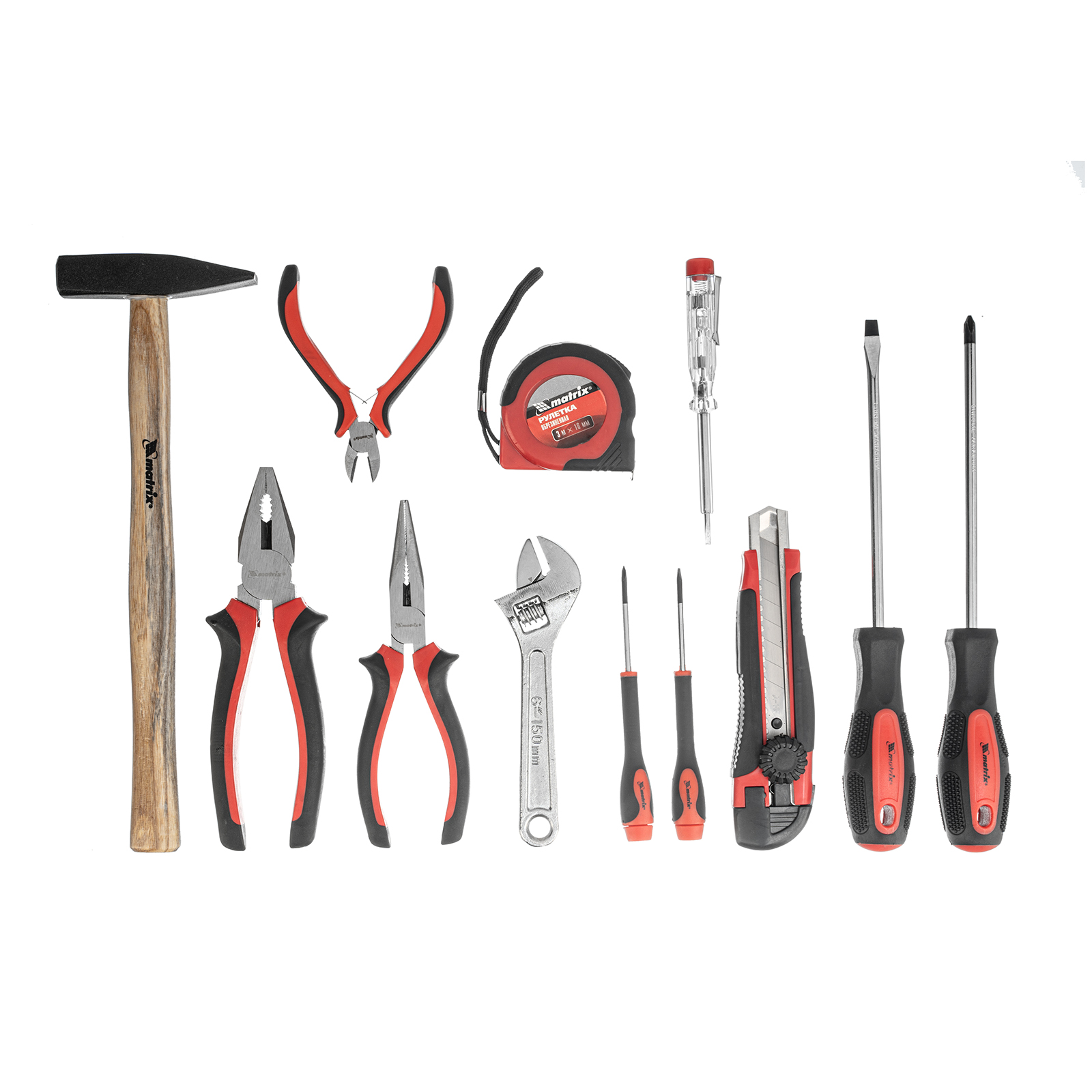 Набор Matrix 13562, 12 предметов, будет полезен как частным мастерам, так и профессионалам для проведения слесарно-монтажных работ. Он включает отвертки для монтажа/демонтажа резьбовых соединений, в том числе и мелких, разводной ключ для болтов и гаек, нож для резки плотных материалов, рулетку для проведения замеров, молоток, кусачки, и тестер напряжения.ПреимуществаНадежность и прочность — все детали набора сделаны из инструментальной стали, рабочие части прошли закалку.Удобство работы — инструменты оснащены двухкомпонентными рукоятками, рукоятка молотка выполнена из древесины и покрыта защитным лаком.Безопасность — на длинногубцах и пассатижах имеются ограничительные упоры, препятствующие соскальзыванию руки.Сегментированное лезвие — нож долго сохраняет режущую способность, затупившиеся сегменты легко отламываются.Фиксация на запястье — на рулетке имеется небольшой ремешок.Тканевый пенал на молнии — при транспортировке и хранении детали набора не потеряются.
