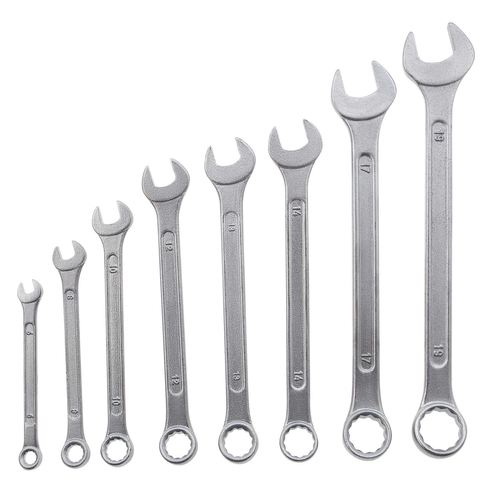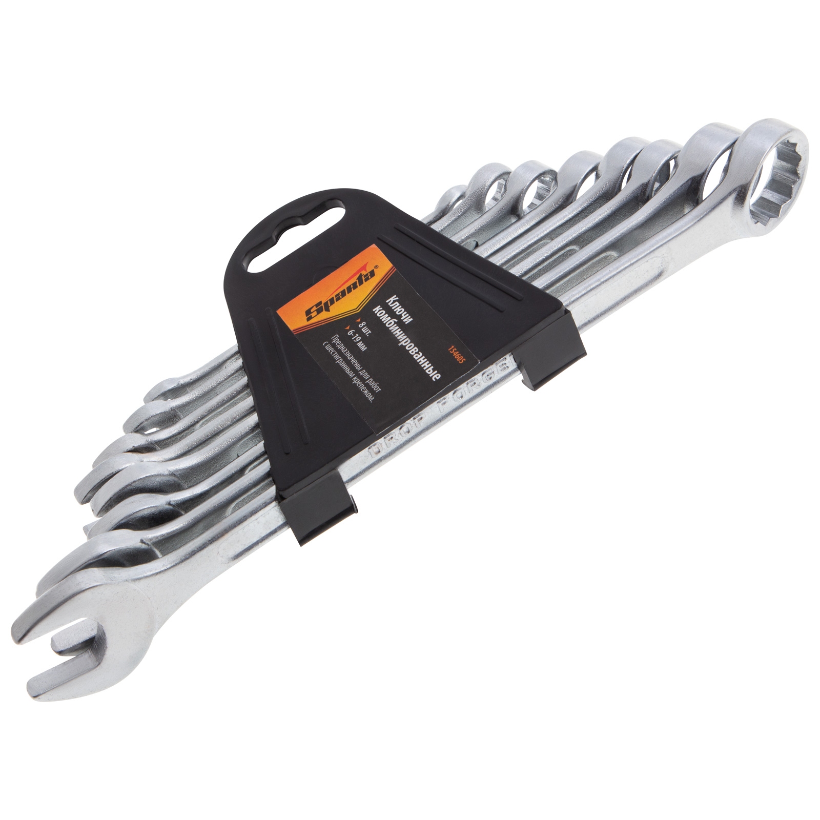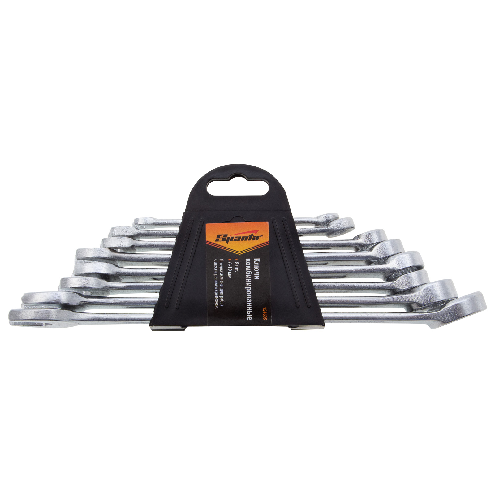 Набор хромированных комбинированных ключей Sparta 154605 состоит из 8 слесарно-монтажных инструментов для работы с резьбовыми соединениями размером от 6 до 19 мм. 12-гранная накидная головка каждого ключа обеспечивает надежный контакт с поверхностью крепежа, а рожковый зев дает возможность работать там, где применение кольцевого затруднено. Ключи пригодятся в мастерской, гараже, будут полезны во время строительства и ремонта.ПреимуществаКлючи изготовлены из углеродистой стали марки 45, чем обеспечивается их прочность и хороший ресурс.Твердость рабочих частей ключей составляет 42 HRC, это соответствует требованиям ГОСТ.Хромированная поверхность не подвержена коррозии, что продлевает срок службы инструментов.Кольцевые головки смещены на 15 градусов относительно плоскости ключей, это облегчает монтаж в труднодоступных местах.