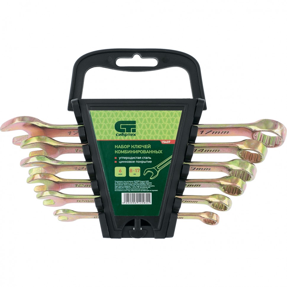 Набор комбинированных ключей Сибртех 15437 предназначен для проведения слесарно-монтажных работ с резьбовыми соединениями размером от 8 до 17 мм. Наличие рожкового и кольцевого зева делает каждый ключ универсальным в применении. Накидные головки с 12-гранным профилем надежно удерживают крепеж, уменьшая риск его деформации. Ключи будут полезны при проведении строительных и ремонтных работ, пригодятся для сборки и разборки оборудования, а также необходимы в быту.ПреимуществаПрочность — инструменты изготовлены из прочной углеродистой стали 45, рабочая часть каждого ключа закалена до твердости 42 HRC, что соответствует требованиям ГОСТ.Комфортная работа в труднодоступных местах — накидные головки расположены под углом 15° к плоскости ключей.Защита от повреждений и коррозии — на поверхность инструментов нанесено желтое цинковое покрытие.