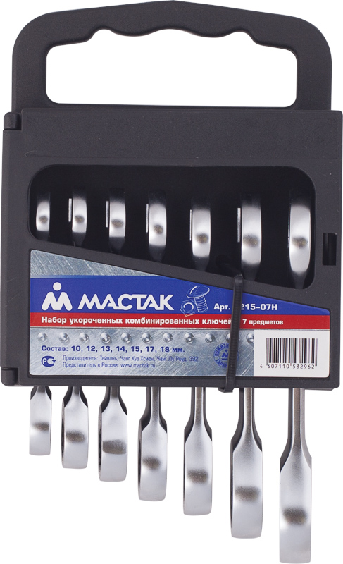 Набор комбинированных ключей с трещоткой МАСТАК 0215-07H содержит 7 предметов. Предназначены для выполнения любых видов работ с крепежом - как дома, так и в авто-слесарных мастерских, станциях технического обслуживания, на производстве.Ключи МАСТАК выполнены методом горячей ковки из инструментальной легированной хром-ванадиевой стали, что придает инструменту прочность и износостойкость . Трещоточный механизм для более быстрой и комфортной работы. Укороченный размер ключей позволяет совершать работы в местах с ограниченным пространством. Двенадцатигранный профиль накидной части отлично подойдет для работы с головками болтов и гайками как 6-ти, так и 12-тигранного профиля. В комплект входит: