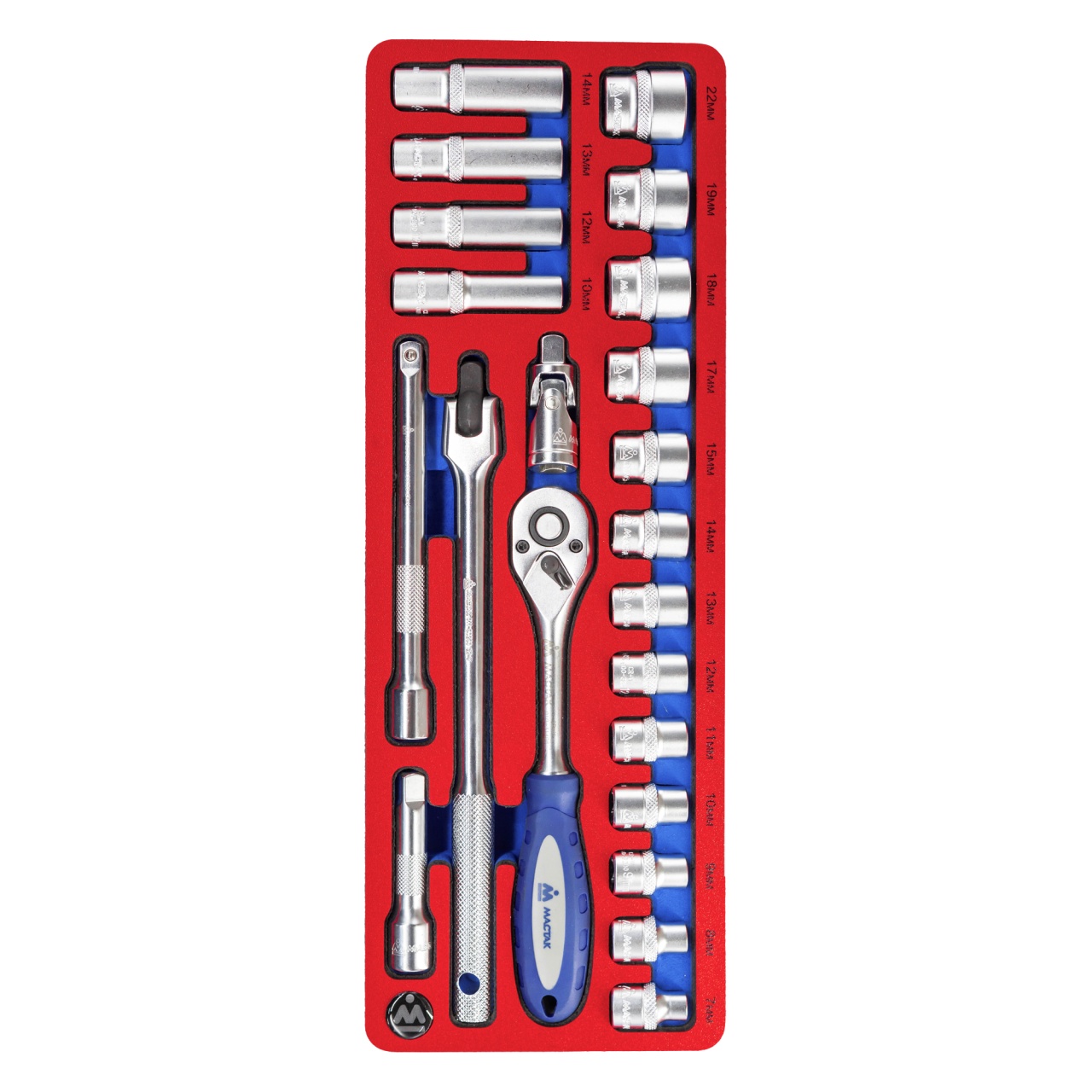 Материалы – инструментальные стали Cr-V, Cr-Mo, конструкционная сталь, хром, PP+TPR (рукоять трещотки), EVA+PP (ложемент)