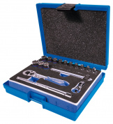 Материалы – инструментальная сталь Cr-V, хром, PP+TPR (рукоять трещотки), EVA (ложемент), пластик ABS (кейс)