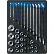 Набор укомплектован торцевыми головками и ключами по стандарту дюймовой размерности: такие размеры выражены долями частей дюйма. Дюймовый стандарт используется в технике американского производства.