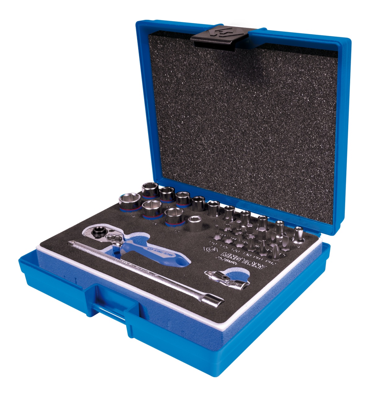 Материалы – инструментальная сталь Cr-V, хром, PP+TPR (рукоять трещотки), EVA (ложемент), пластик ABS (кейс)