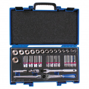 Материалы – инструментальная сталь Cr-V, хром, PP+TPR (рукоять трещотки), EVA (ложемент), пластик ABS (кейс)
