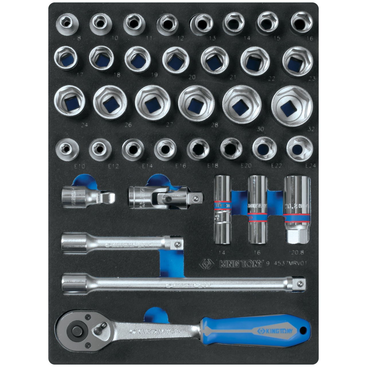 Материалы – инструментальные стали Cr-V, Cr-Mo, S2, конструкционная сталь, хром, PP+TPR (рукояти отверки, трещотки), EVA (ложемент)