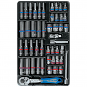 Материалы – инструментальные стали Cr-V, Cr-Mo, конструкционная сталь, хром, PP+TPR (рукоять трещотки), PVC (ложемент)