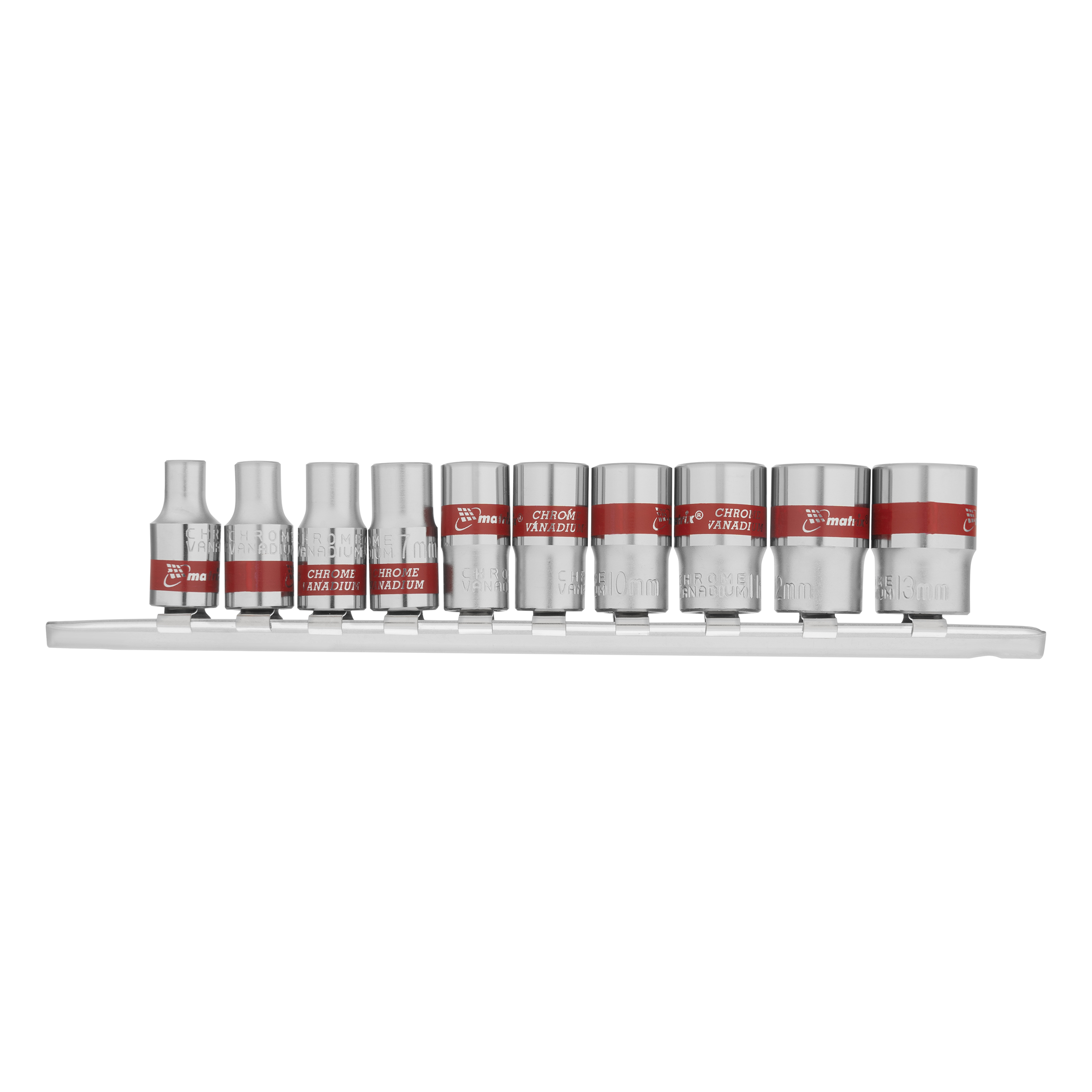 Набор торцевых головок Matrix 13559 из стали CrV, с посадочным гнездом 1/4"" и шестигранным профилем, включает 10 насадок диаметром 4-13 мм, предназначенных для работы с резьбовыми соединениями. Оптимален для работы с мелким крепежом. Пригодится для проведения бытового ремонта, будет полезен сантехнику, слесарю, авторемонтнику.ПреимуществаПрочность — торцевые головки из хромованадиевой стали выдерживают повышенные нагрузки.Коррозионная стойкость — на головки нанесено полированное хромоникелевое покрытие.Быстрый поиск нужной насадки — каждая торцевая головка маркирована ярко-красной полоской и имеет обозначение типоразмера.Удобное хранение — для головок предусмотрена плашка-держатель, поэтому они всегда будут под рукой и не потеряются.