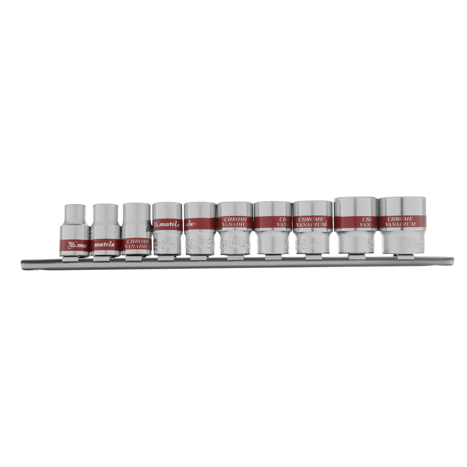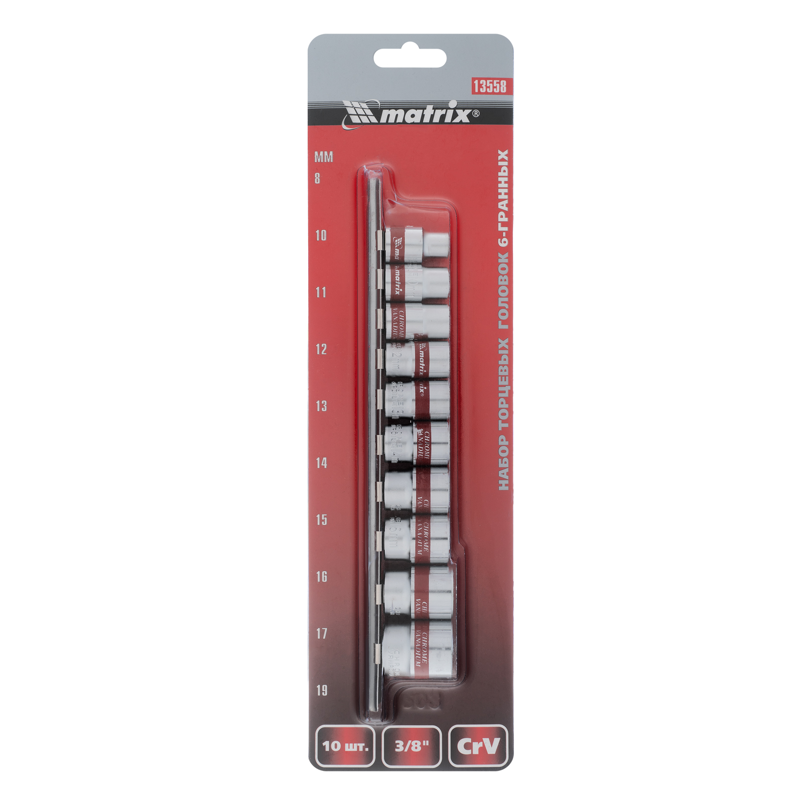 Набор торцевых головок Matrix 13558 из стали CrV, с посадочным гнездом 3/8"" и шестигранным профилем, включает 10 насадок диаметром 8-19 мм, предназначенных для работы с резьбовыми соединениями. Пригодится для проведения бытового ремонта, будет полезен сантехнику, слесарю, авторемонтнику.ПреимуществаУниверсальность — в комплект входят насадки самых распространенных размеров.Прочность — торцевые головки из хромованадиевой стали выдерживают повышенные нагрузки.Коррозионная стойкость — на головки нанесено полированное хромоникелевое покрытие.Быстрый поиск нужной насадки — каждая торцевая головка маркирована ярко-красной полоской и имеет обозначение типоразмера.Удобное хранение — для головок предусмотрена плашка-держатель, поэтому они всегда будут под рукой и не потеряются.
