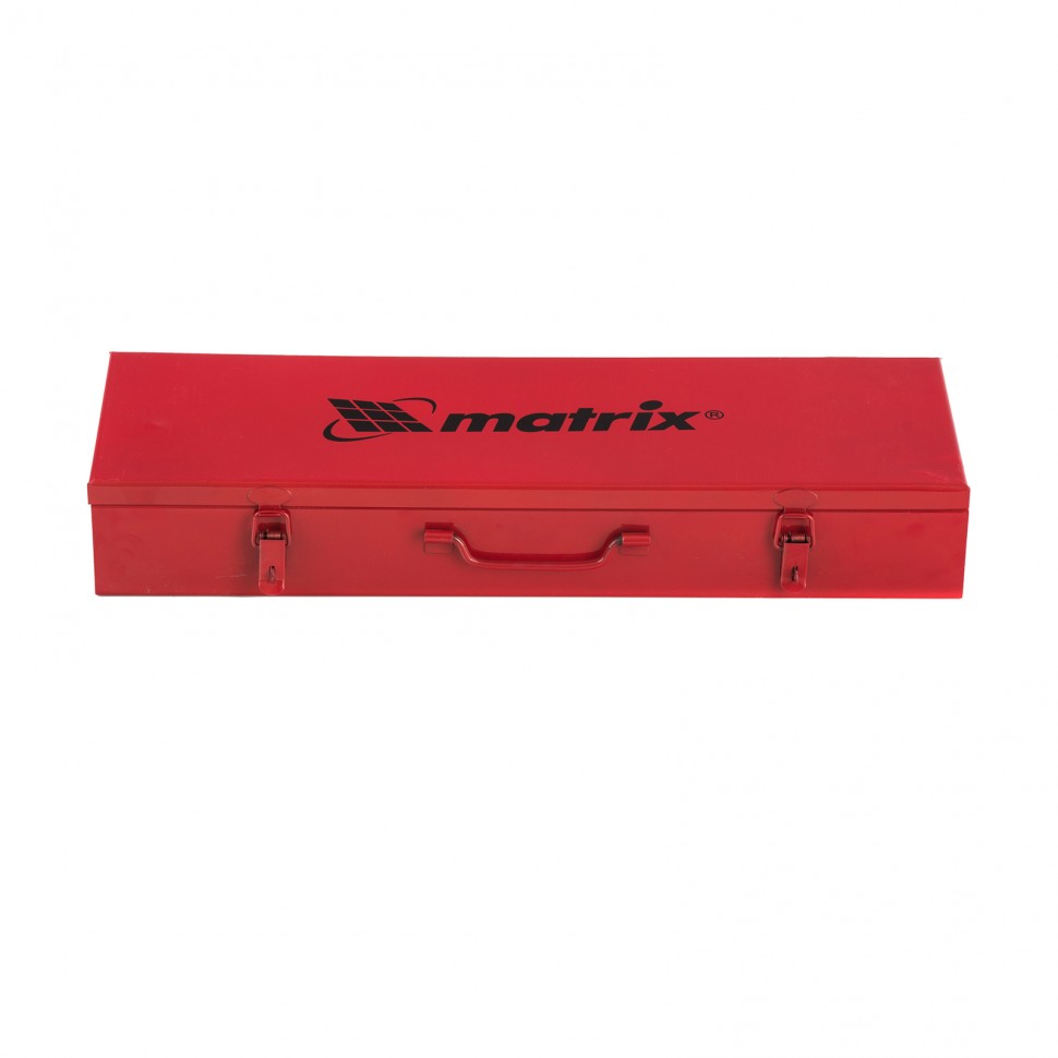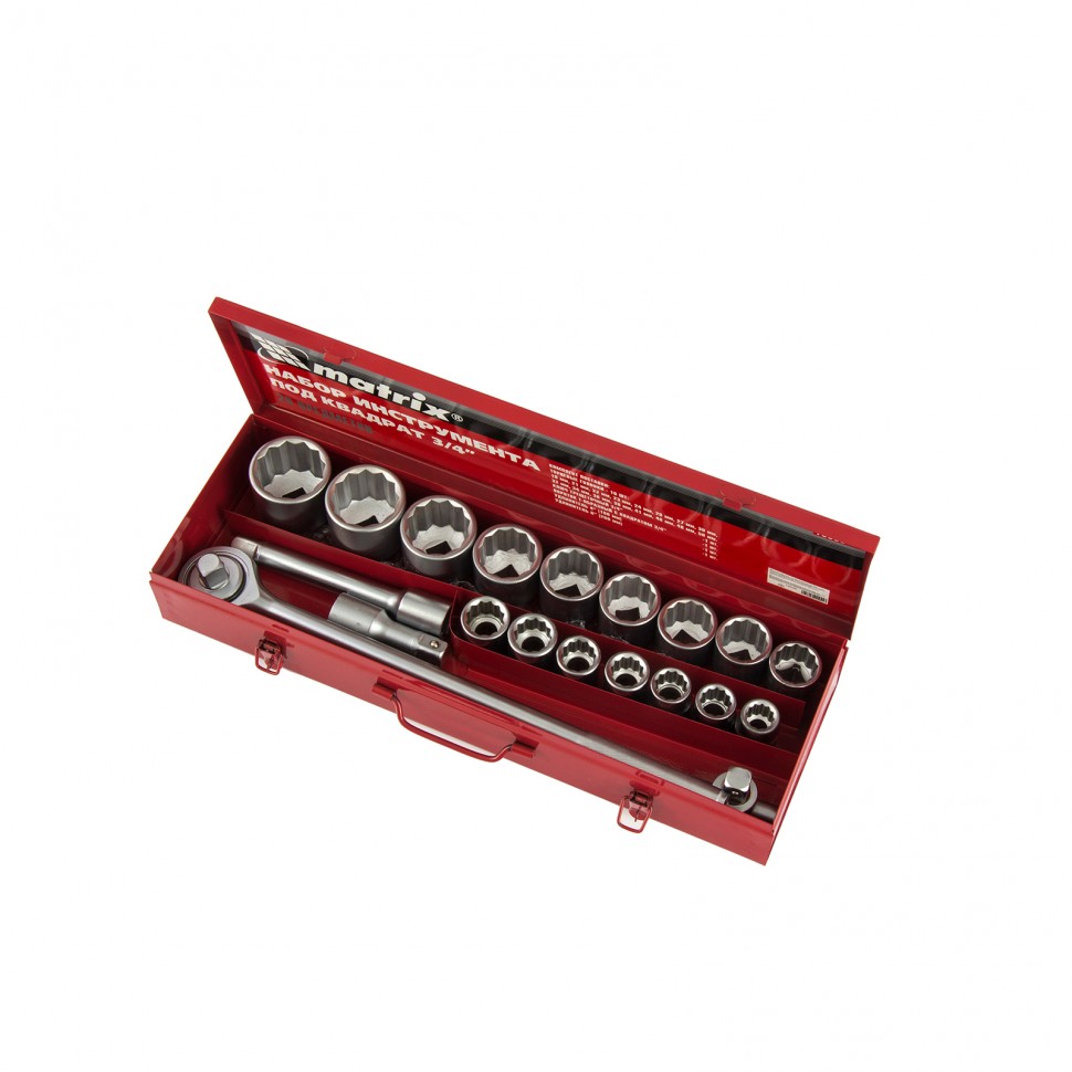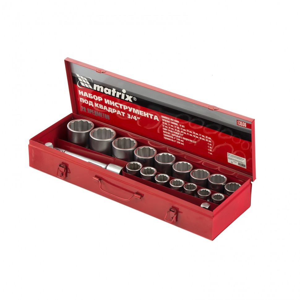 Набор торцевых головок Matrix 13536 с присоединительным квадратом 3/4"" и 12-гранным профилем используется для работы с резьбовыми крепежными элементами размером от 19 до 50 мм. Применяется для ремонта и обслуживания автобусов и грузовых автомобилей.ПреимуществаПрочность и износостойкость — инструменты изготовлены из хромованадиевой стали с хромовым покрытием.Удобная работа в труднодоступных местах — в комплект поставки входит трещоточный ключ, вороток и удлинители 100 и 200 мм.Надежная упаковка — набор поставляется в металлическом кейсе с ручкой, удобном для хранения и транспортировки.