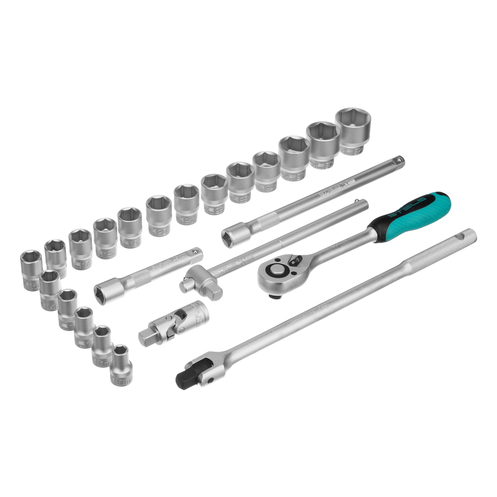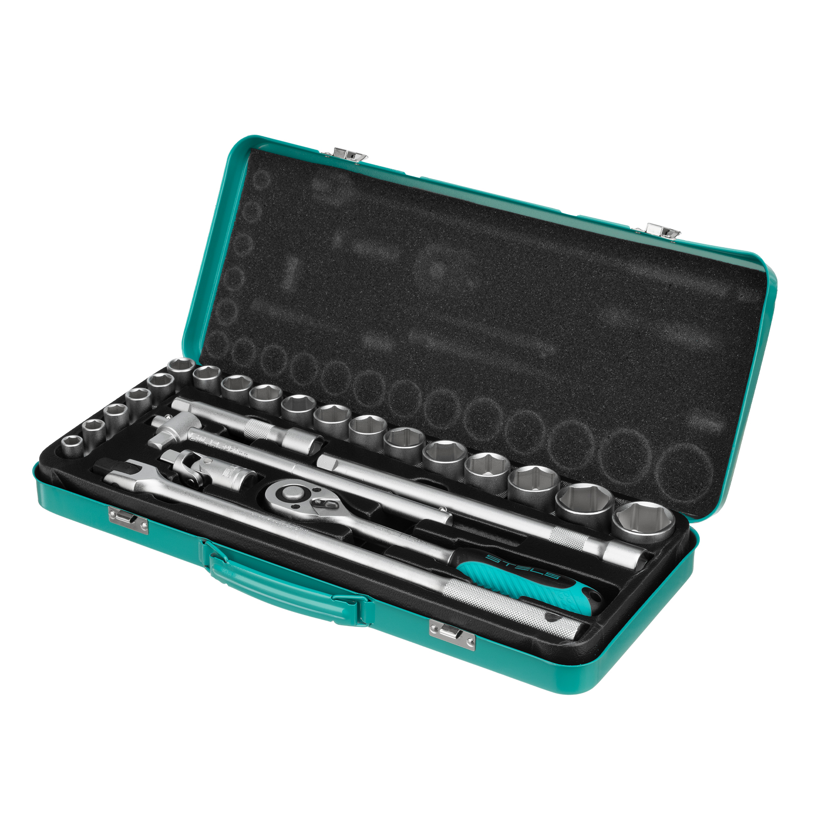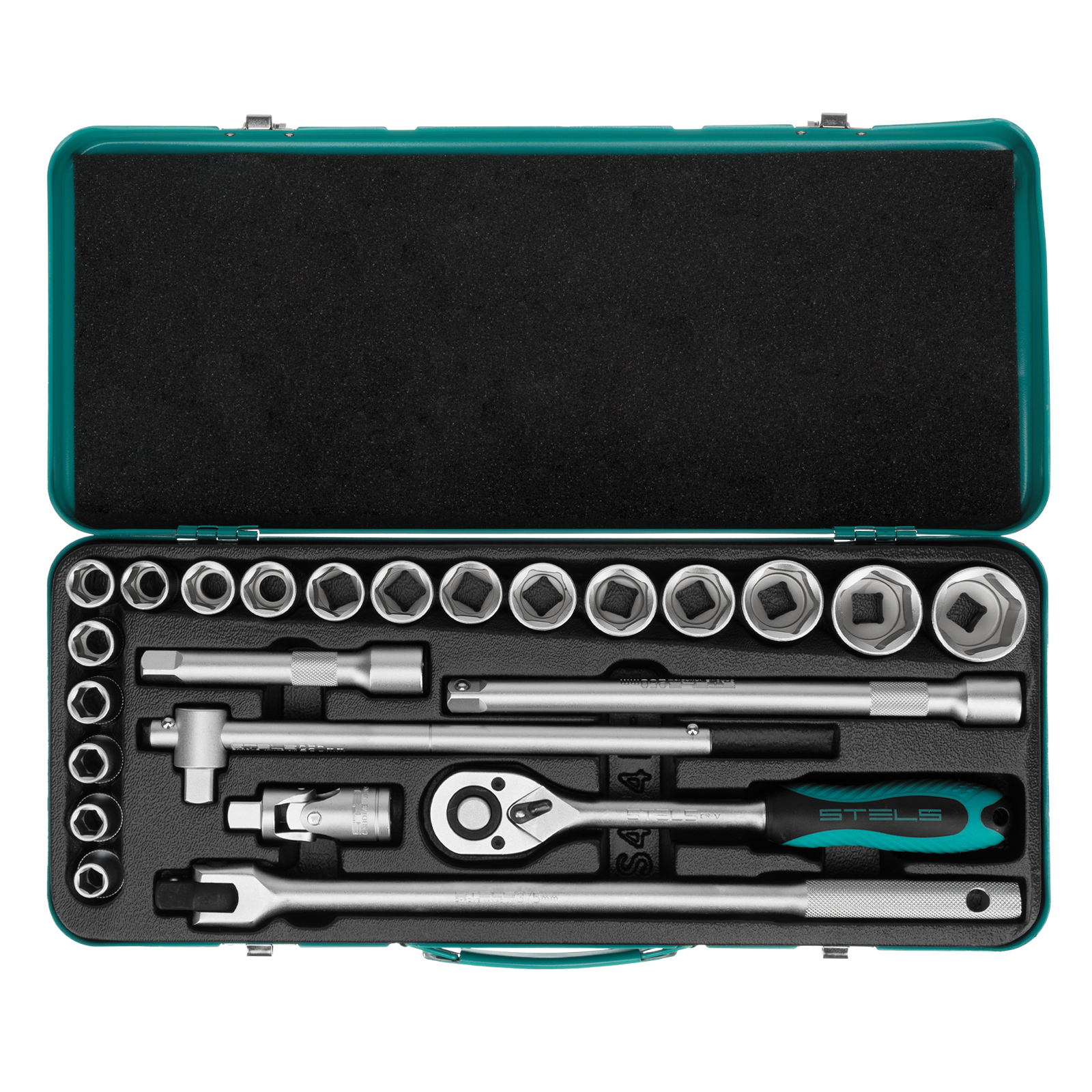Шоферский набор Stels 13578 с присоединительным квадратом 1/2 дюйма включает в себя 24 предмета. Он станет незаменимым помощником для специалистов СТО и автолюбителей, пригодится в гараже, поездке, а также дома и на даче.ПреимуществаУдобная работа в труднодоступных местах — трещотка с 72 зубьями позволяет вращать крепеж плавно и мягко.Прочность — инструменты выполнены из термически обработанной инструментальной стали.Встроенный механизм сброса — снятие и установка насадки занимает несколько секунд.Металлические фиксаторы — насадки крепко держатся и не слетают во время работы.Комфортная работа — эргономичная двухкомпонентная рукоятка не выскальзывает из ладони.Удобное хранение и транспортировка — набор поставляется в надежном металлическом кейсе с ложементом.Высокое качество — инструменты изготовлены под строгим технологическим контролем, на торцевые головки размером от 8 мм распространяется пожизненная гарантия производителя.