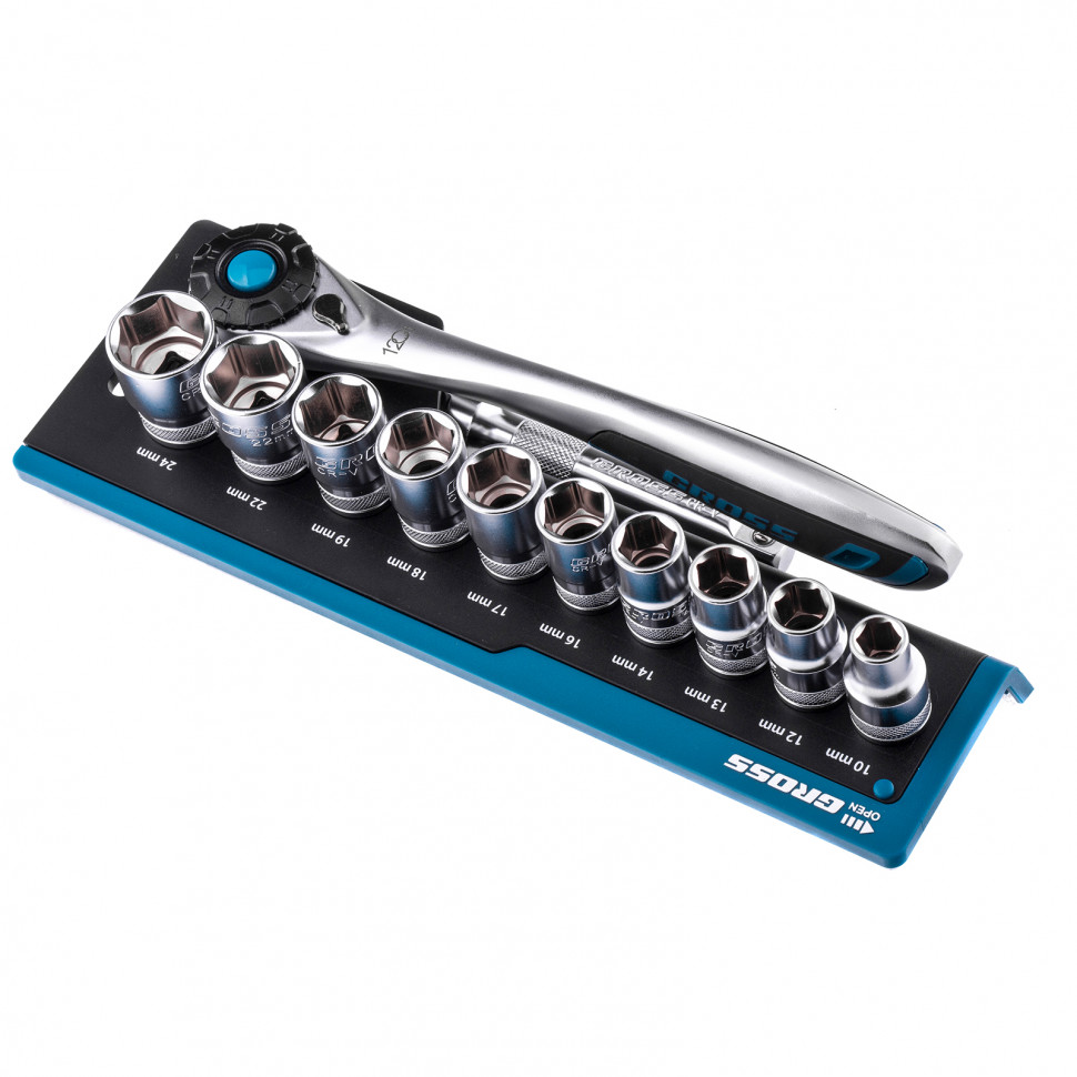 Набор Gross 14138 включает в себя 12 предметов из стали CrV-группы с посадочным квадратом 1/2 дюйма: 10 торцевых головок, трещотку со 120 зубьями и удлинитель 100 мм. Применяется для монтажа и демонтажа резьбовых соединений при проведении технического обслуживания авто или для бытовых ремонтных работ. Набор подходит не только для самостоятельного использования в гараже и дома, но и для профессиональной эксплуатации на станциях техобслуживания.ПреимуществаПрочность и высокий ресурс — инструменты выполнены из качественной стали хромованадиевой группы.Удобная работа в труднодоступных местах — цельнокованная трещотка со 120 зубьями позволяет вращать крепеж максимально плавно и мягко.Функция быстрого сброса — снять оснастку с трещотки можно одним движением.Наличие реверса — можно быстро менять направление вращения трещотки для легкого перехода от монтажа к демонтажу крепежей.Удобное размещение на стенде — набор инструментов комплектуется подвесной картой.