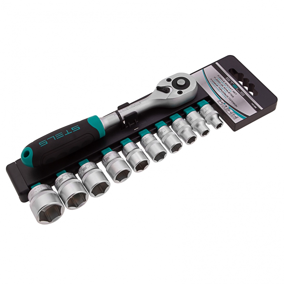 Набор Stels 14126 из стали CrV включает в себя 11 предметов: торцевые головки 7-22 мм с присоединительным размером 3/8 дюйма и трещоточный ключ. Он используется для закручивания и откручивания крепежных элементов, пригодится при ремонте крупногабаритной техники и обслуживании авто. Инструменты выдерживают высокие нагрузки и могут использоваться в ограниченном пространстве.ПреимуществаВысокий ресурс — корпус трещотки и головок изготовлен из хромованадиевой стали.Защита от коррозии — на металлические части нанесено матовое хромоникелевое покрытие.Плавное вращение — трещотка с 72 зубьями удобна для работы в труднодоступных местах.Механизм быстрого сброса — можно легко менять насадки для переключения между задачами.Надежная фиксация оснастки — присоединительный квадрат трещотки оснащен шариковым держателем.Комфортная работа — двухкомпонентная эргономичная рукоятка надежно лежит в руке.Удобное хранение — набор поставляется с компактным пластиковым держателем.