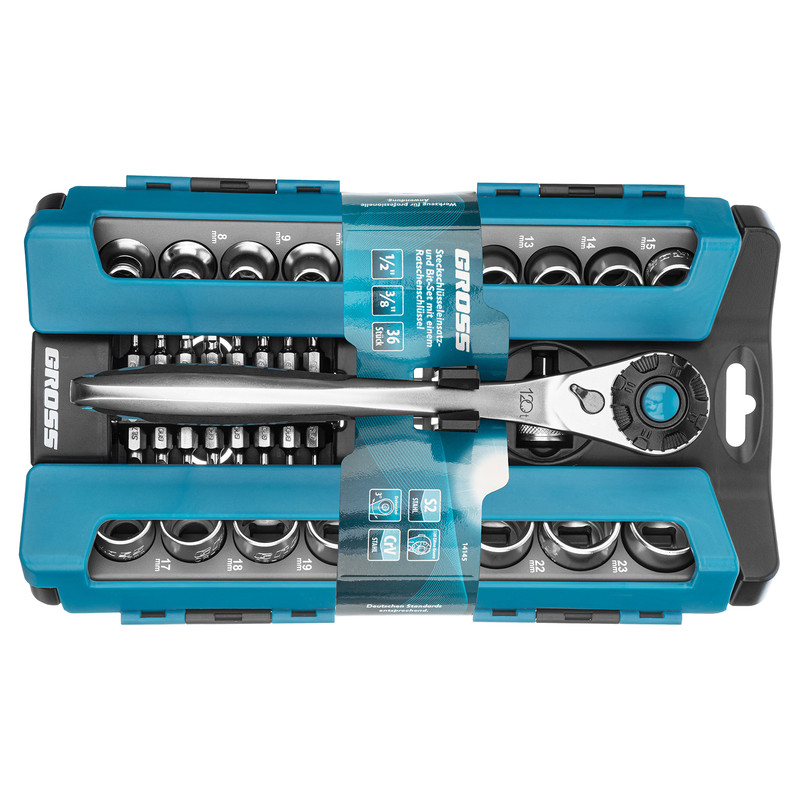 Набор Gross 14145 включает в себя 36 предметов из стали CrV-группы с посадочным квадратом 1/2 и 3/8 дюйма: 17 торцевых головок, трещотку со 120 зубьями, переходник, адаптер и 16 бит. Применяется для монтажа и демонтажа резьбовых соединений при проведении технического обслуживания авто или для бытовых ремонтных работ. Набор подходит не только для самостоятельного использования в гараже и дома, но и для профессиональной эксплуатации на станциях техобслуживания.ПреимуществаПрочность и высокий ресурс — инструменты выполнены из качественной стали хромованадиевой группы.Удобная работа в труднодоступных местах — цельнокованная трещотка со 120 зубьями позволяет вращать крепеж максимально плавно и мягко.Функция быстрого сброса — снять оснастку с трещотки можно одним движением.Наличие реверса — можно быстро менять направление вращения трещотки для легкого перехода от монтажа к демонтажу крепежей.Удобное хранение и транспортировка — набор поставляется в прочном пластиковом боксе.