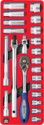 Набор фирмы МАСТАК 5-003222 с присоединительным квадратом 3/8" содержит 22 предмета. Набор отлично подойдет для автослесарной мастерской, станции технического обслуживания или производственного цеха.Инструмент размещен в ложементе. Материал ложемента EVA (ЭВА, этиленвинилацетат). При своей лёгкости, этот материал обладает высокими прочностными характеристиками, стойкостью к маслам и растворителям, при деформации возвращает прежнюю форму. Изготовлен специально для комплектации передвижных инструментальных тележек . Инструмент изготовлен из закаленной хром-ванадиевой стали, что придает твердость и износостойкость. В комплект входит: