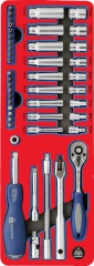 Набор фирмы МАСТАК 5-002045 с присоединительным квадратом 1/4" содержит 45 предметов. Набор отлично подойдет для автослесарной мастерской, станции технического обслуживания или производственного цеха.Инструмент размещен в ложементе. Материал ложемента EVA (ЭВА, этиленвинилацетат). При своей лёгкости, этот материал обладает высокими прочностными характеристиками, стойкостью к маслам и растворителям, при деформации возвращает прежнюю форму. Изготовлен специально для комплектации передвижных инструментальных тележек . Инструмент изготовлен из закаленной хром-ванадиевой стали, что придает твердость и износостойкость. В комплект входит: