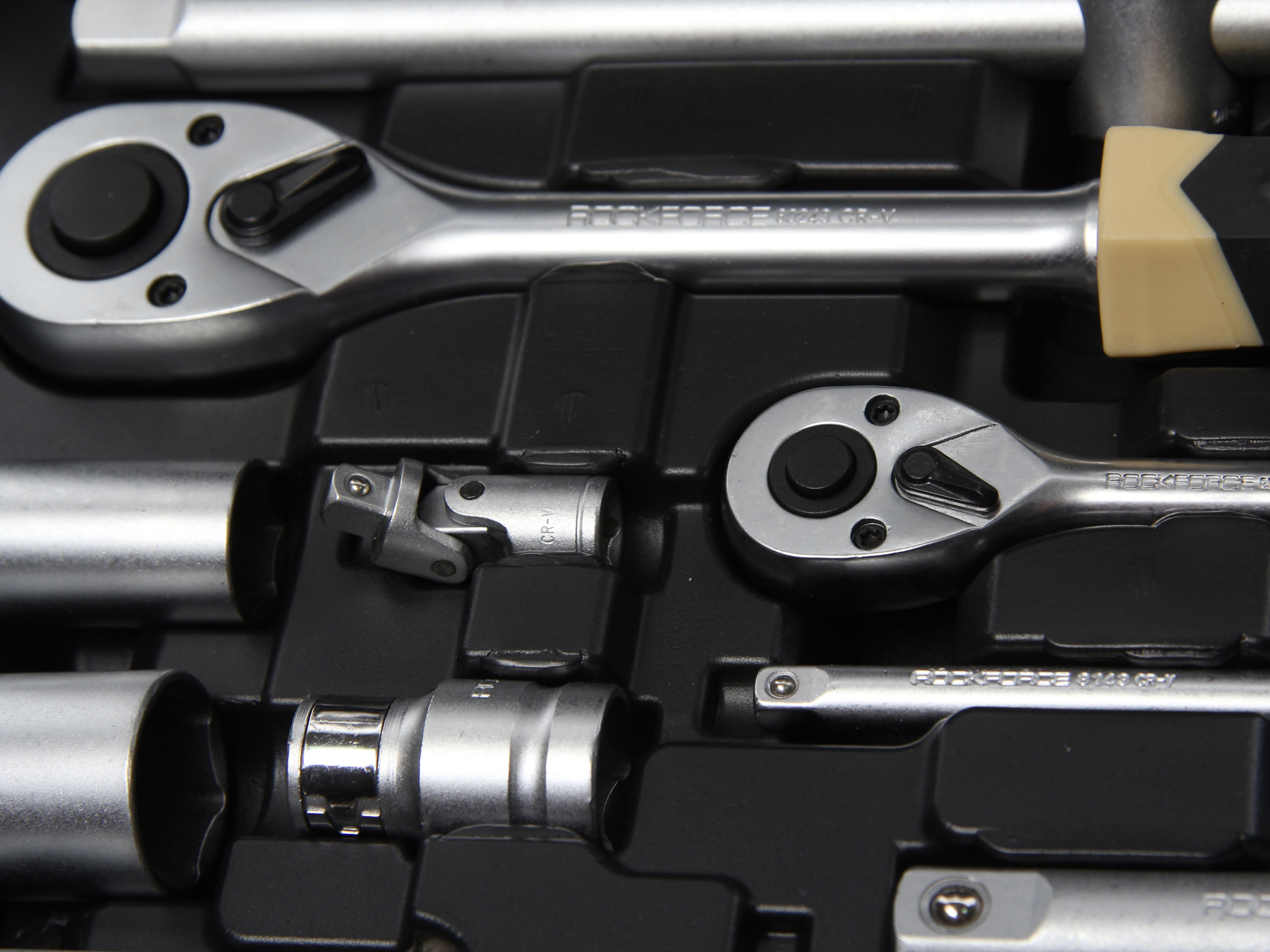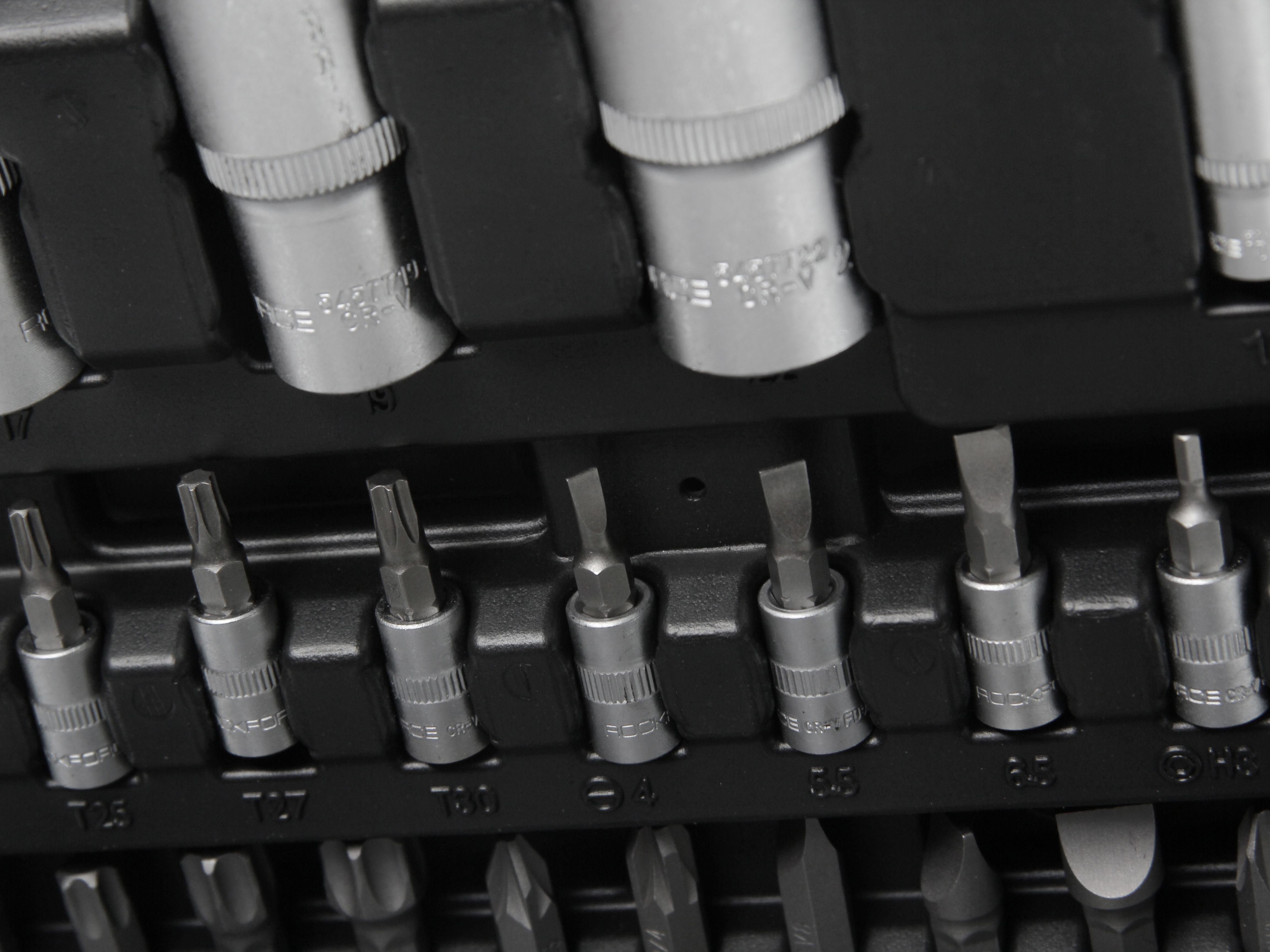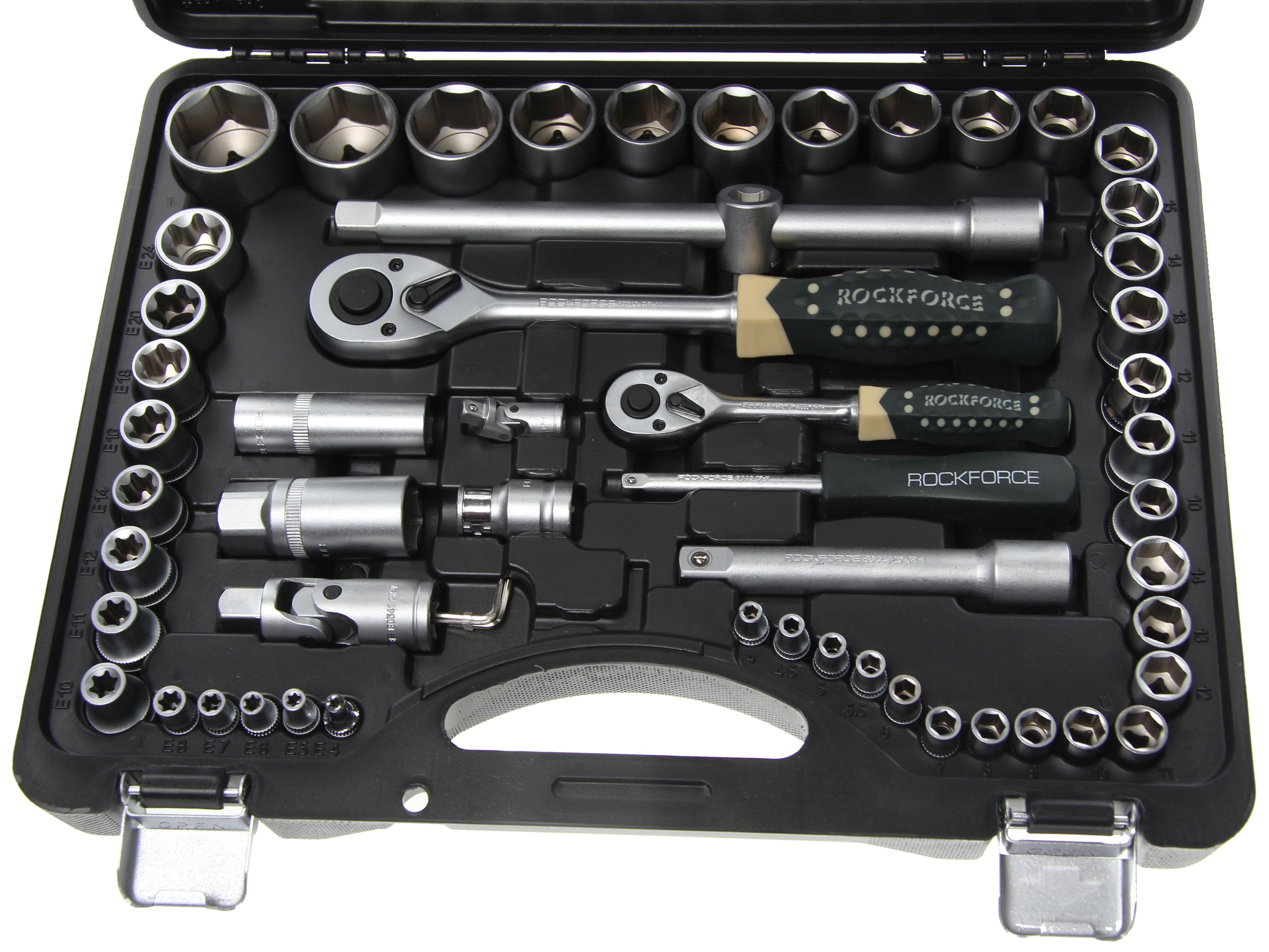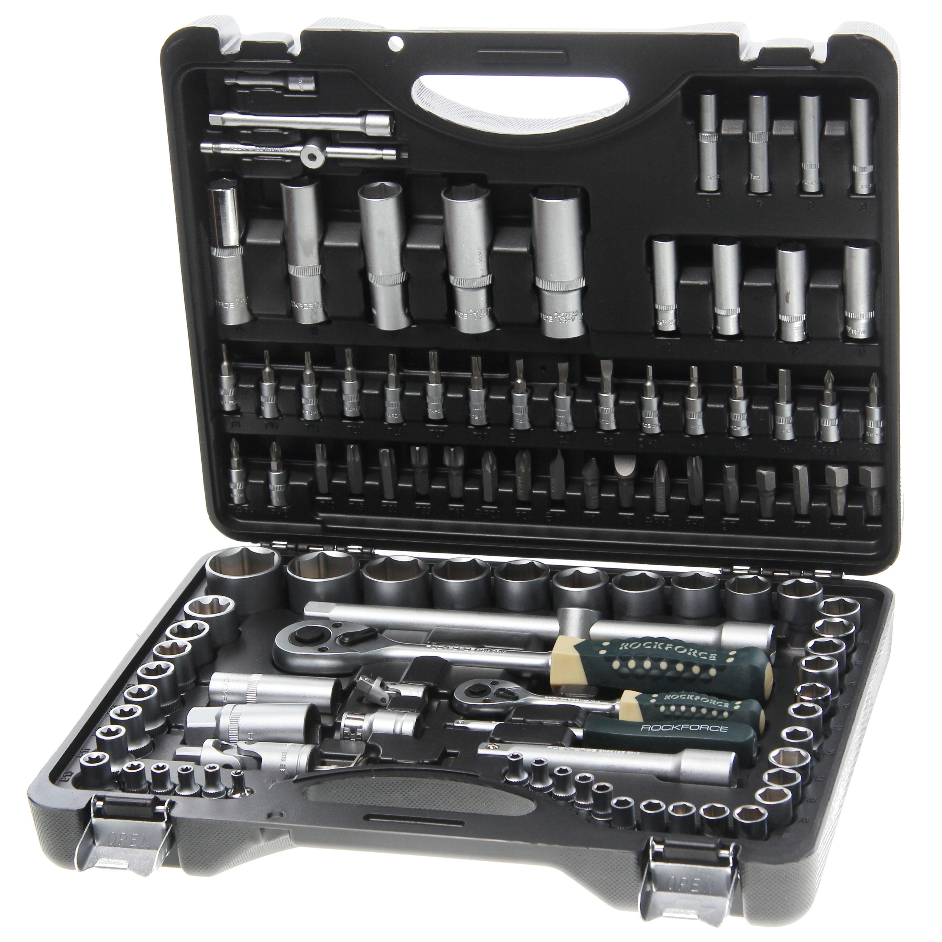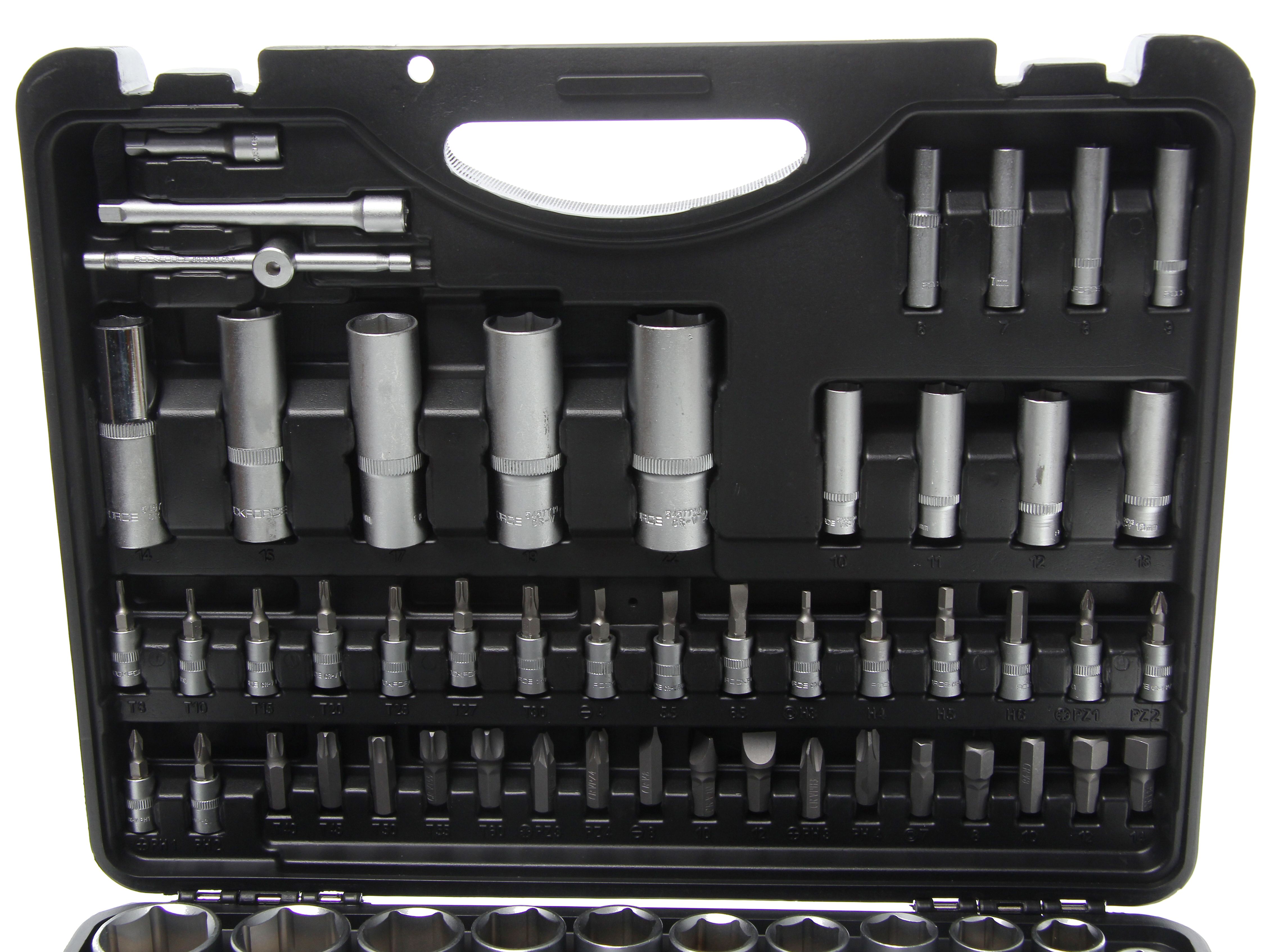 Посадочный квадрат: 1/2", 1/4". Тип головок: 6-гранные, Е-профиль, короткие, глубокие. Комплектация: головки 1/4"короткие 25 мм: 4, 4.5, 5, 5.5, 6, 7, 8, 9, 10, 11, 12, 13, 14 мм; головки 1/4"глубокие 50 мм: 6, 7, 8, 9, 10, 11, 12, 13 мм; головки 1/4"Е-профиль короткие 25 мм: Е4, Е5, Е6, Е7, Е8; головки-биты 1/4"HEX 35 мм: 3, 4, 5, 6 мм; головки-биты 1/4"TORX 35 мм: T8, T10, T15, T20, T25, Т27, T30; головки-биты 1/4"SL 35 мм: 4, 5.5, 6,5; головки-биты 1/4"РН 35 мм: РН.1, РН.2; головки-биты 1/4"PZ 35 мм: PZ.1, PZ.2; трещотка 1/4"; рукоятка 1/4"150 мм; вороток Т-образный 1/4"115 мм; удлинители 1/4"50, 100 мм; кардан шарнирный 1/4"; биты 5/16"HEX 30 мм: 7, 8, 10, 12, 14 мм; биты 5/16"TORX 30 мм: Т40, Т45, Т50, Т55, Т60; биты 5/16"SL 30 мм: 8, 10, 12; биты 5/16"PH 30 мм: PH.3, PH.4; биты 5/16"PZ 30 мм: PZ.3, PZ.4; головки 1/2"короткие 38 мм: 10, 11, 12, 13, 14, 15, 16, 17, 18, 19, 20, 21, 22, 24, 27, 30, 32 мм ; головки 1/2"глубокие 77 мм: 14, 15, 17, 19, 22 мм; головки 1/2"Е-профиль короткие 38 мм: Е10, Е11, Е12, Е14, Е16, Е18, Е20, Е24; головки свечные 1/2": 16, 21 мм; трещотка 1/2"; удлинители 1/2": 125, 250 мм; кардан шарнирный 1/2"; адаптер усиленный с отверстием с 3/8"(F)*1/2"(M) ; битодержатель 1/2"(F)*5/16"(F); ключи Г-образные 6-гранные короткие: 1.5, 2, 2.5 мм. Пластиковый кейс с металлическими защелками