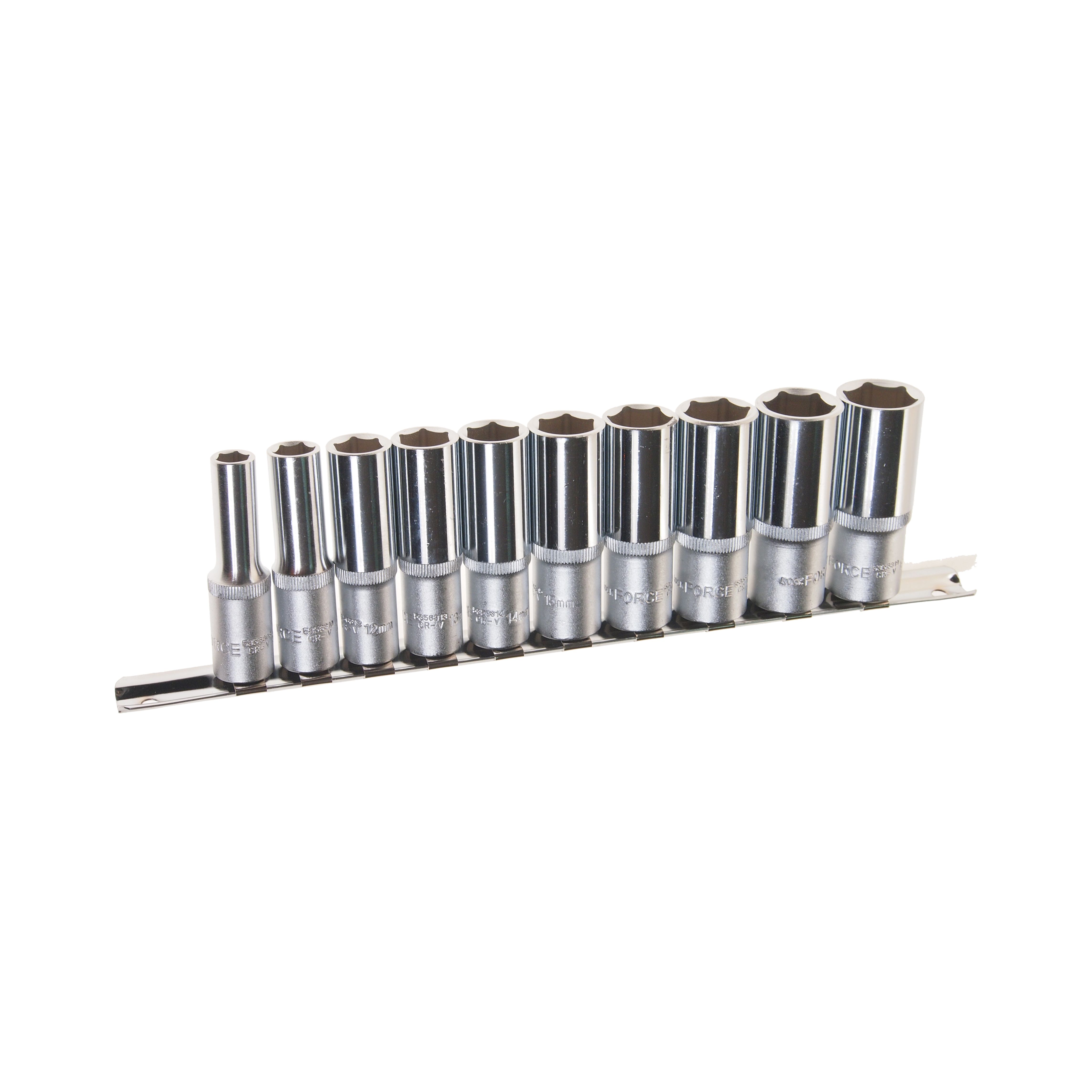 Набор торцевых головок RockForce: 3/8"DR 6-гранных глубоких на планке 10 предметов в наборе Набор предназначен для начального откручивания шестигранных крепежных изделий. Головки изготовлены из хром-ванадиевой стали высокого качества с полуматовым покрытием, что делает ее устойчивой к коррозии и износу. Удлиненные торцевые головки позволяют откручивать и закручивать болты, находящиеся в глубоких пазах. Изделие обладает большим рабочим ресурсом и выдерживает интенсивные нагрузки, поэтому его широко используют на производстве и в автосервисах.